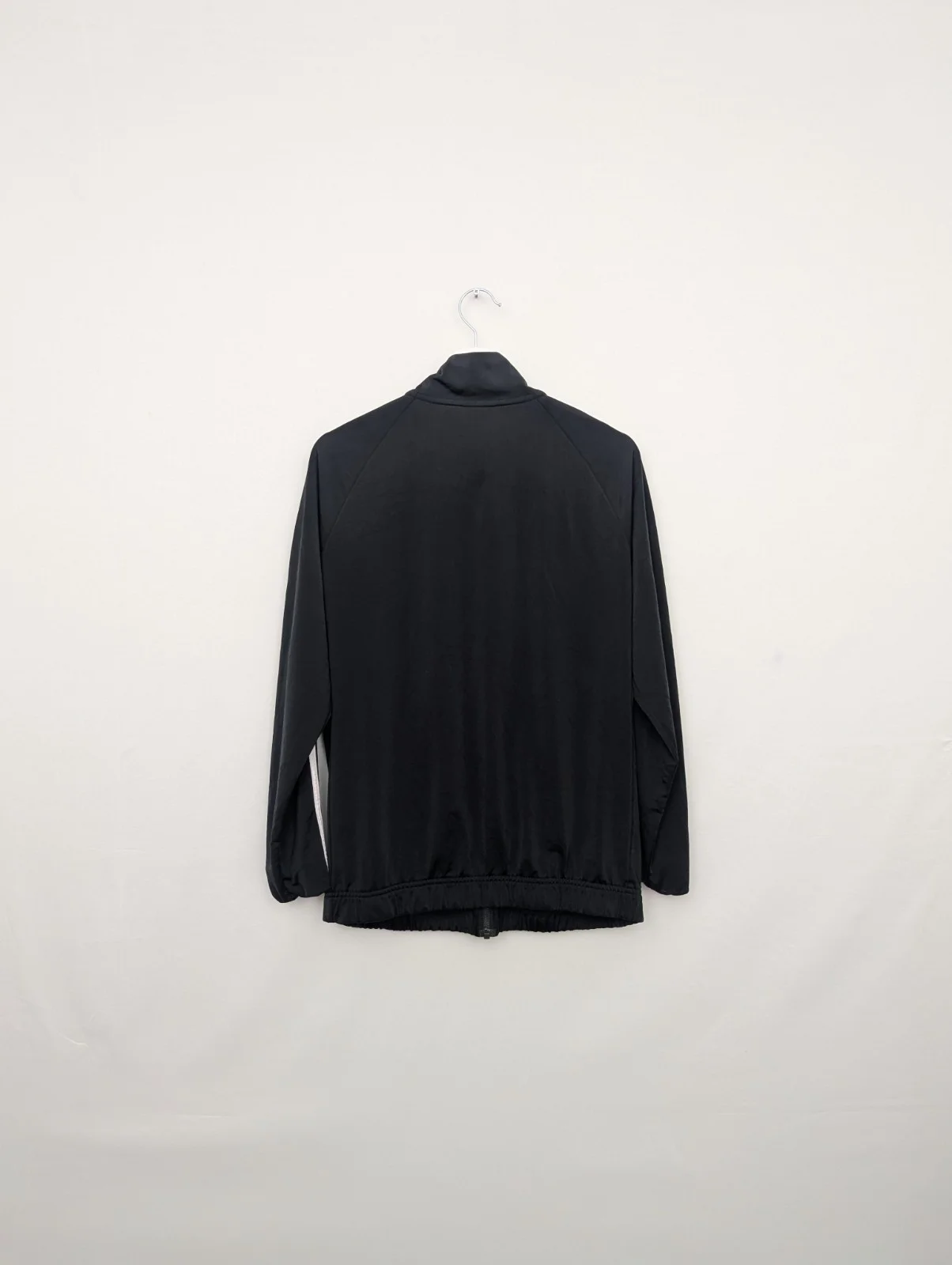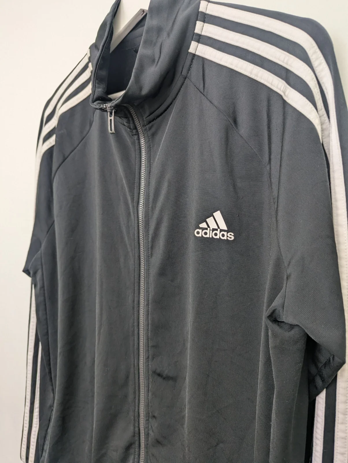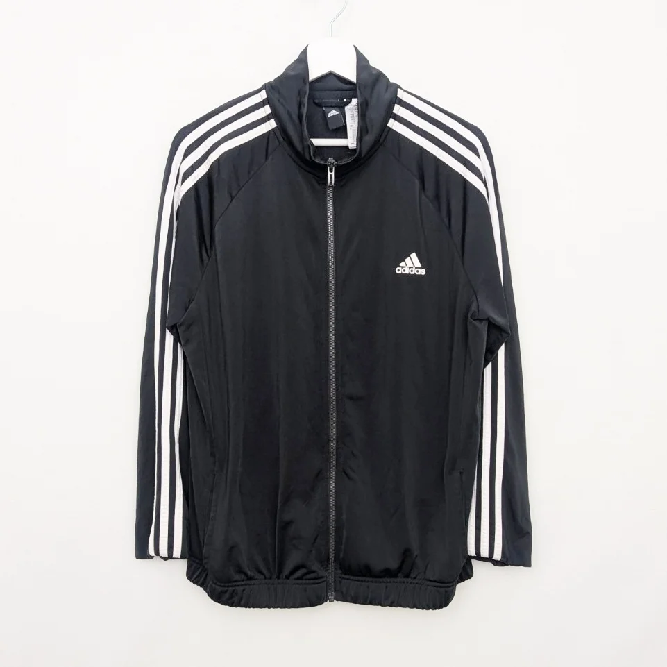 Authentic Adidas black full zip track jacket featuring classic white 3 stripe sleeve detailing and embroidered chest logo. Lightweight performance fabric with elasticated hem and athletic cut.