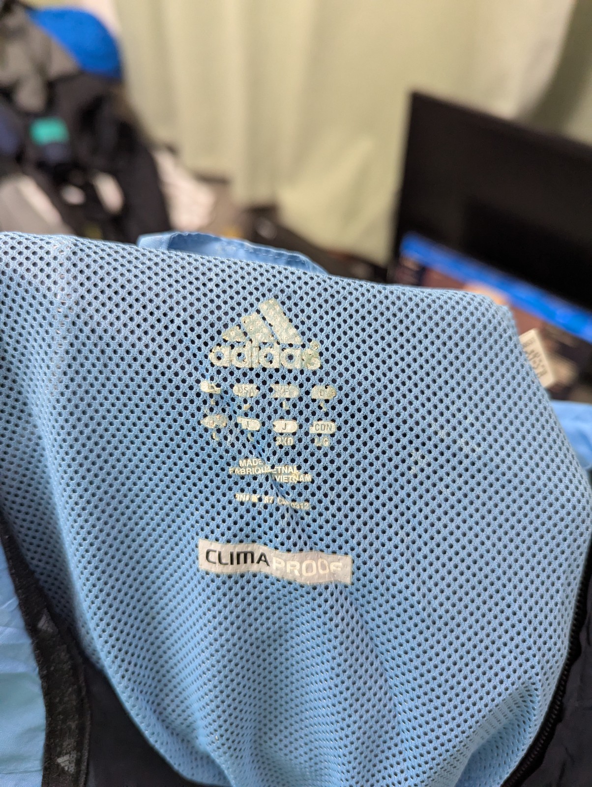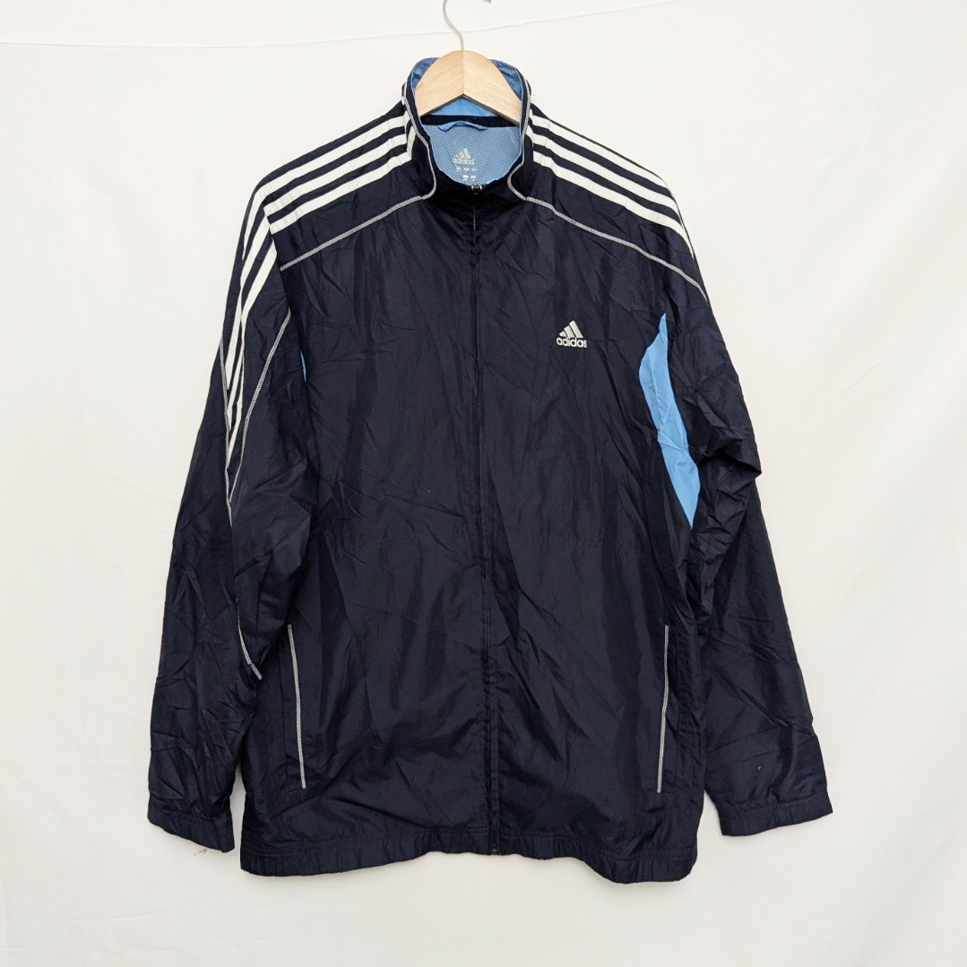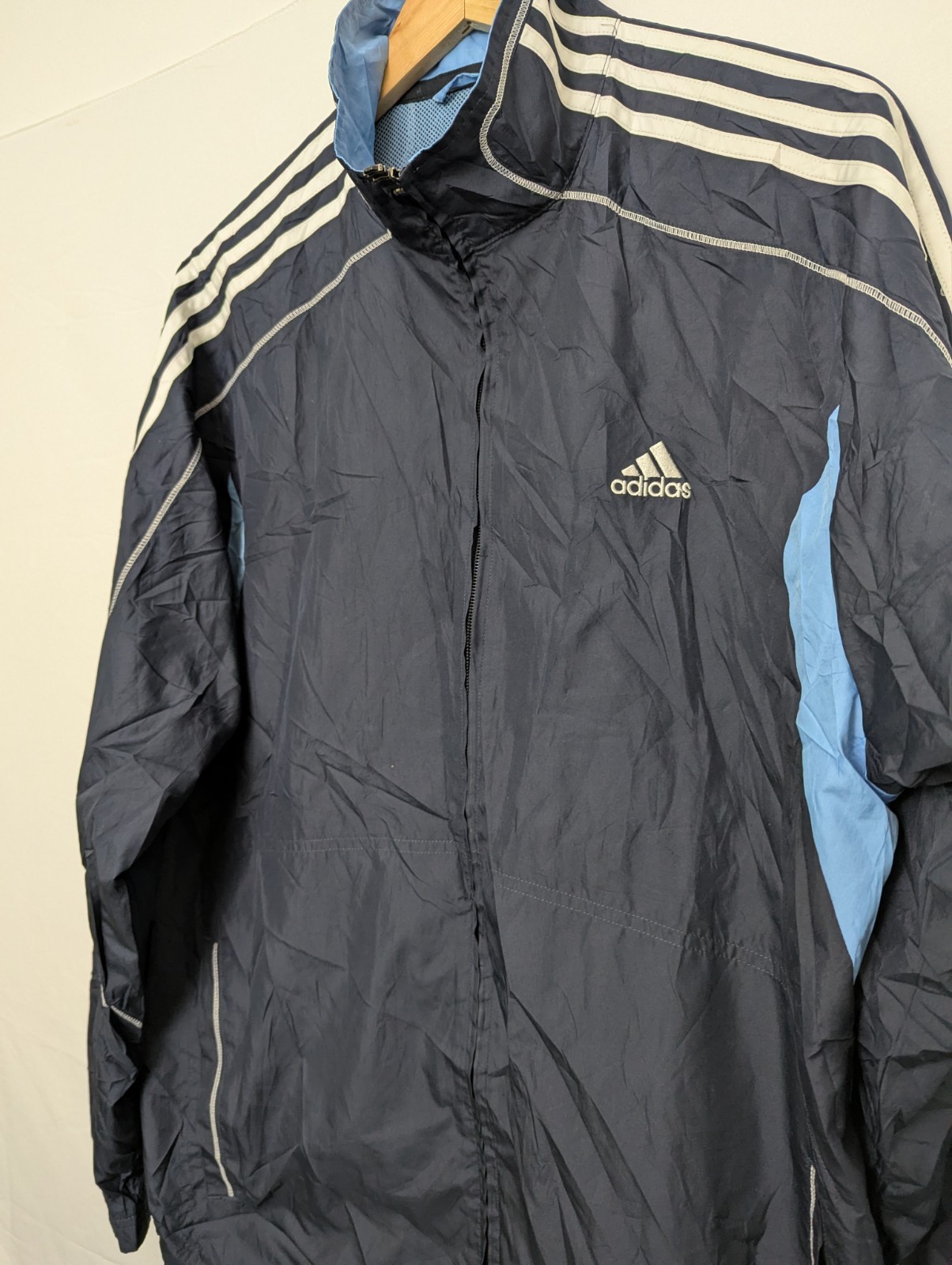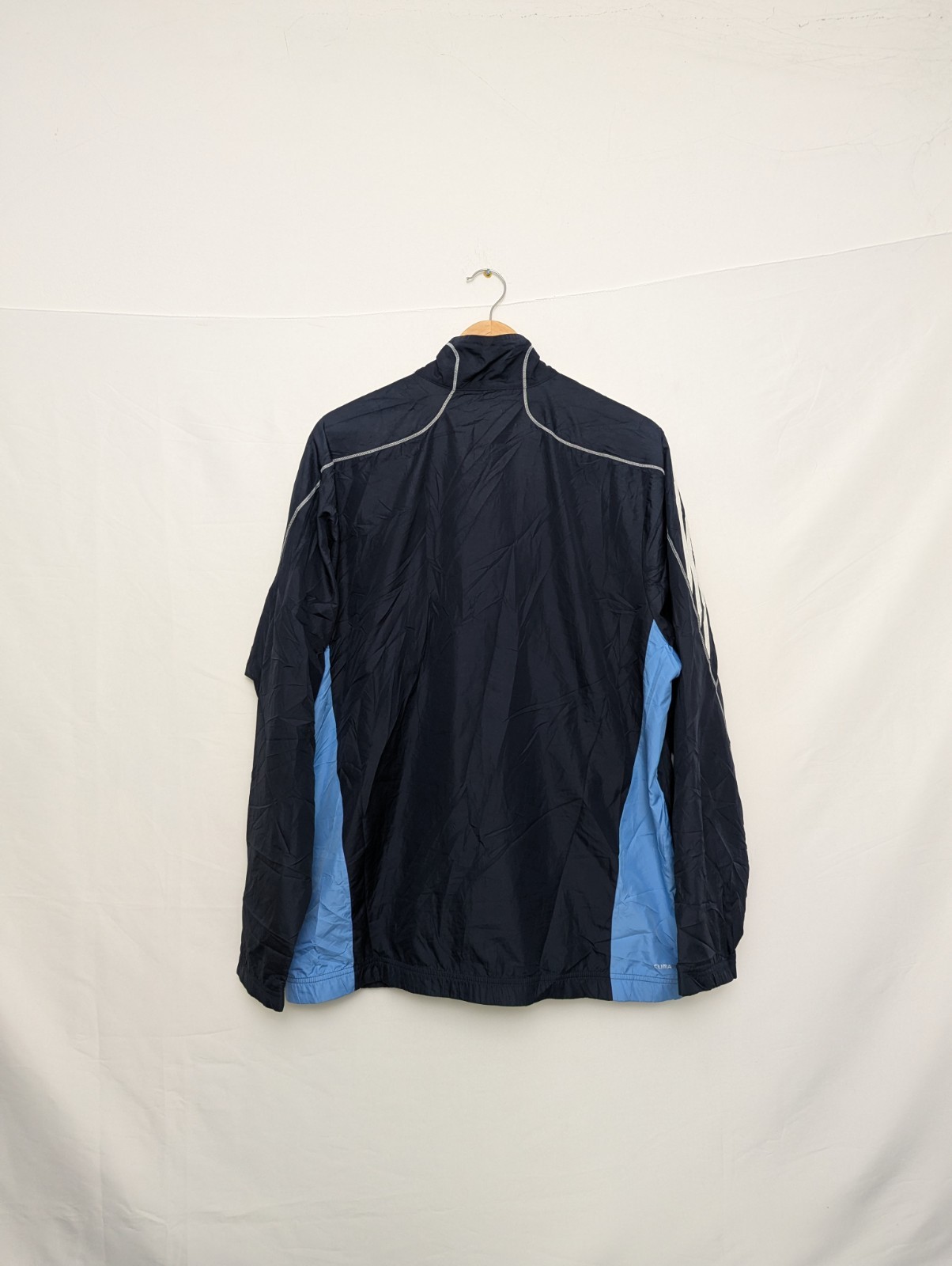 Adidas ClimaProof lightweight jacket in men’s size L, navy with light-blue panels. Features reflective piping, triple-stripe shoulders, mesh lining, and zip pockets.