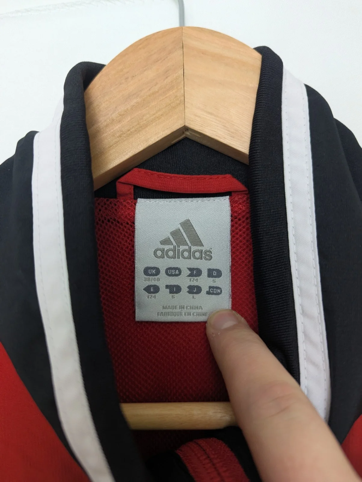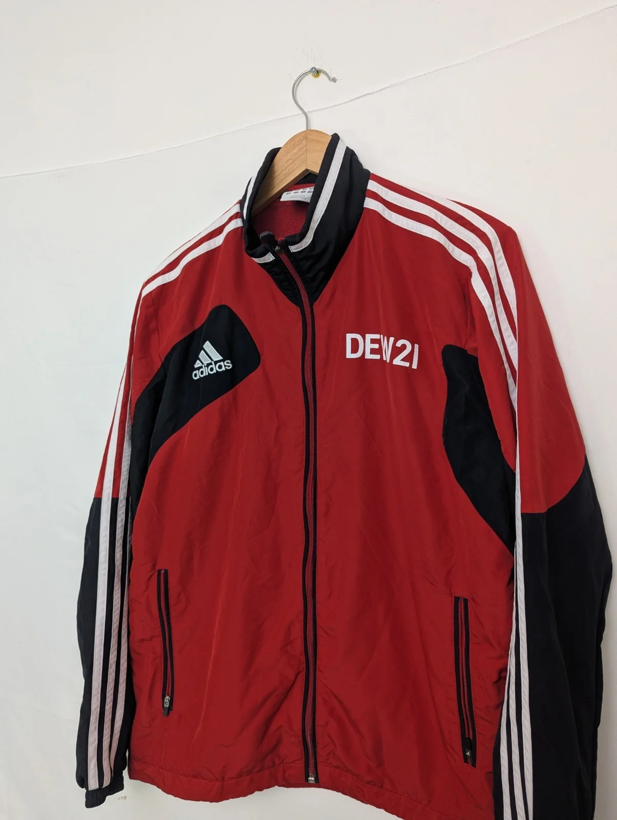 Men’s Adidas full zip training jacket in red with black panels and white 3-stripe detailing. Features zip pockets, mesh lining and a high collar. Finished with Adidas branding and DEW21 printed detail on the chest.