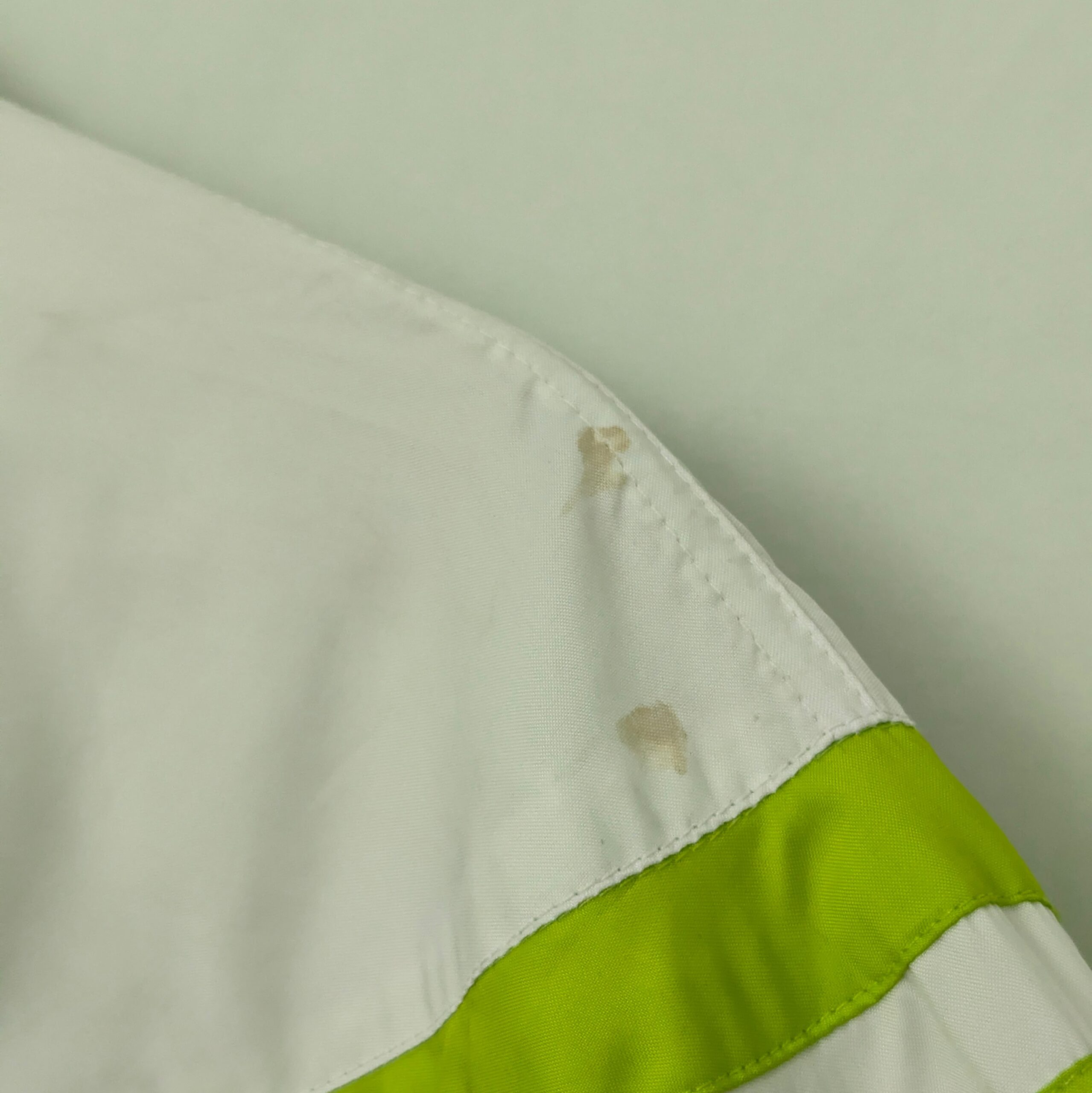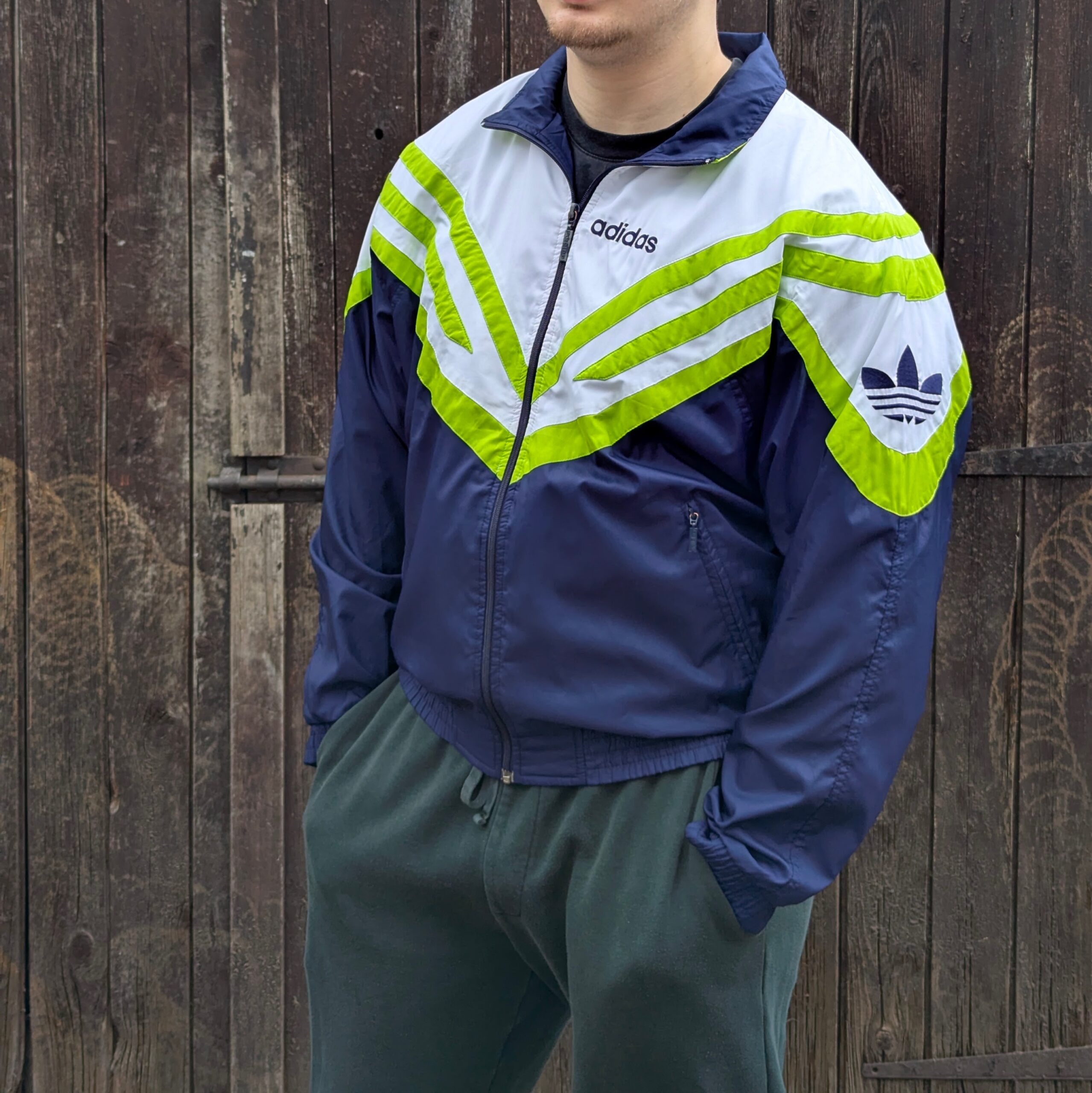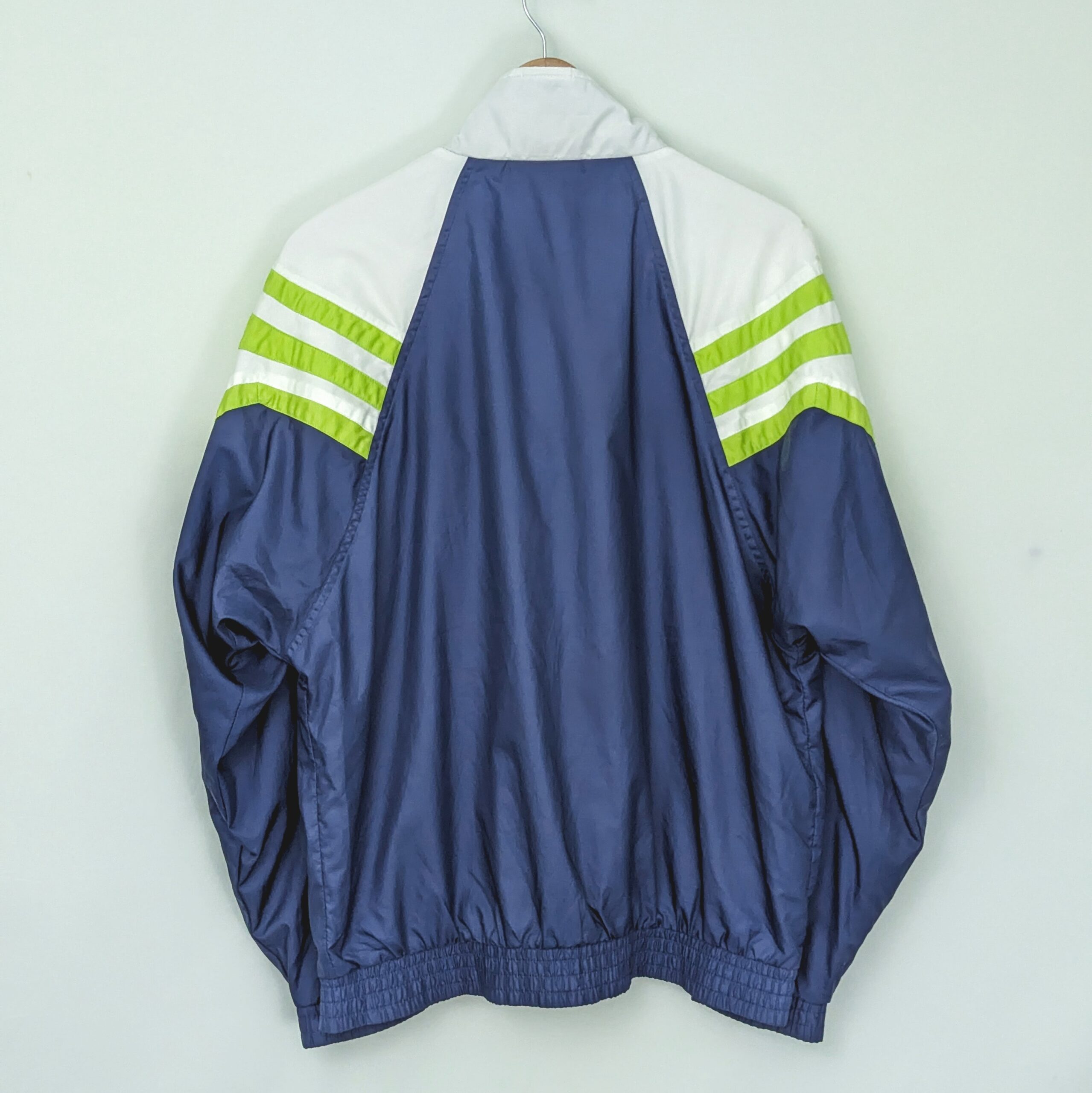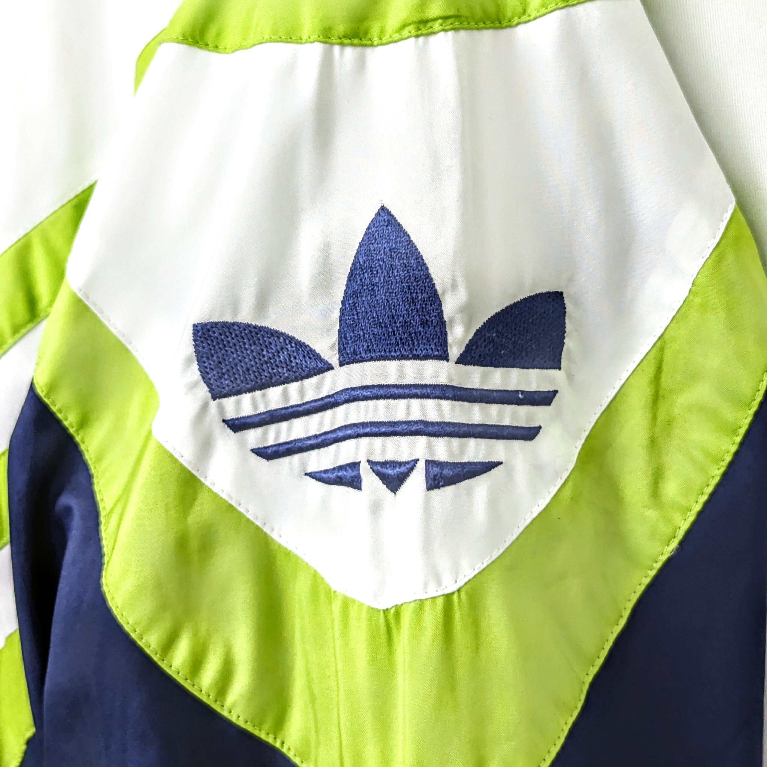 Vintage Adidas windbreaker jacket from the early 2000s featuring a bold navy, white and green colour block design.