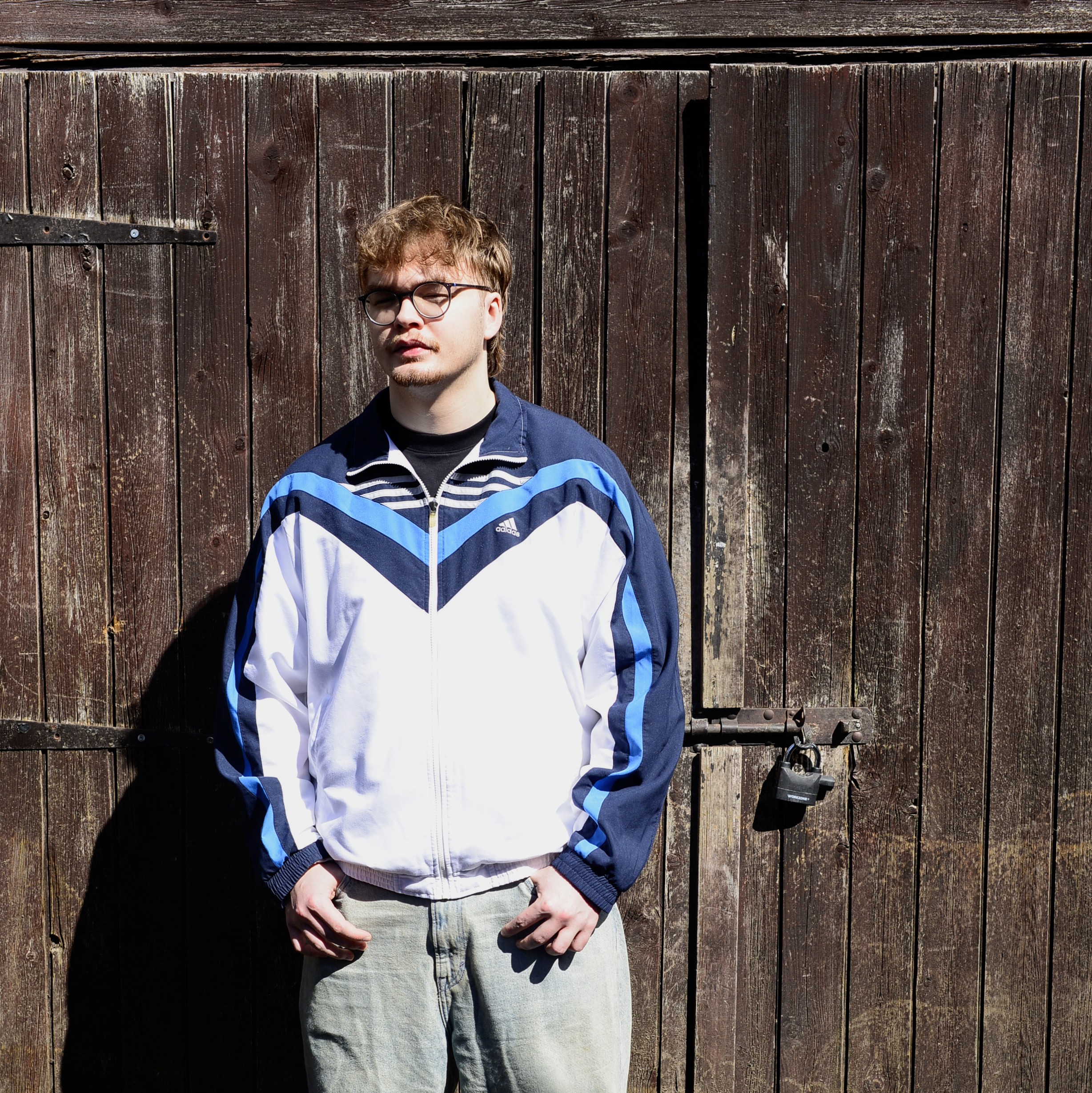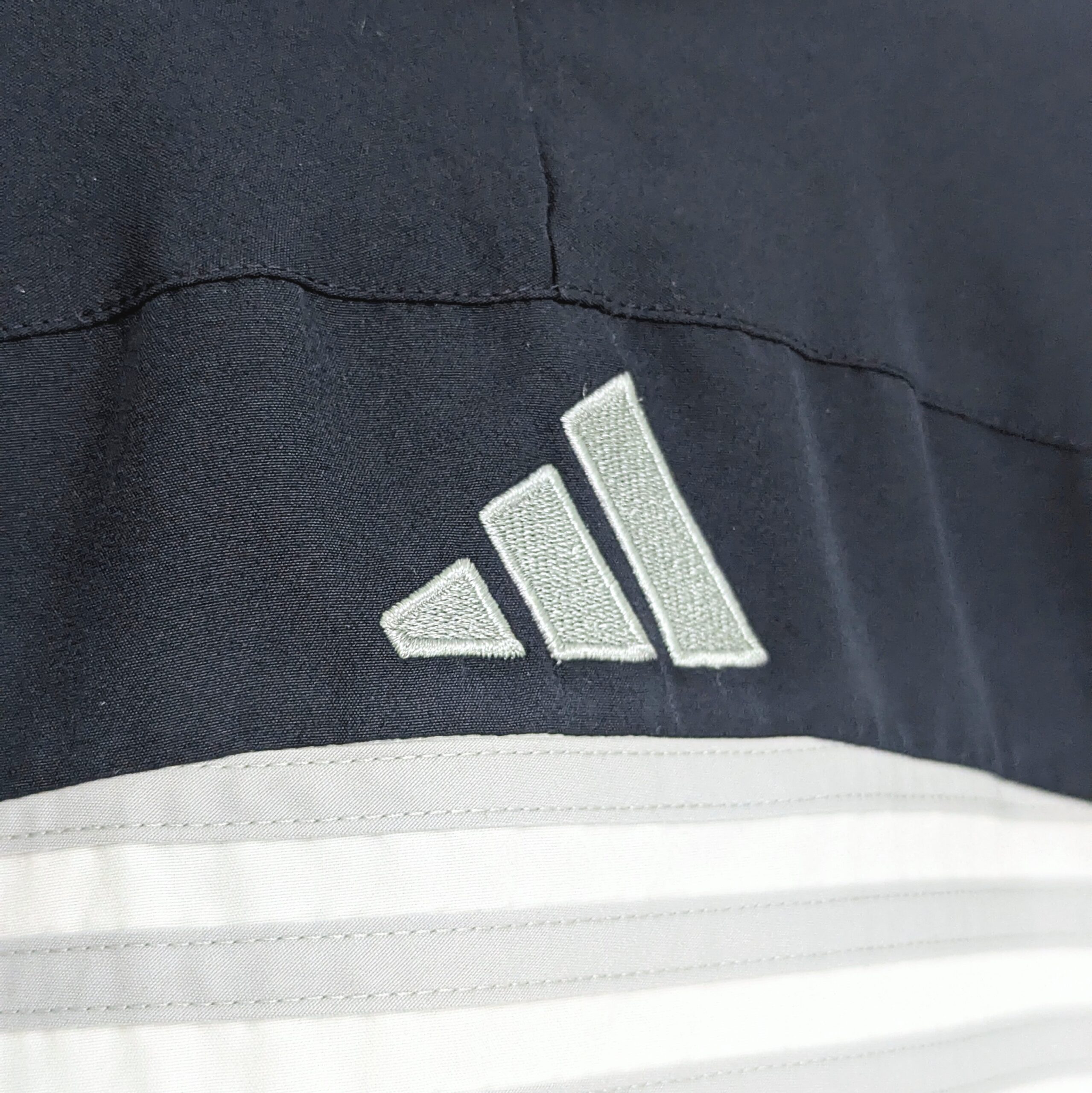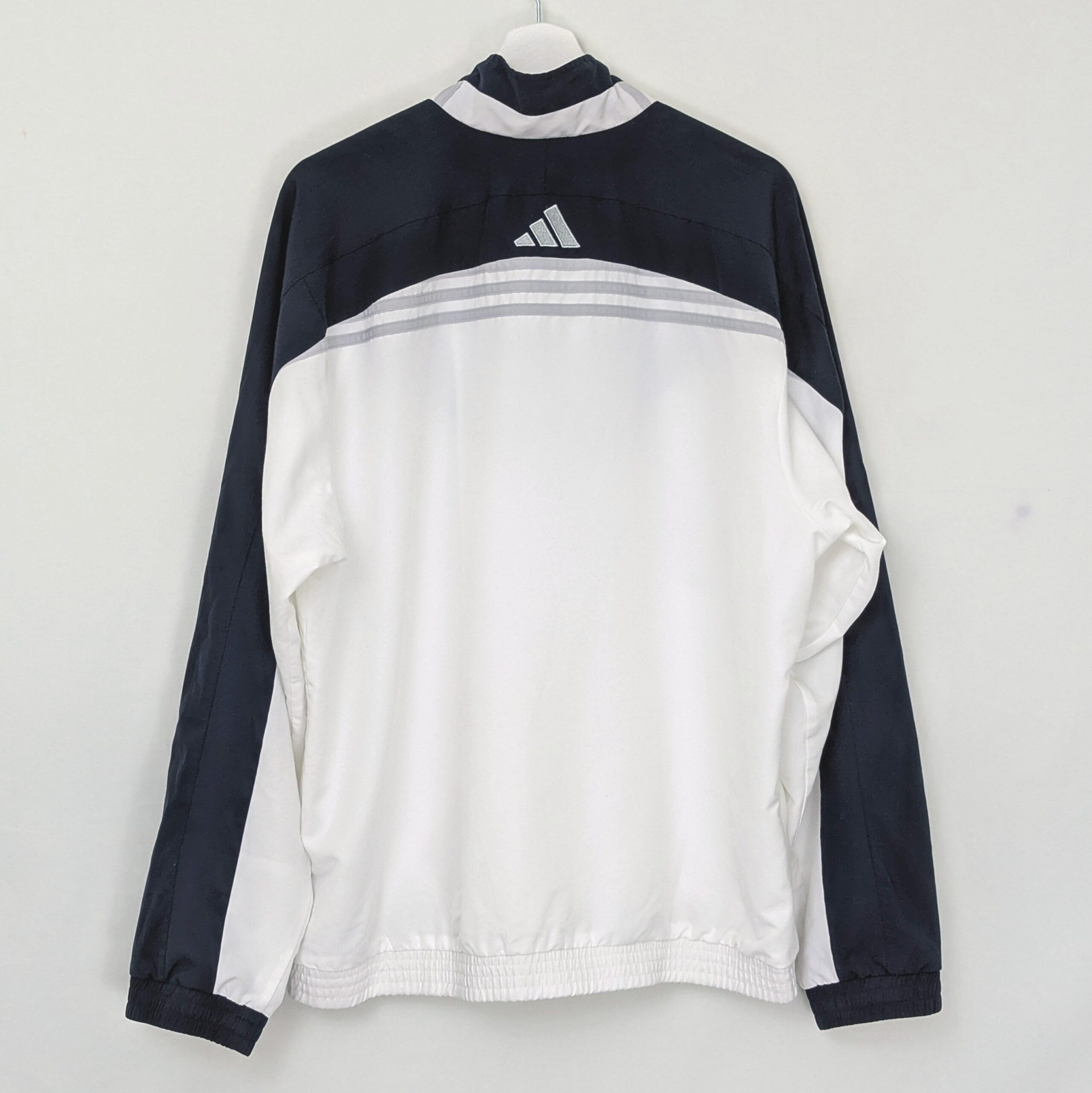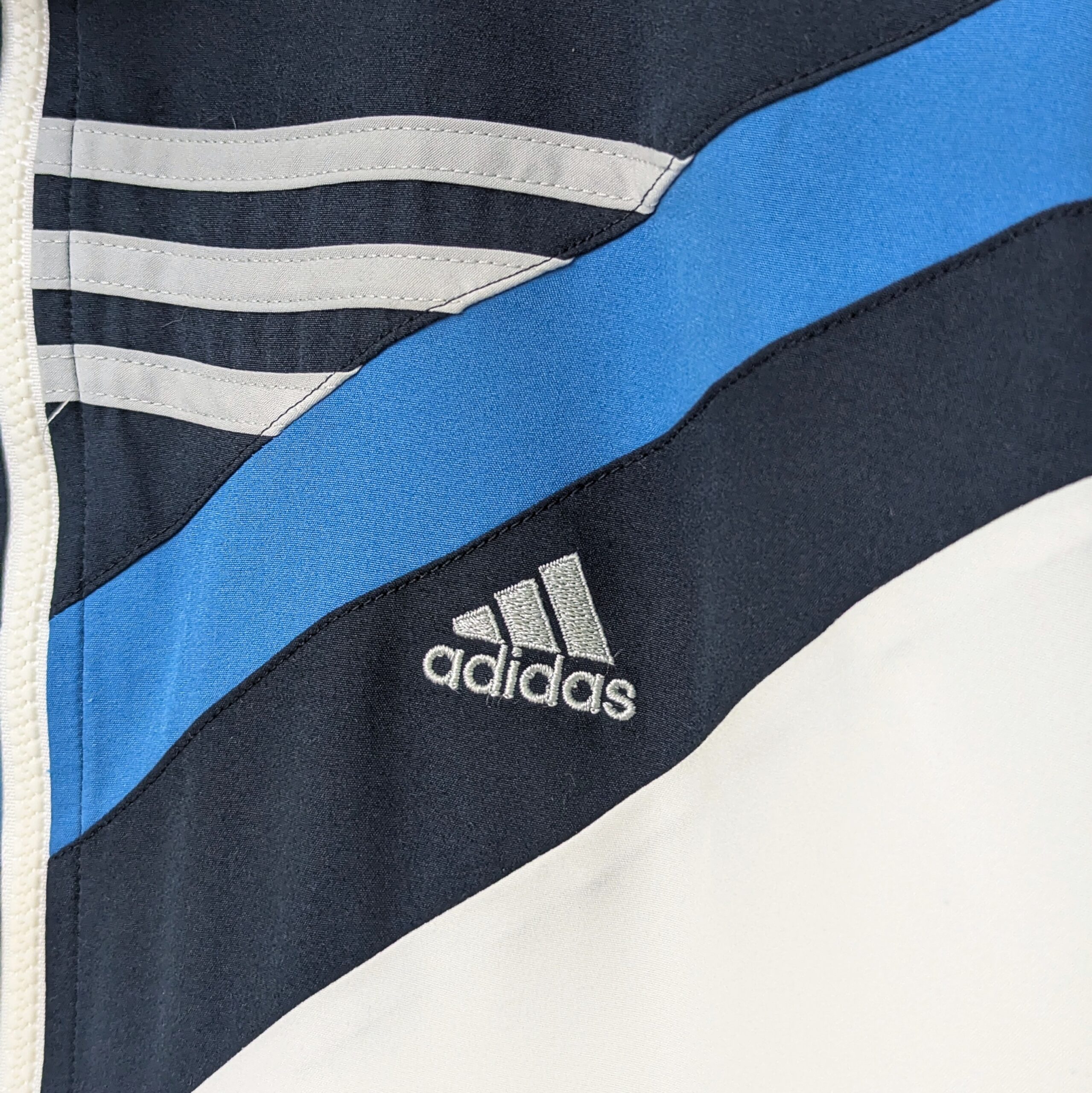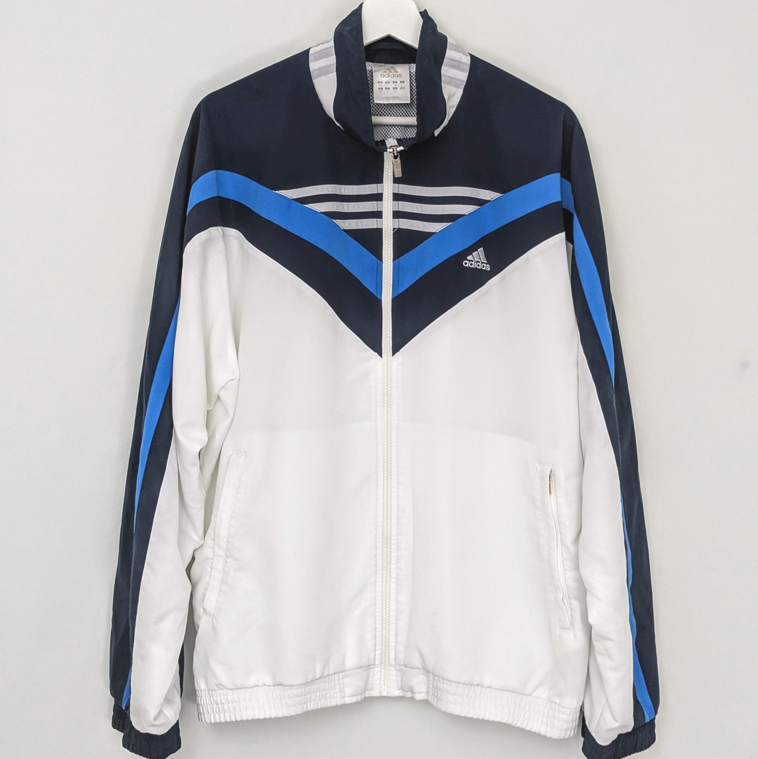 Adidas windbreaker jacket from the 2010s featuring a clean white base with navy and blue chevron panel design. Includes an embroidered Adidas logo on the chest and full zip closure.