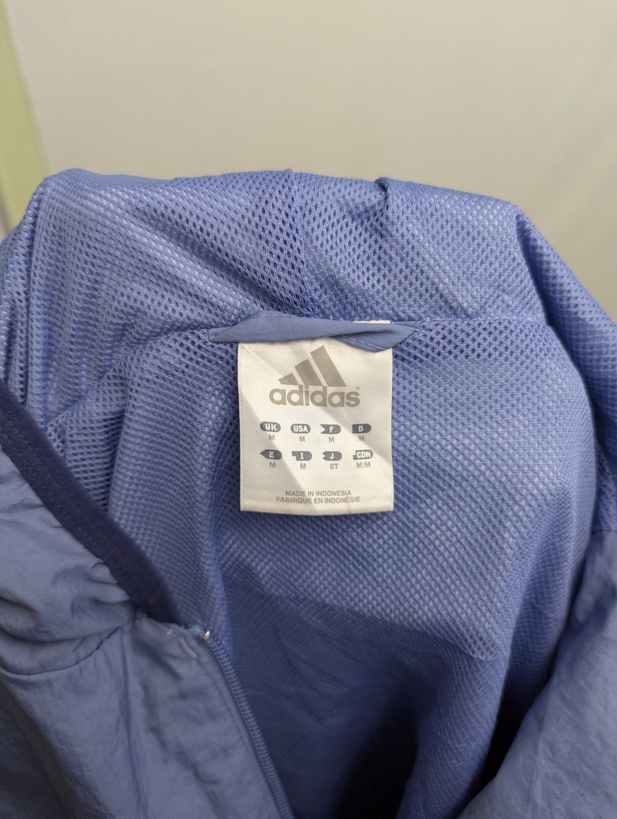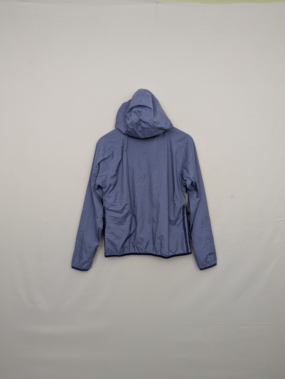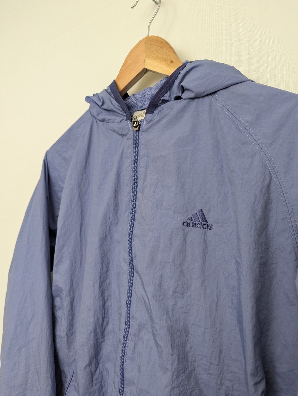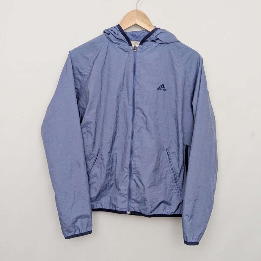Women’s Adidas lightweight hooded jacket in blue with a clean, minimalist sportswear design. Features a full zip front with the zip pull missing (zip still works), adjustable hood, mesh-lined lining, and a lightweight outer shell.