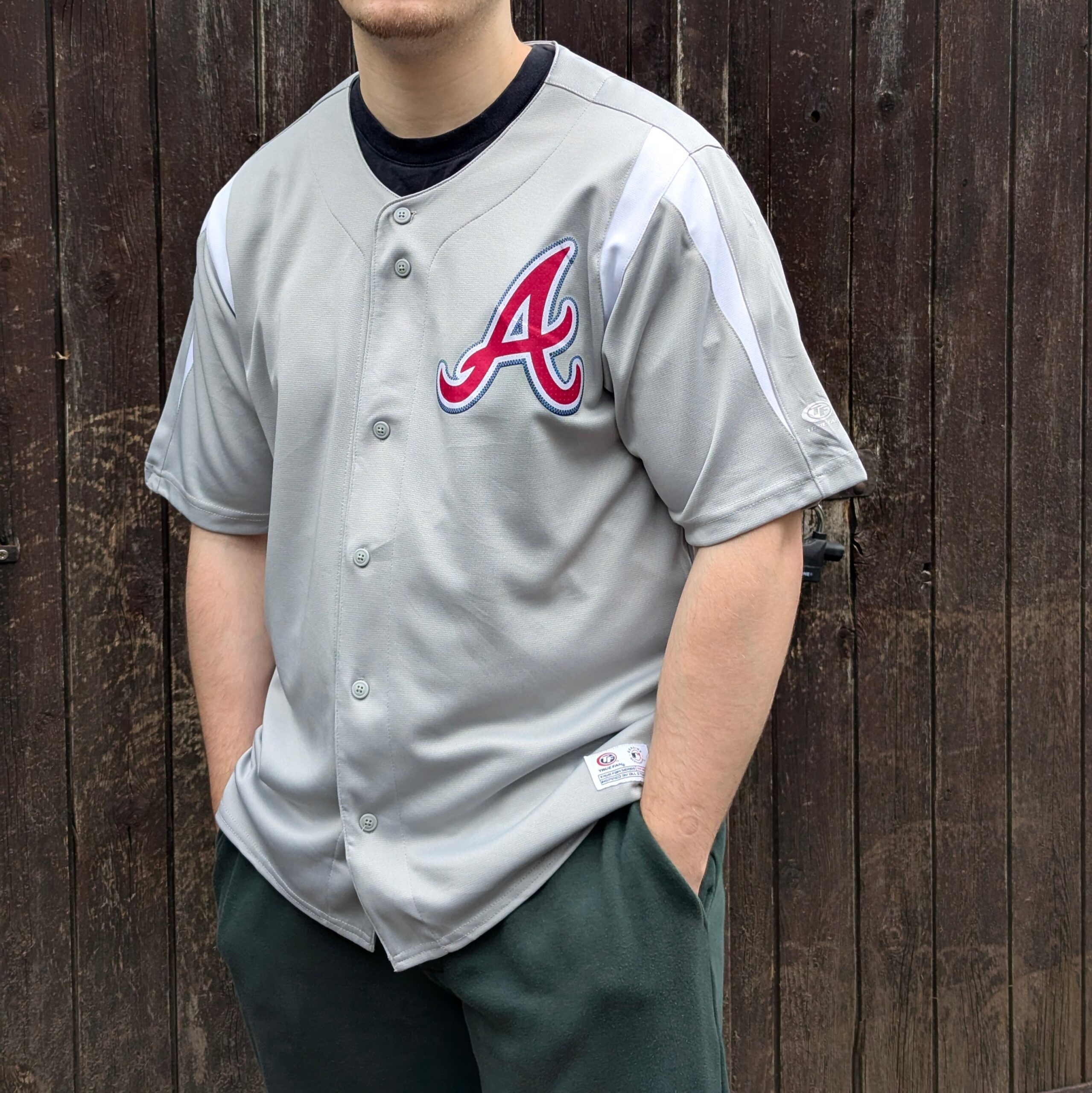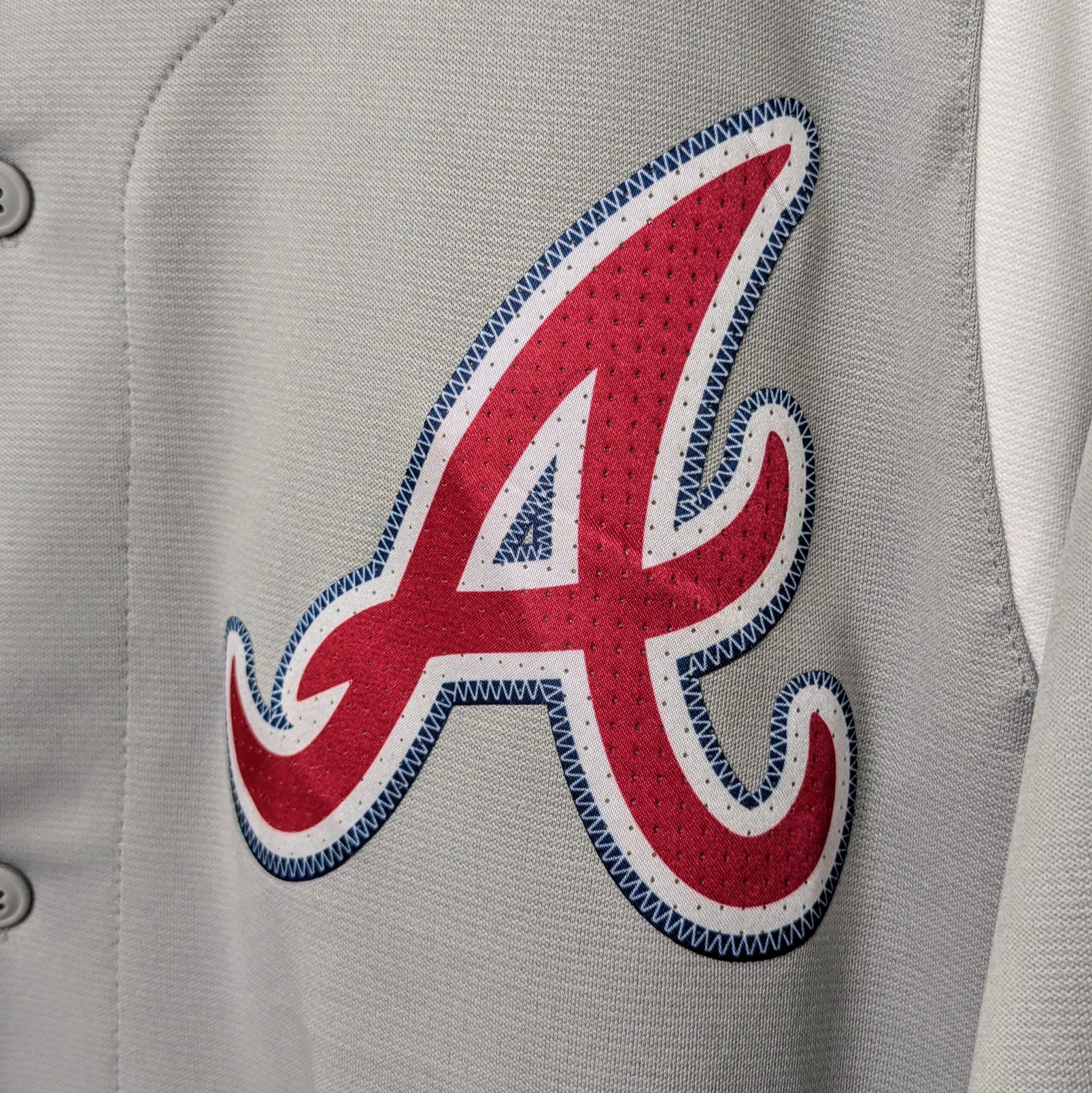 Atlanta Braves baseball jersey in a grey colourway featuring the iconic embroidered “A” logo on the chest.