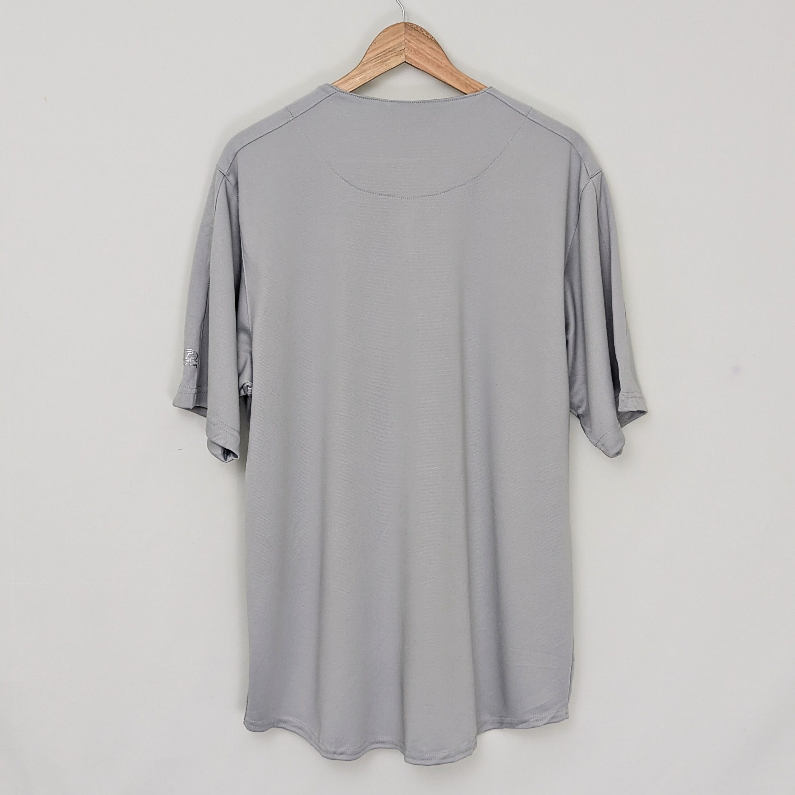 Features: Button-up front, embroidered logo, short sleeves