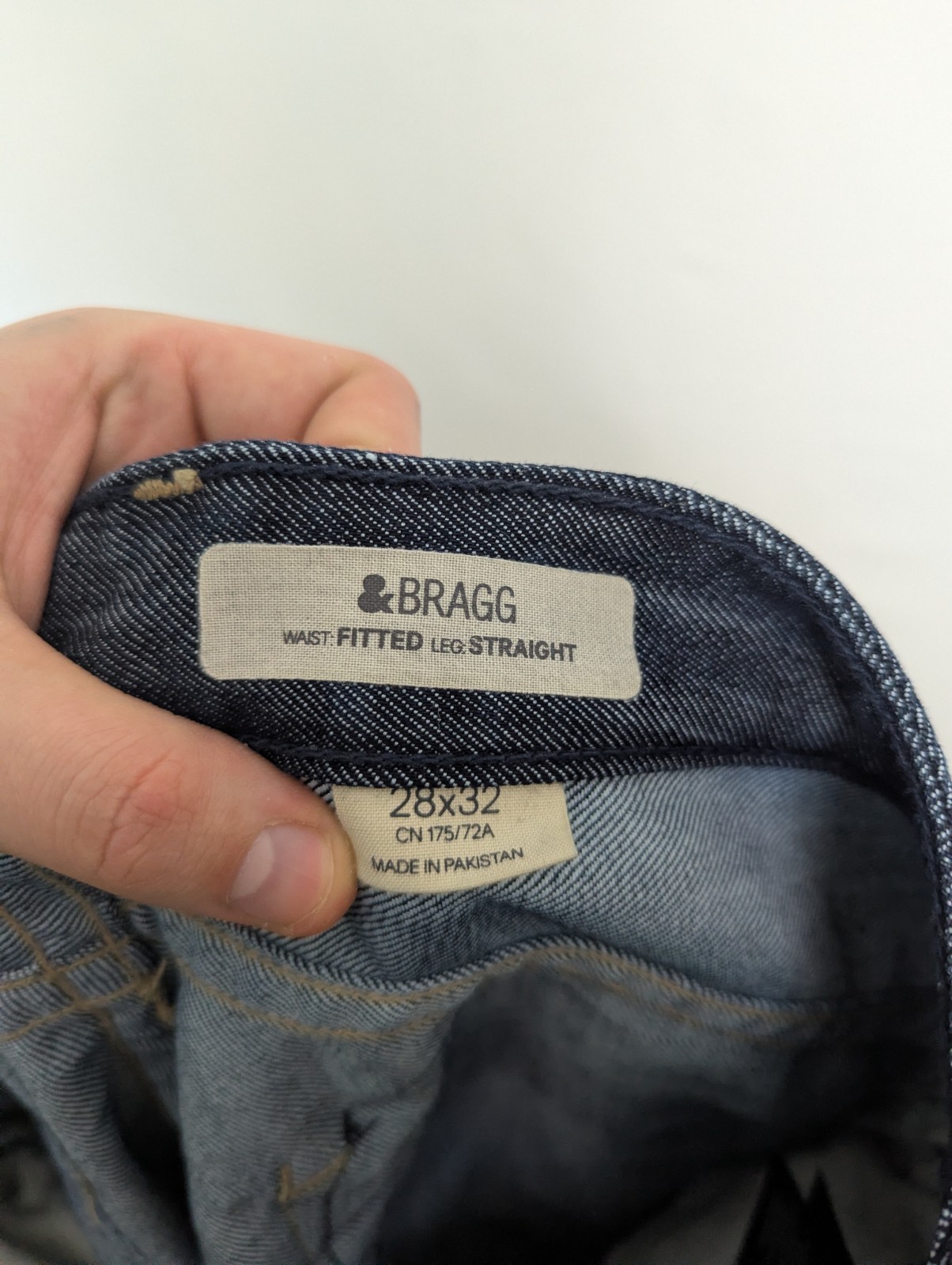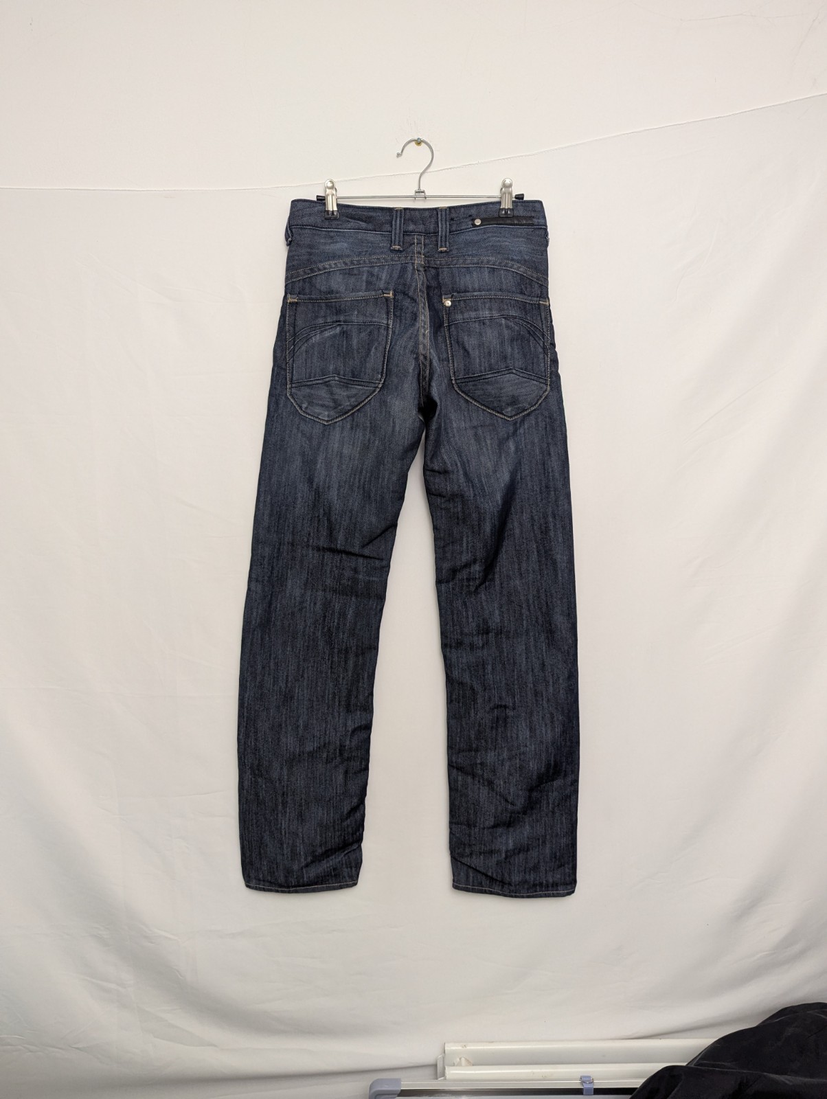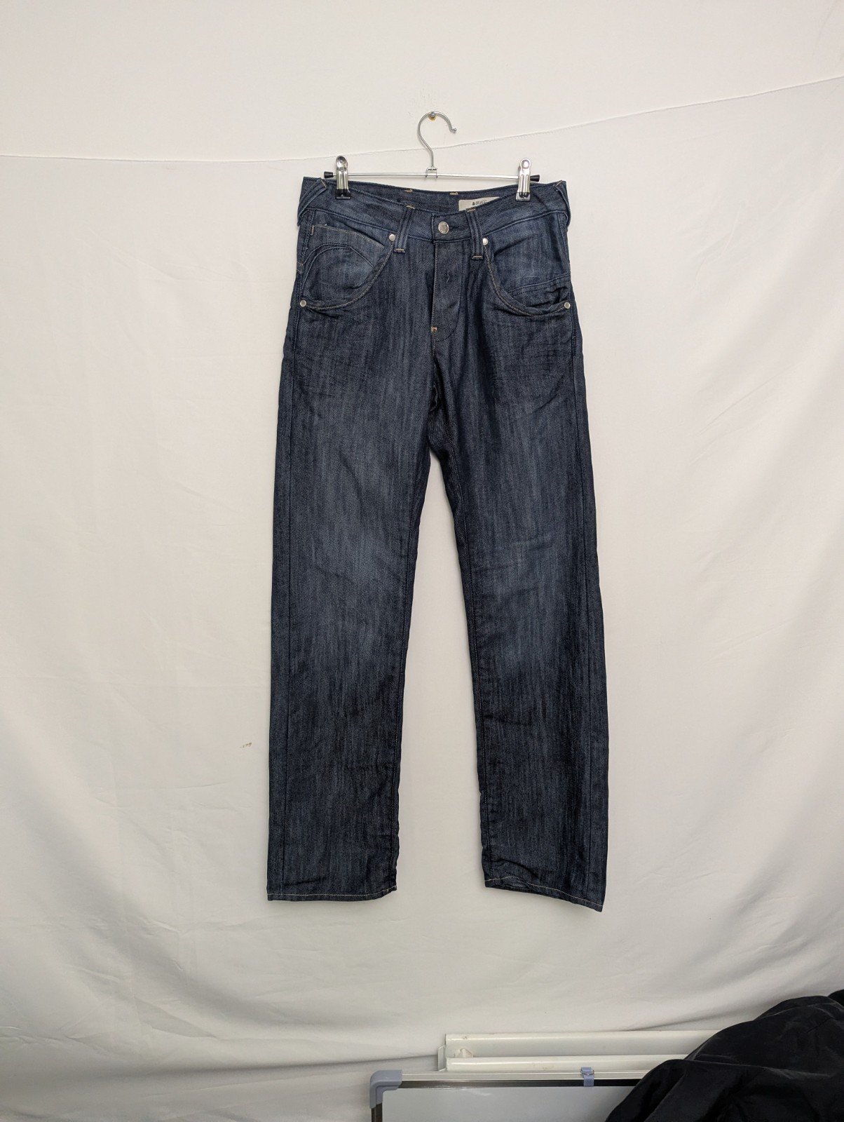 Men’s BRAGG jeans in size 28×32 with a fitted waist and straight leg. Classic dark-wash denim with subtle fading. Good pre-owned condition with light signs of wear.