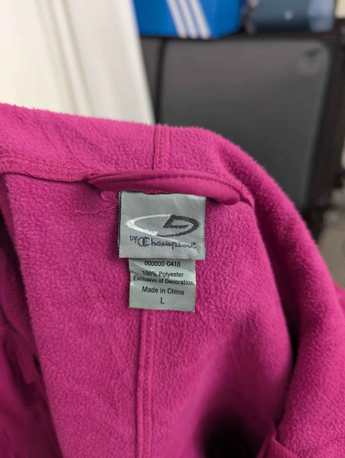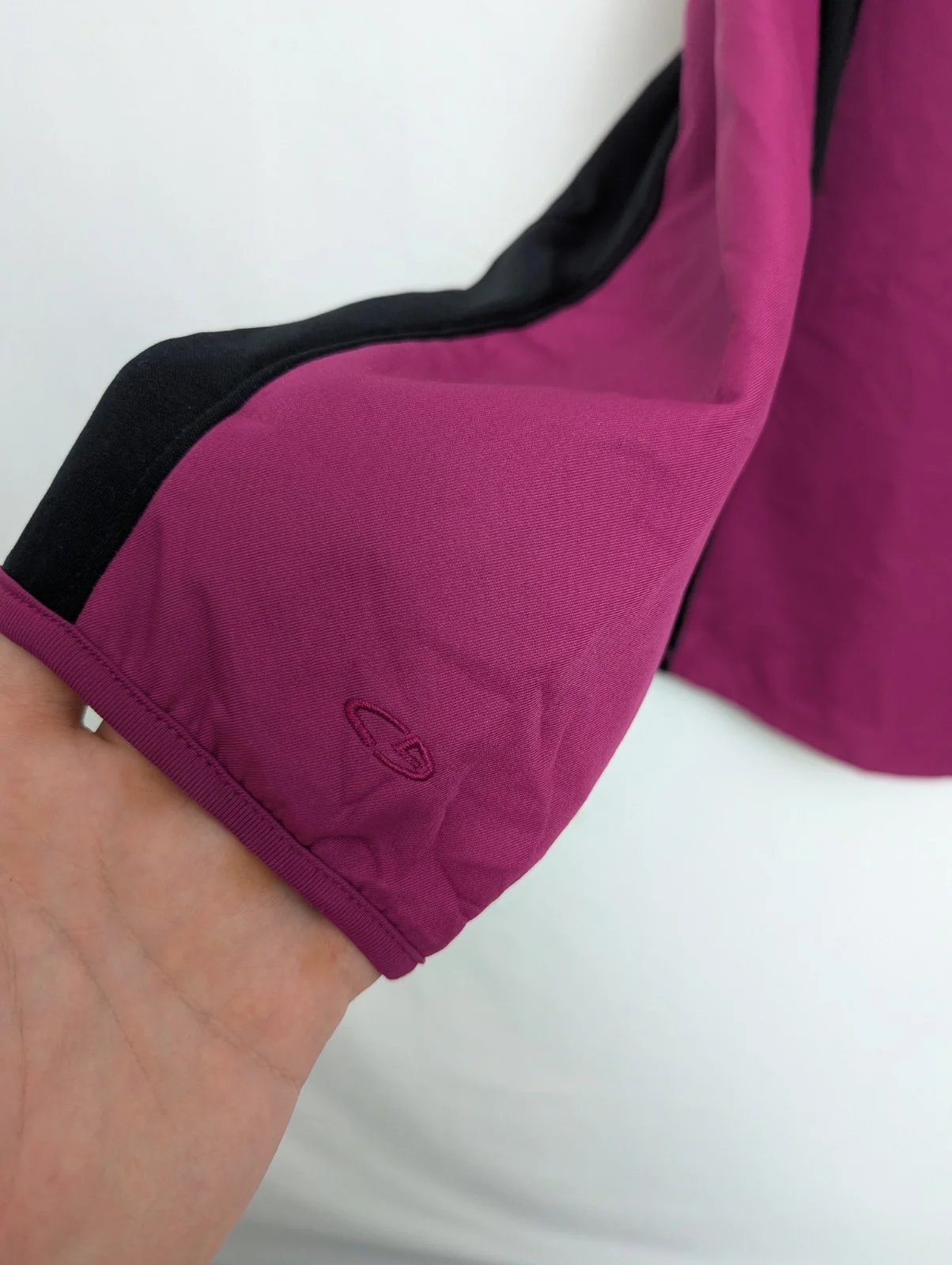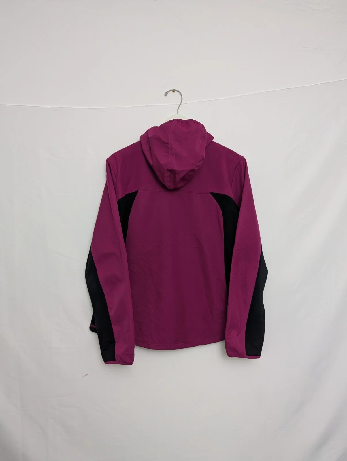 Women’s lightweight softshell jacket by C9 by Champion, size Large. Features a magenta outer with black contrast panels, full zip front, hood, and a warm fleece lining.