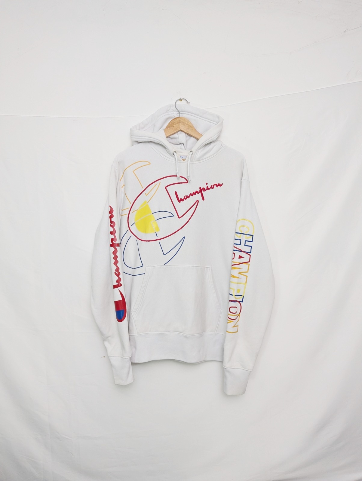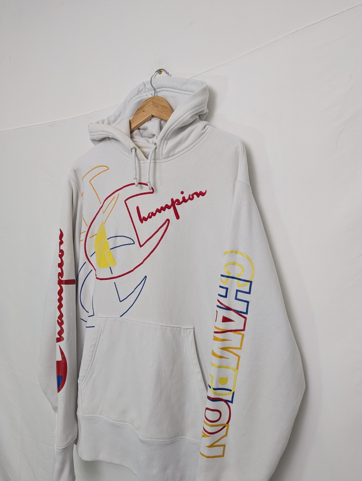 Men’s Champion Reverse Weave hoodie in white, featuring bold multicolour Champion logo graphics across the chest and sleeves. Made with heavyweight Reverse Weave construction for durability, warmth and a premium feel.