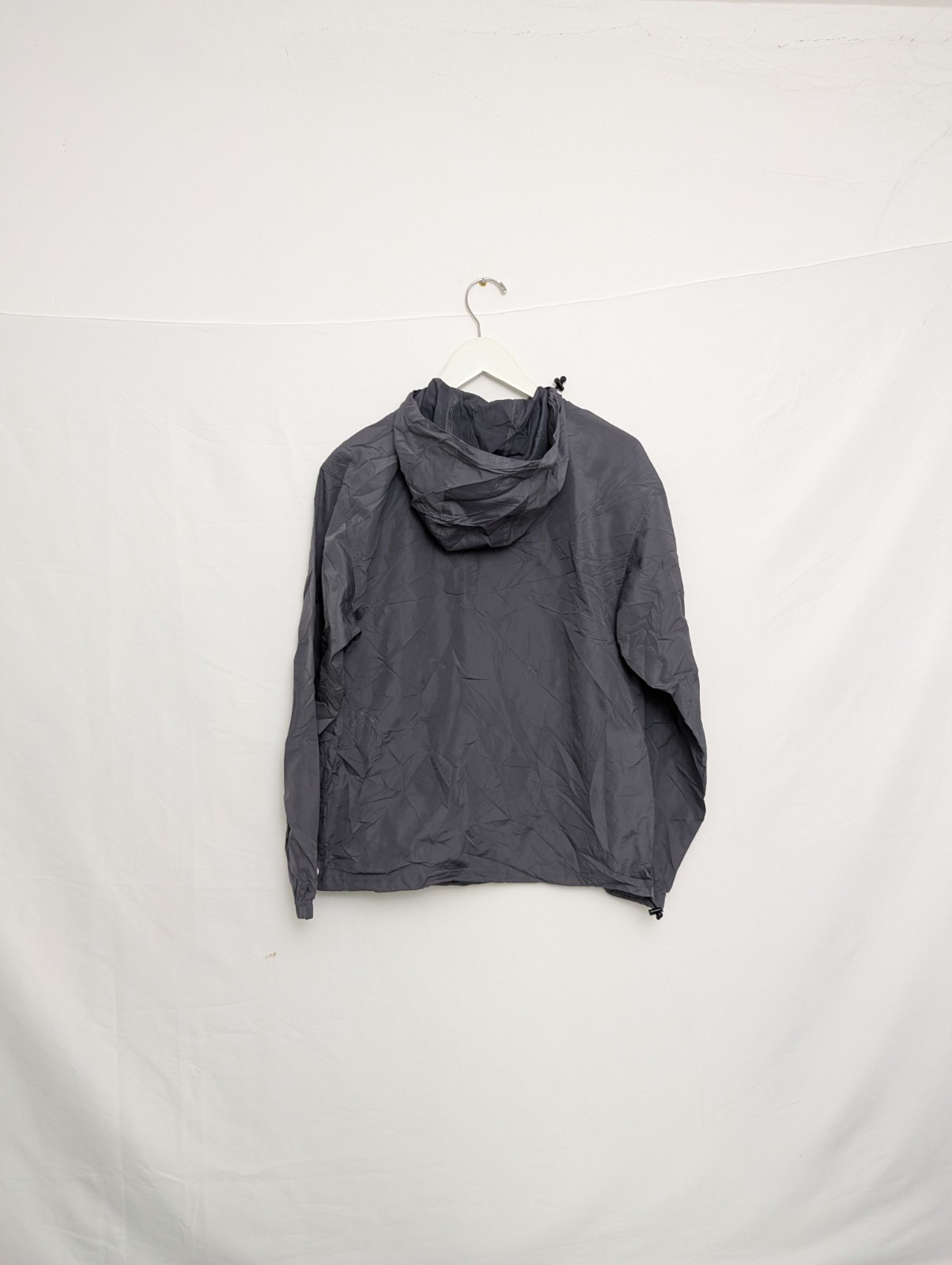 Lightweight nylon shell with half-zip front, hood, elastic cuffs and hem.