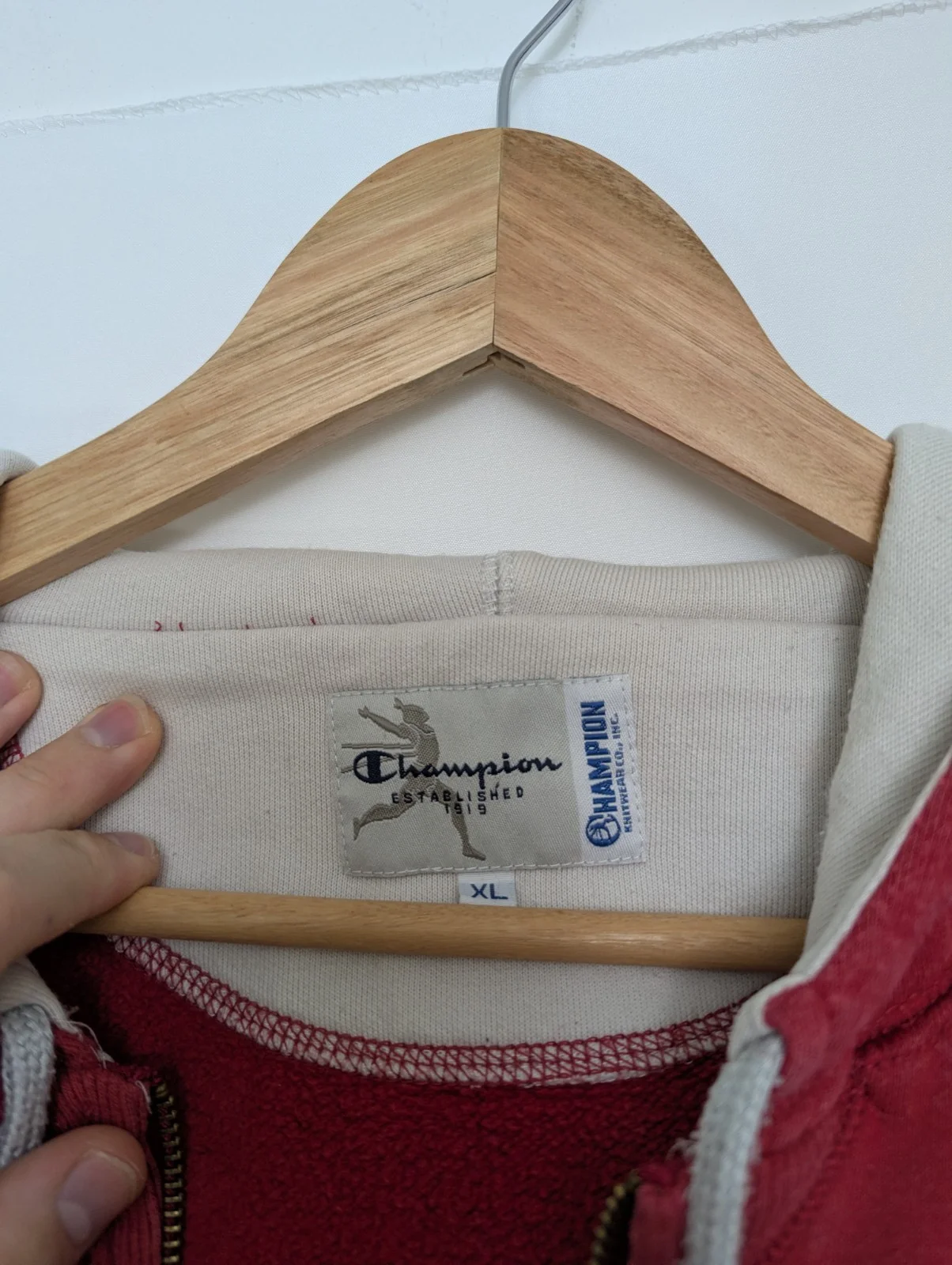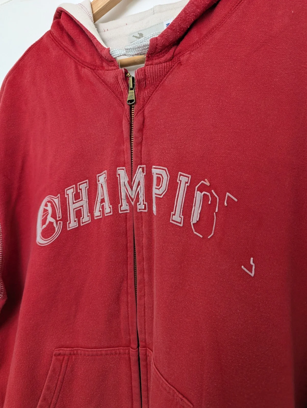 Champion Full-Zip Hoodie – Distressed Collegiate Spellout – Red – Size XL