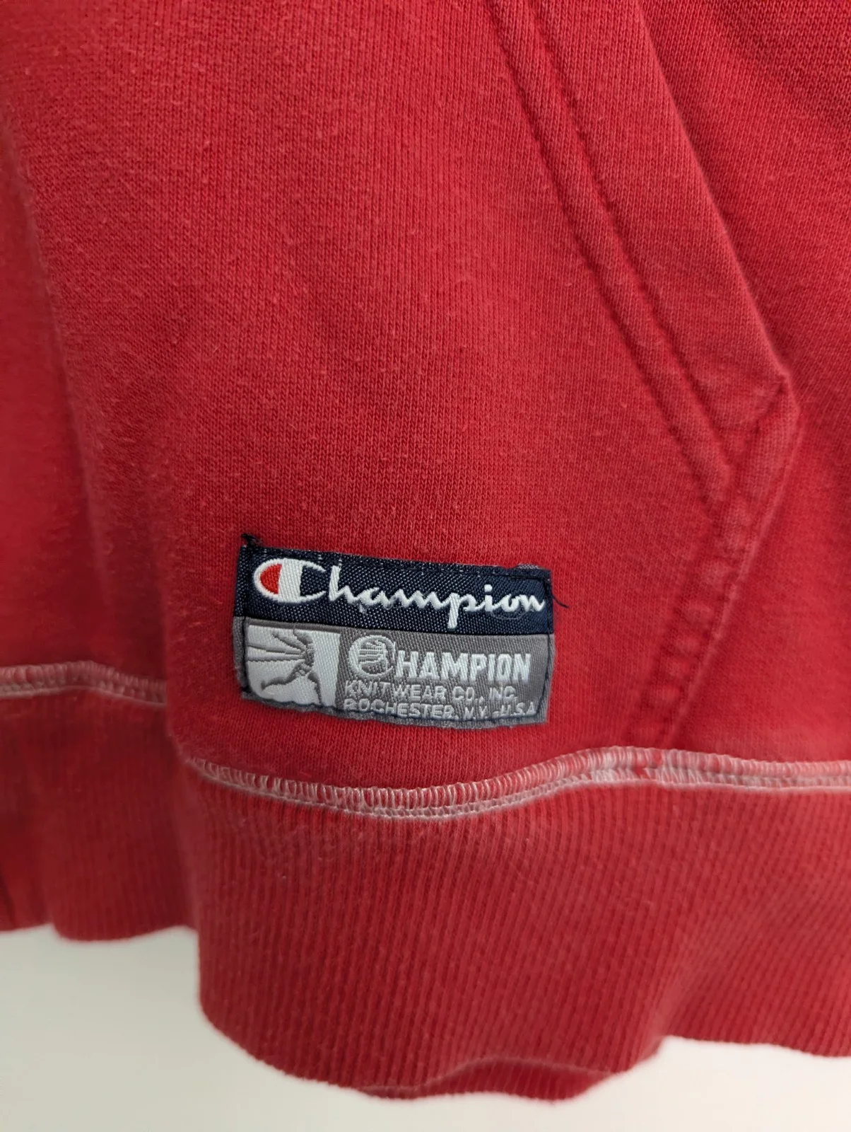 Heritage woven label on pocket: Champion Knitwear Co., Inc. – Rochester NY, USA