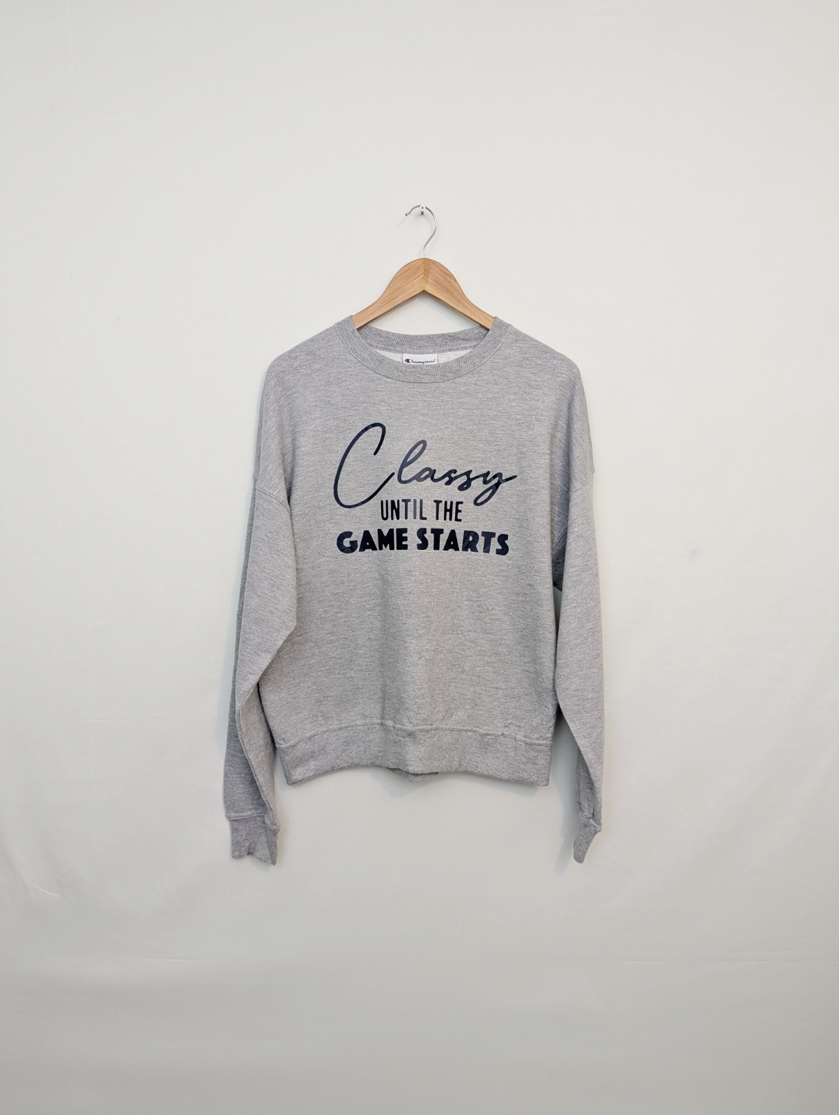 Champion grey crewneck sweatshirt with “Classy Until The Game Starts” slogan print on the front.