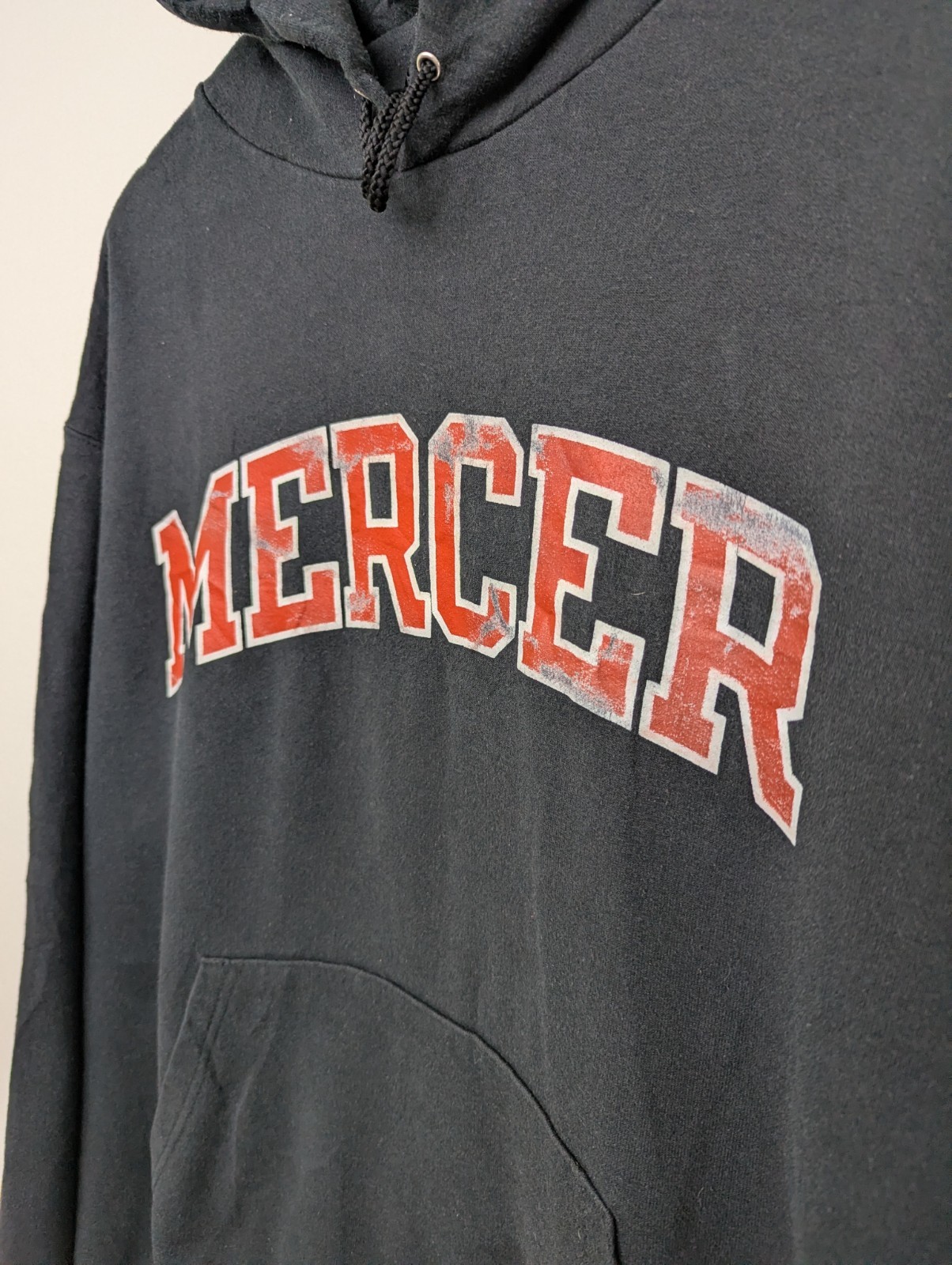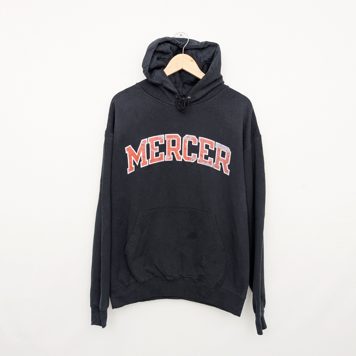 Men’s Champion pullover hoodie in black with large Mercer collegiate chest print in red and white. Features a classic kangaroo pocket, adjustable drawstring hood, and ribbed cuffs and hem.