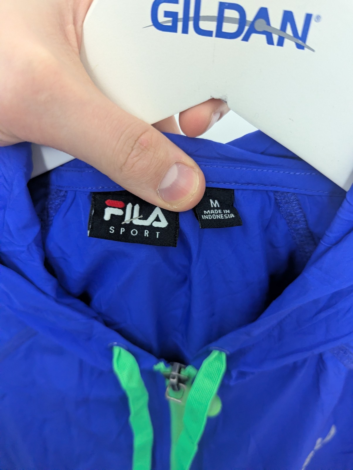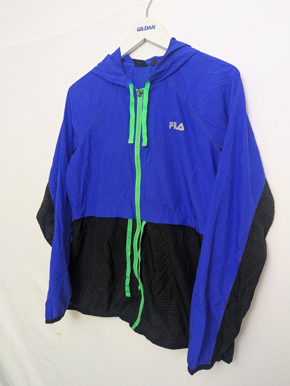 Lightweight FILA Sport jacket in bright blue with neon green zip and drawcords.