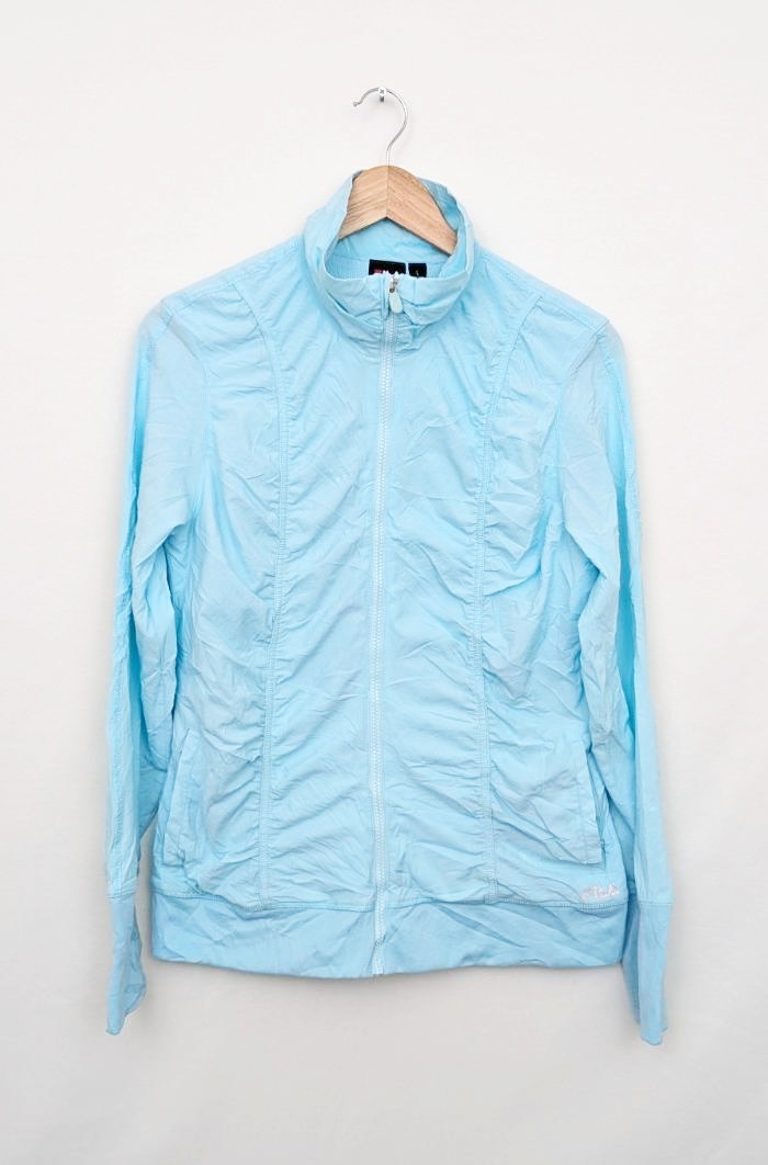 Women’s FILA Sport lightweight track jacket from the early–mid 2000s. Light blue shell with full zip fastening, high collar, mesh lining, and reflective FILA logo detail.