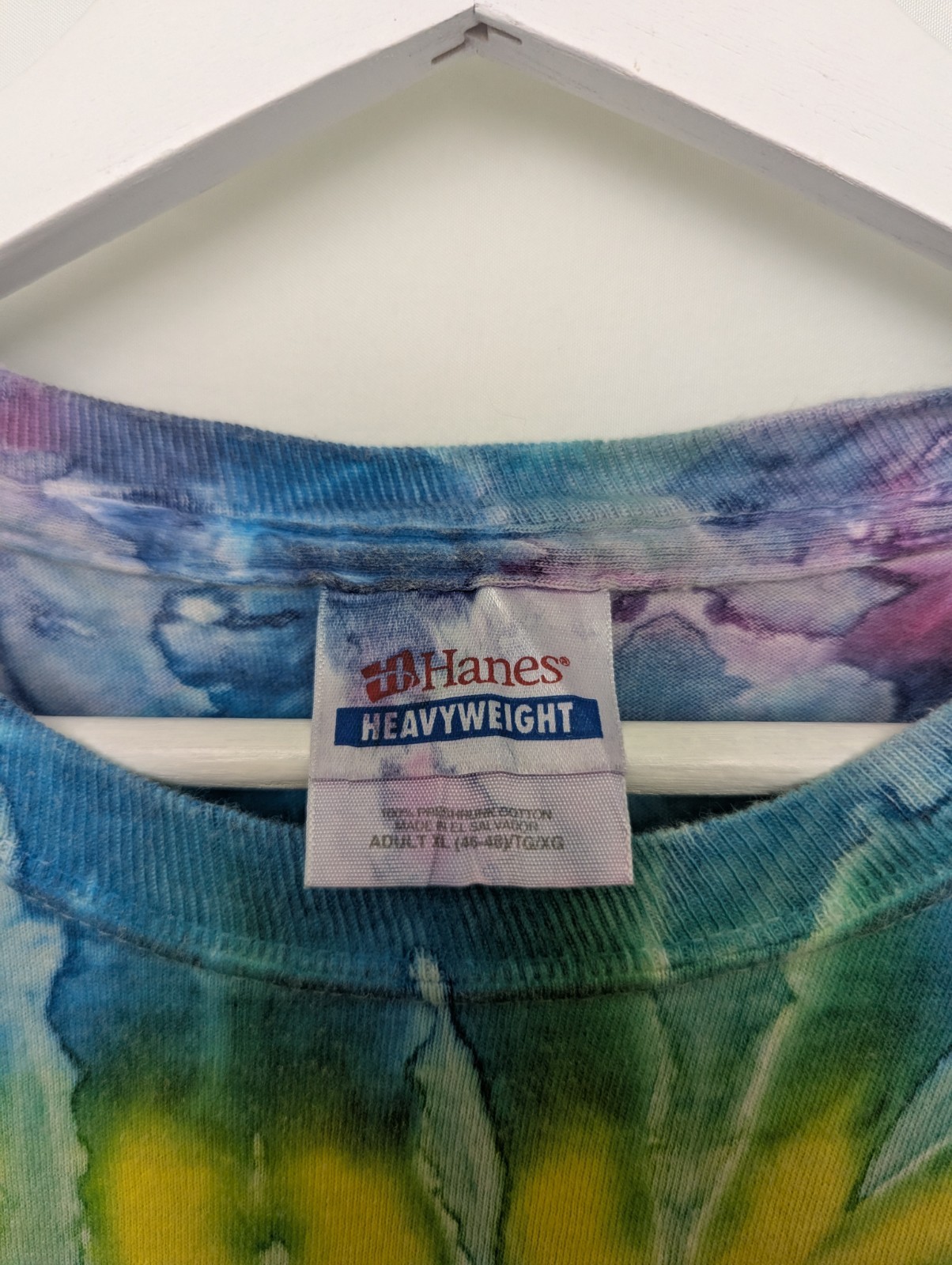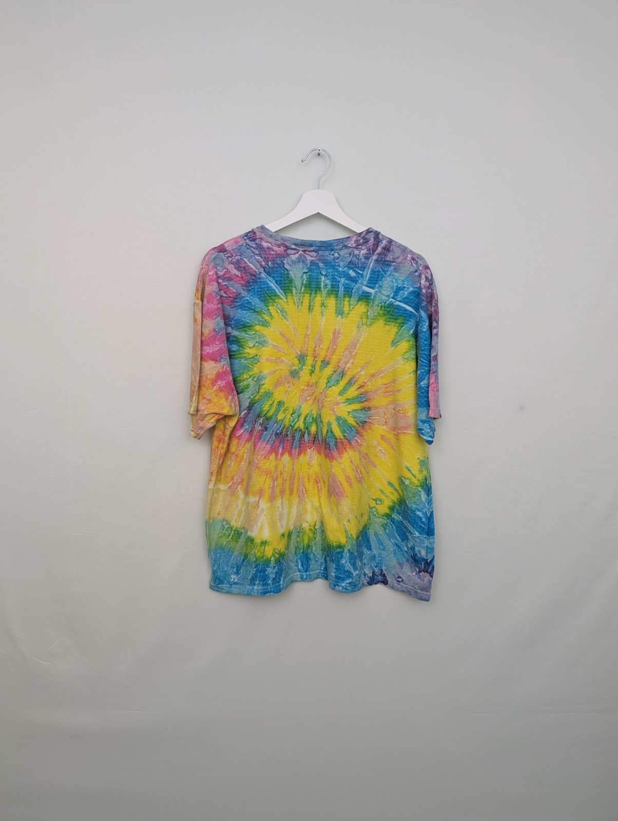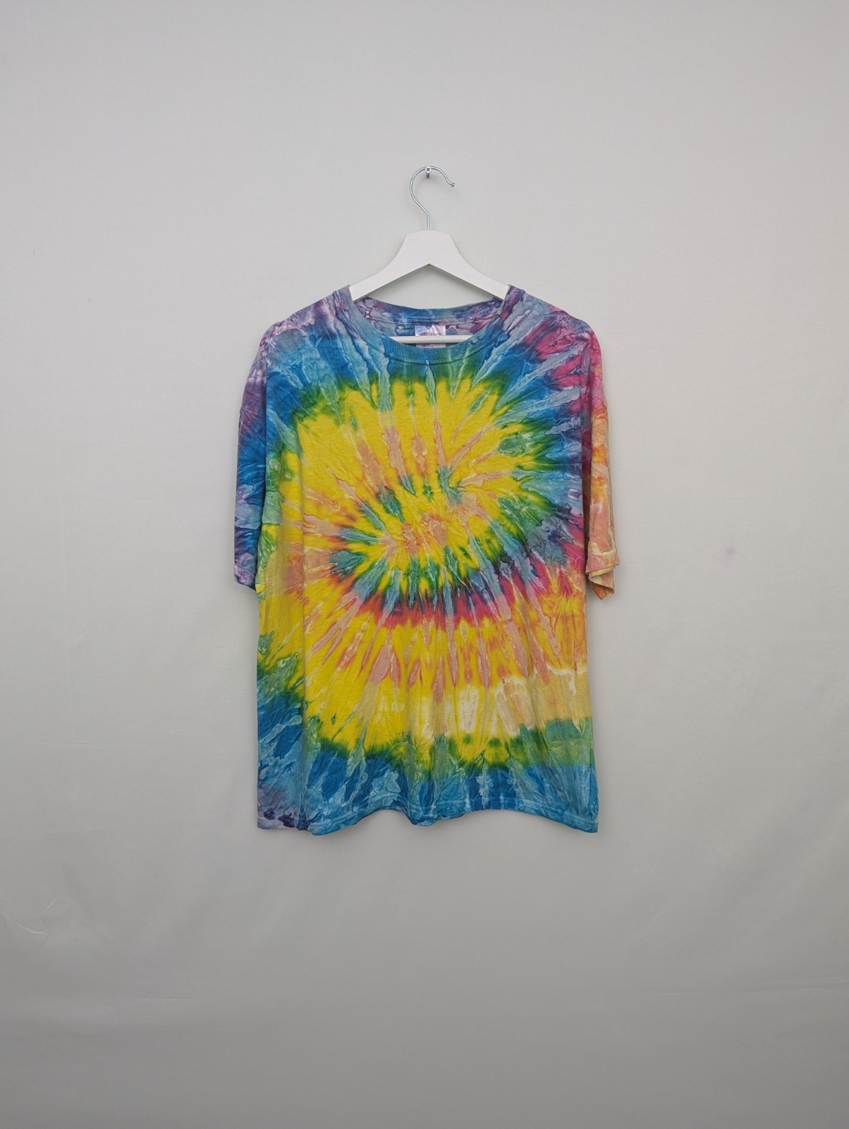 Tie dye T-shirt on a Hanes Heavyweight cotton blank featuring vibrant rainbow spiral pattern across the front and back.