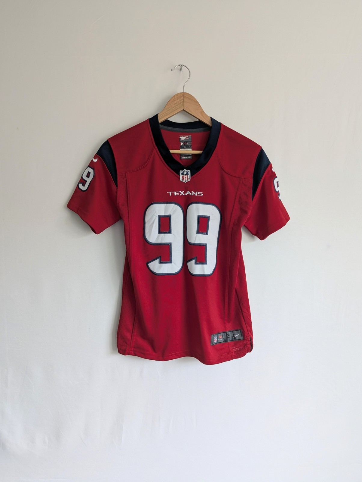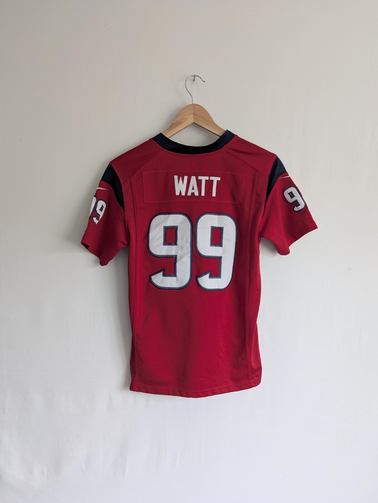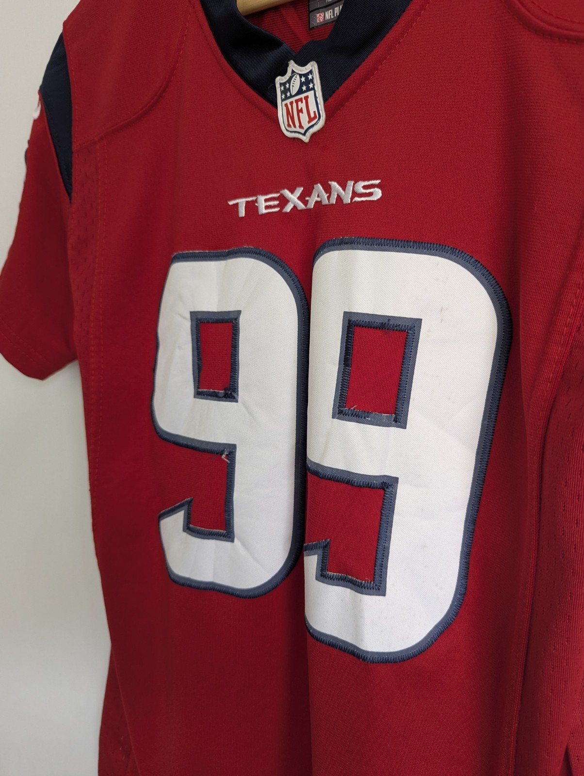 Houston Texans NFL jersey featuring JJ Watt #99 in classic red colourway with front and back printed graphics.