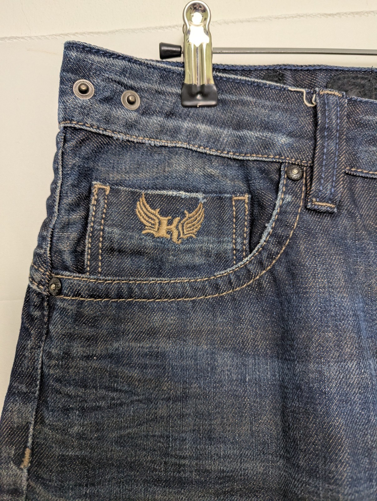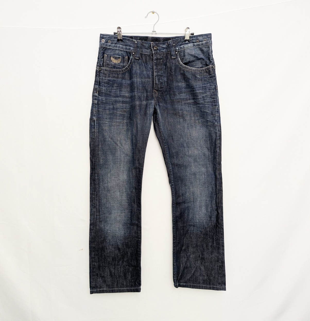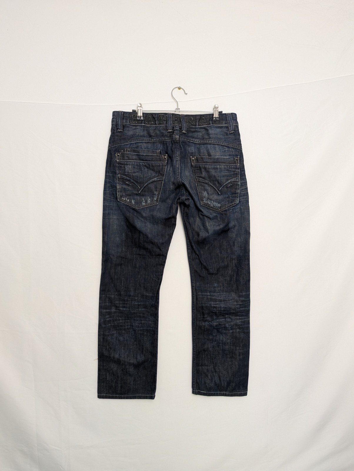 A quality pair of Kaporal 5 jeans in a deep indigo wash with signature heavy whiskering and contrast stitching. Classic five-pocket style with embroidered wing logo on the coin pocket and “KAPORAL” branding across the back waistband.