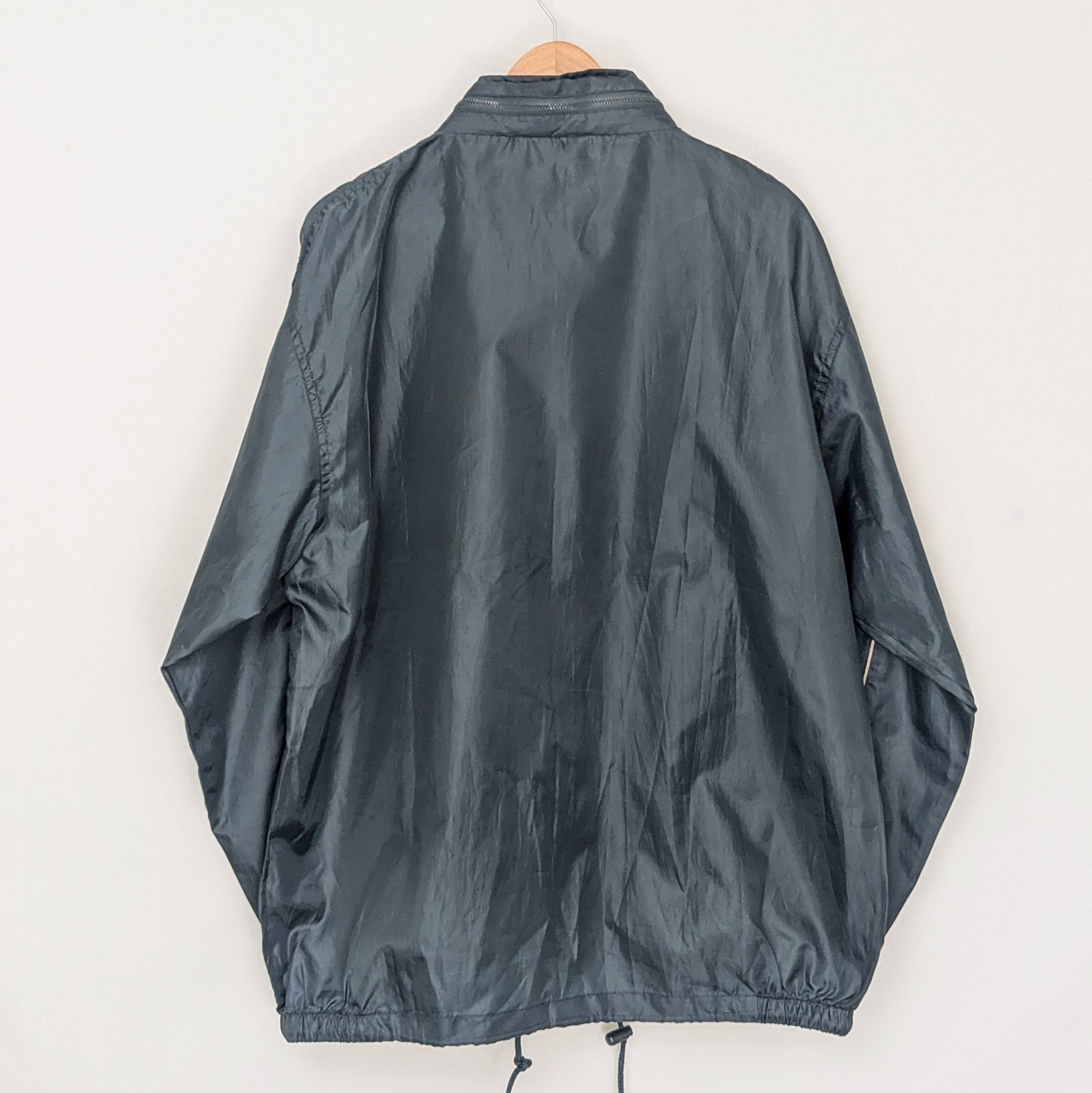 Classic vintage windbreaker jacket in a sought-after dark green colourway. Features a hidden hood zipped into the collar and lightweight breathable design, ideal for everyday wear.