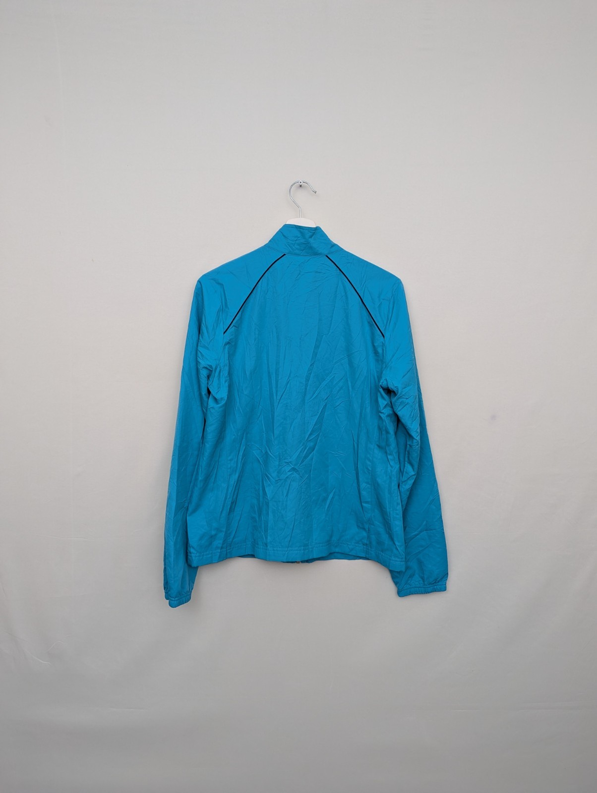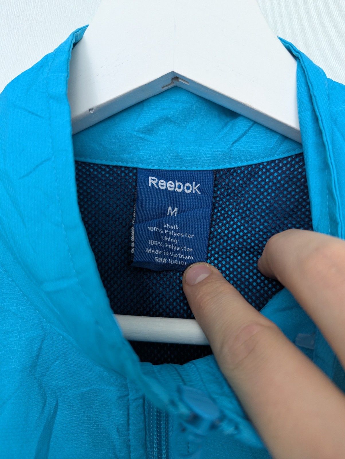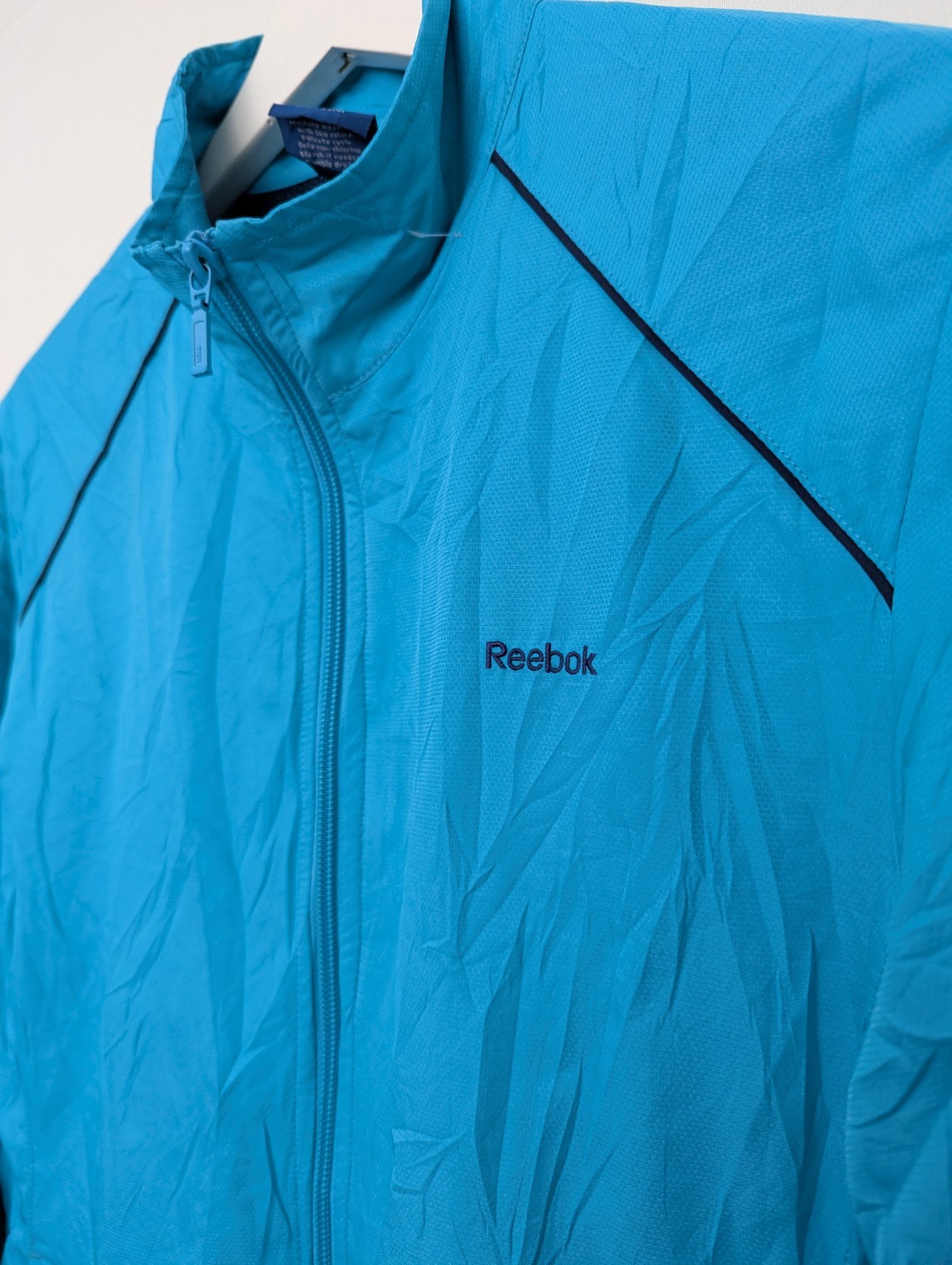 Reebok lightweight windbreaker jacket in a bright blue colourway with subtle black piping details and small embroidered Reebok logo on the chest.