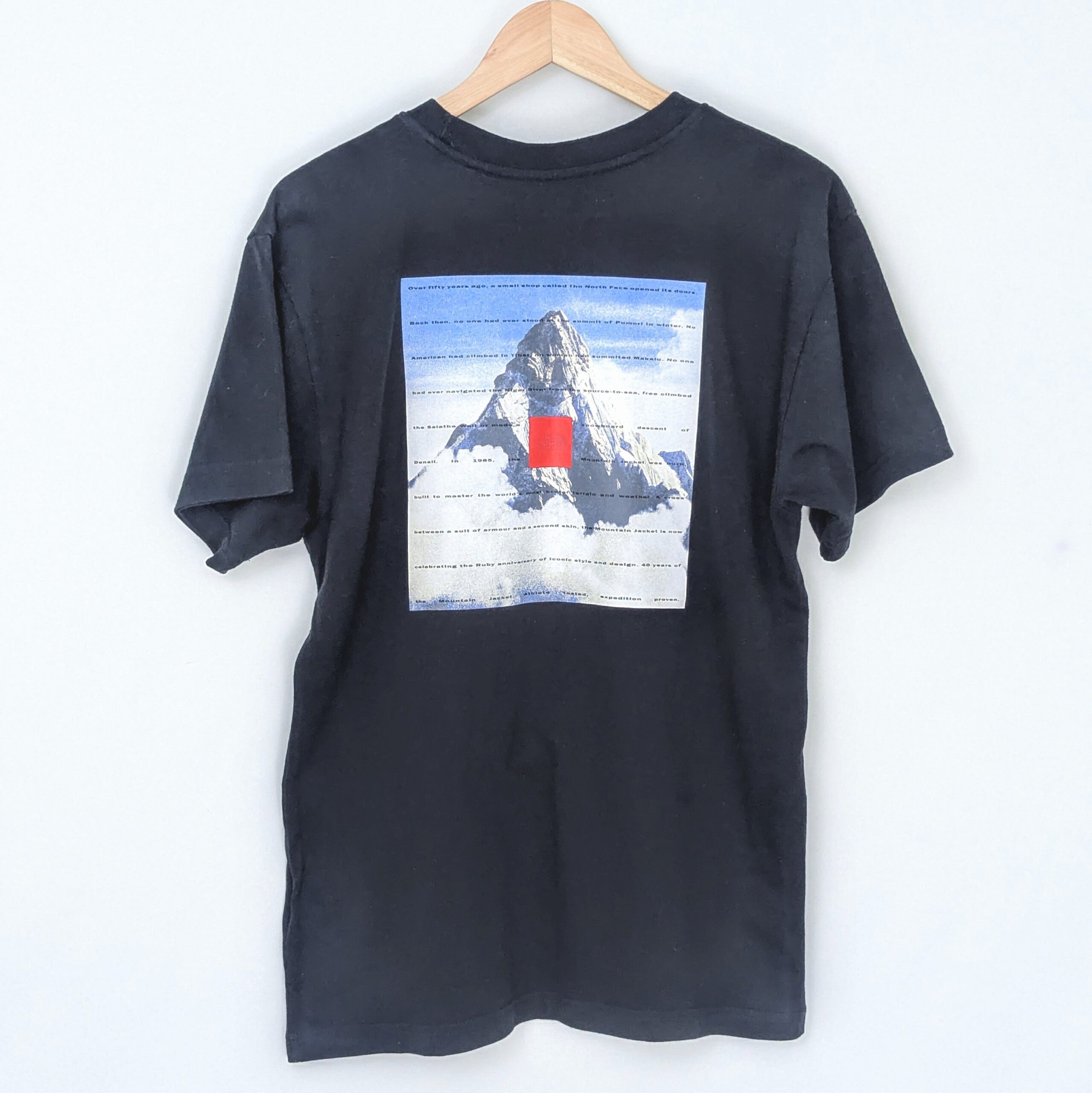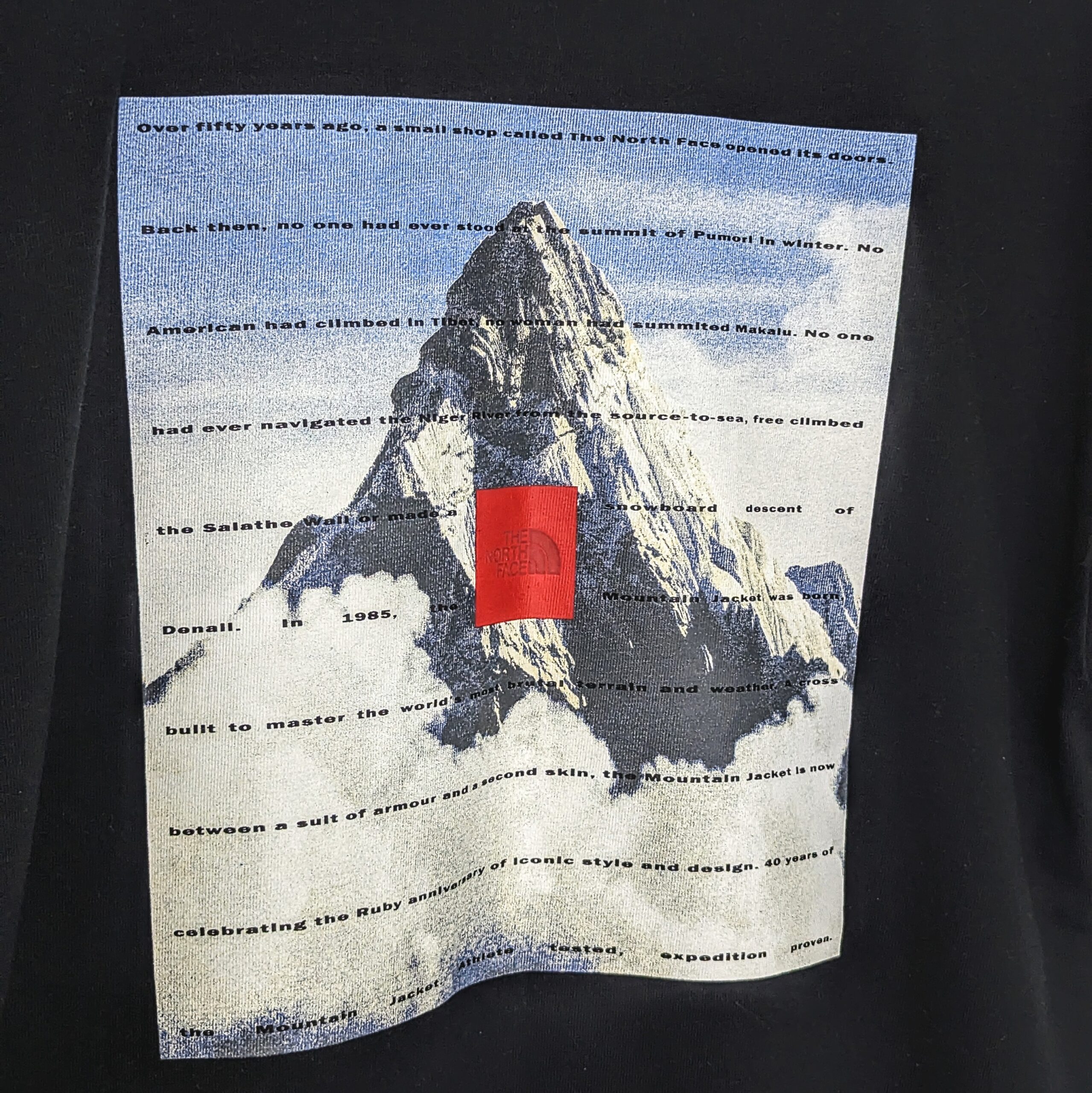 The North Face 40th anniversary t-shirt released in 2025, featuring a large mountain graphic on the back with printed text referencing the brand’s heritage.