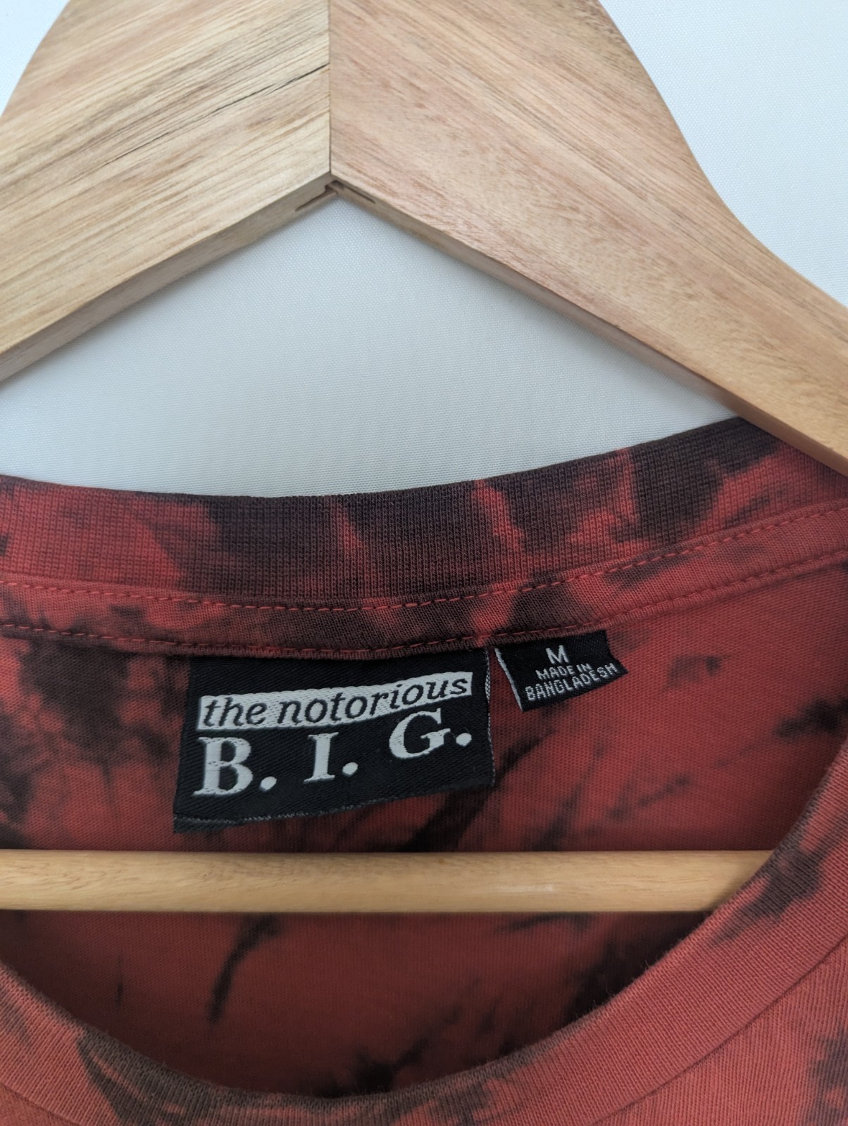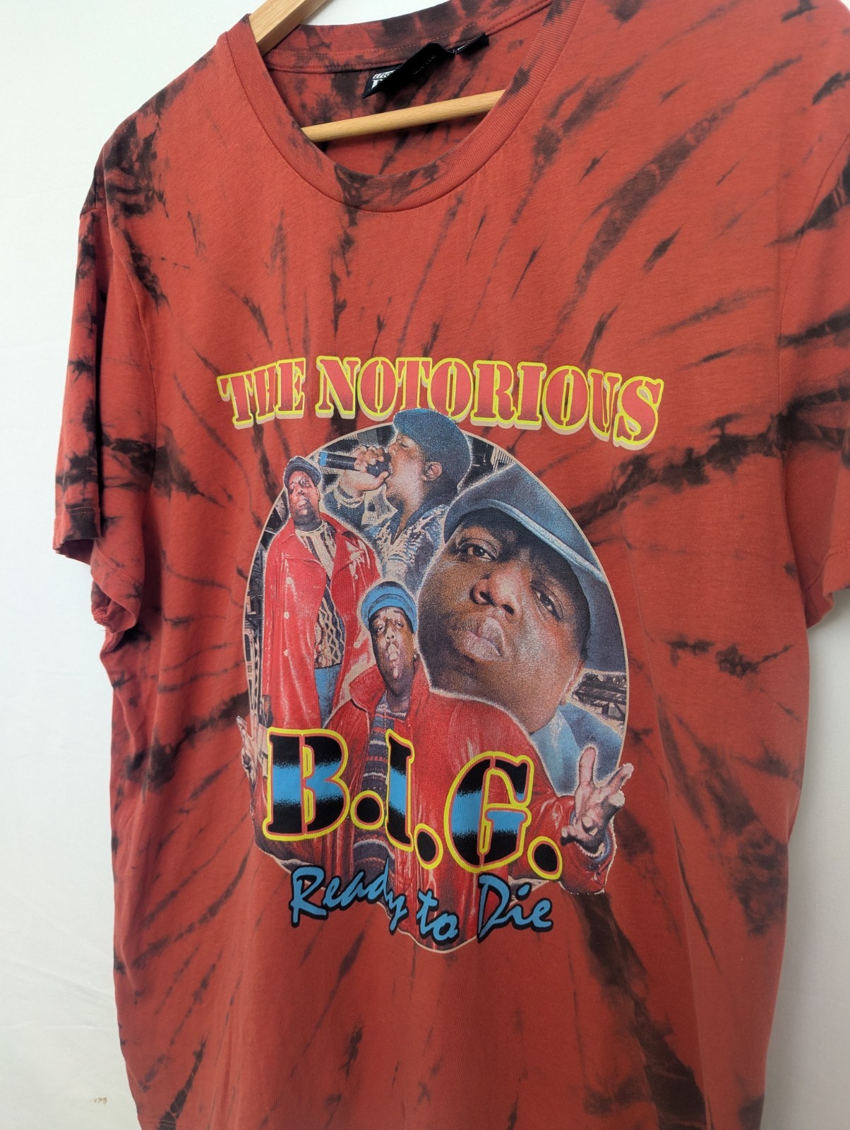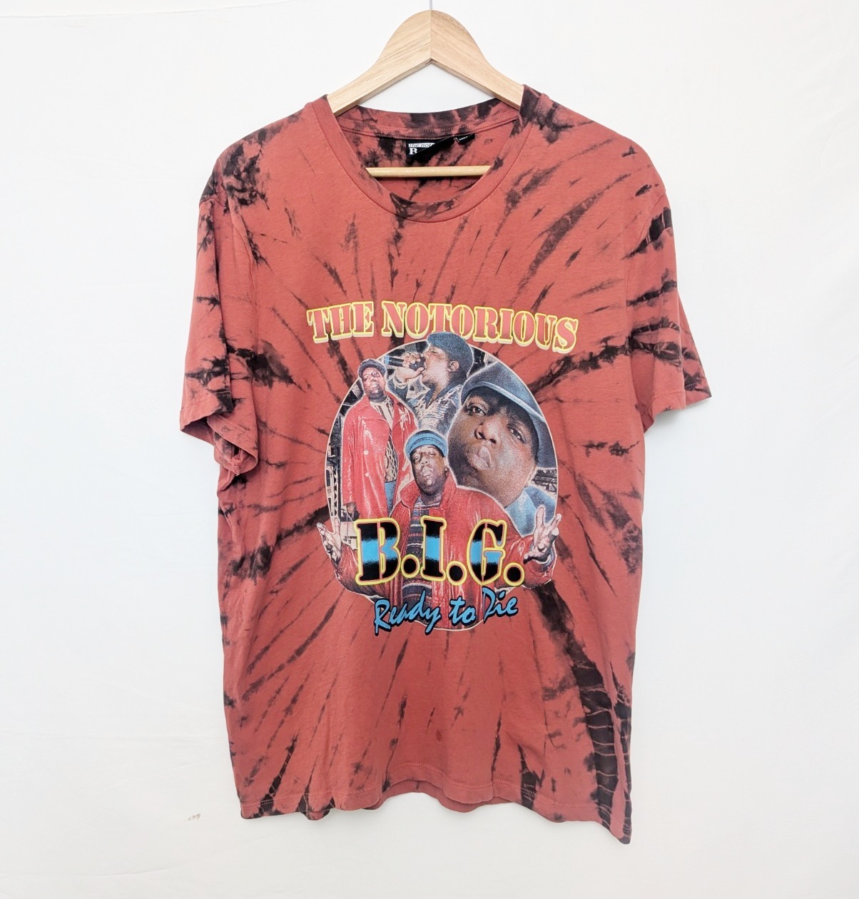 Officially licensed The Notorious B.I.G. “Ready to Die” T-shirt featuring a bold multicolour front print on a red and black tie-dye cotton base.