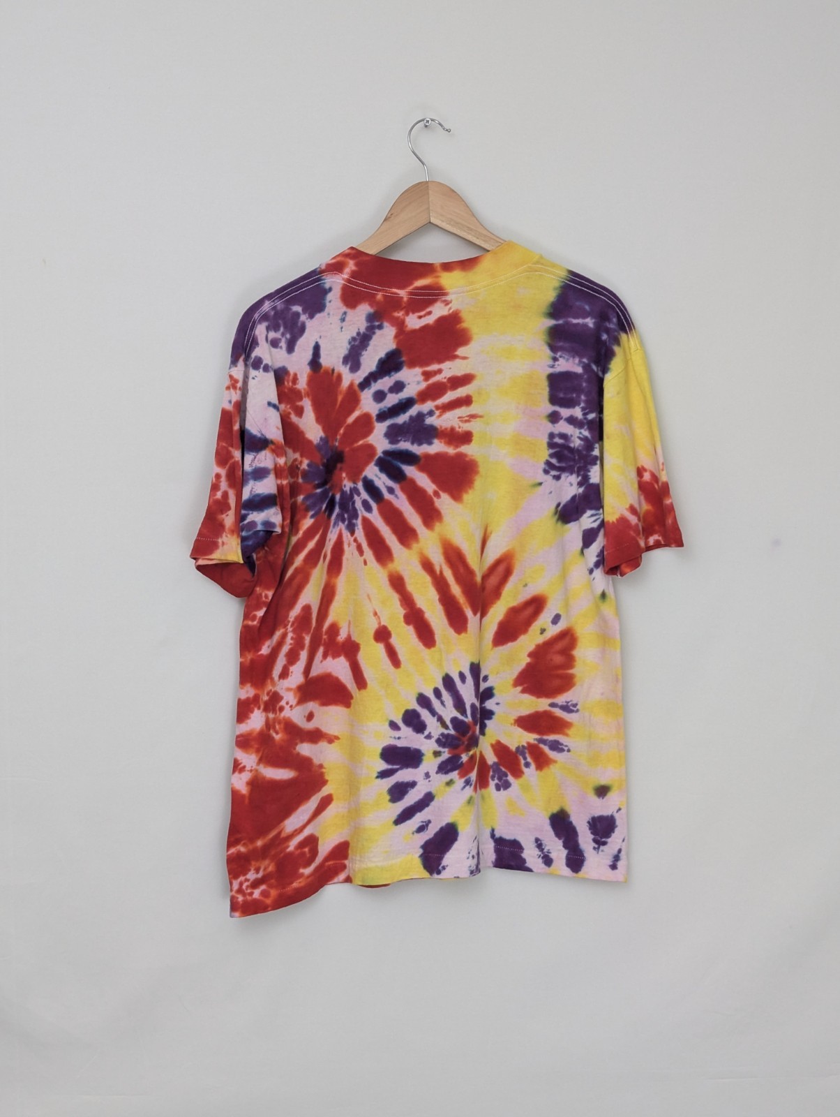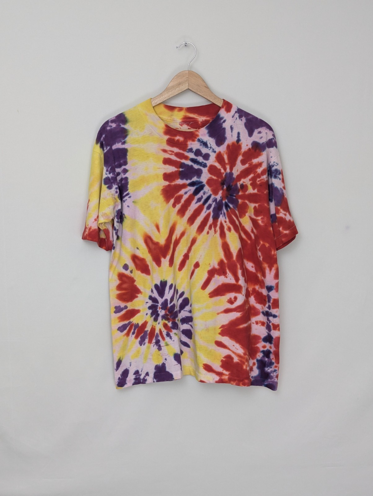 Tie dye t shirt featuring bold spiral pattern in red, yellow and purple colours.