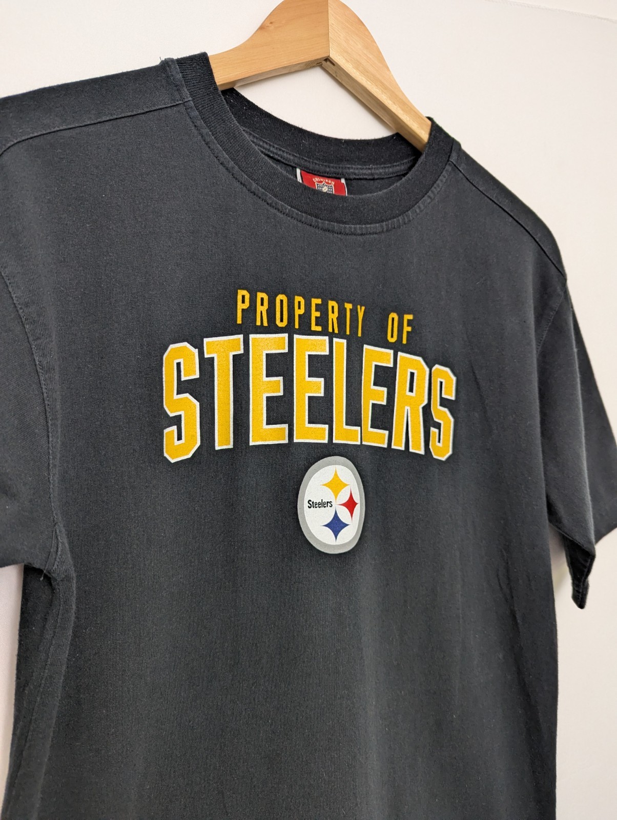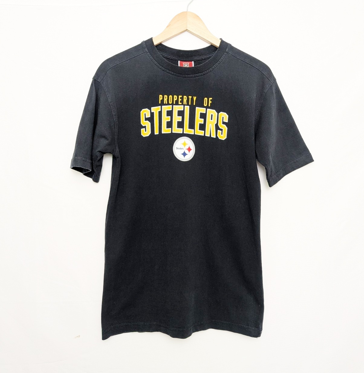 Original mid-2000s NFL Reebok tee featuring bold yellow “PROPERTY OF STEELERS” lettering and classic team logo.