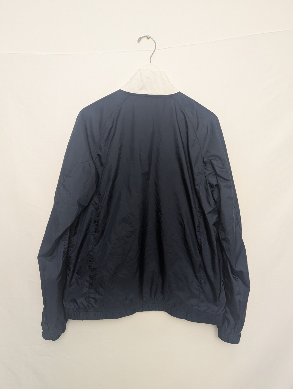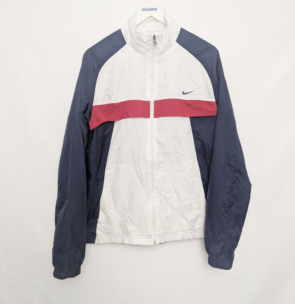 Clean Nike Sportswear windbreaker from the late 2000s (Holiday 2009 release). Lightweight nylon shell with signature red chest stripe and embroidered swoosh.