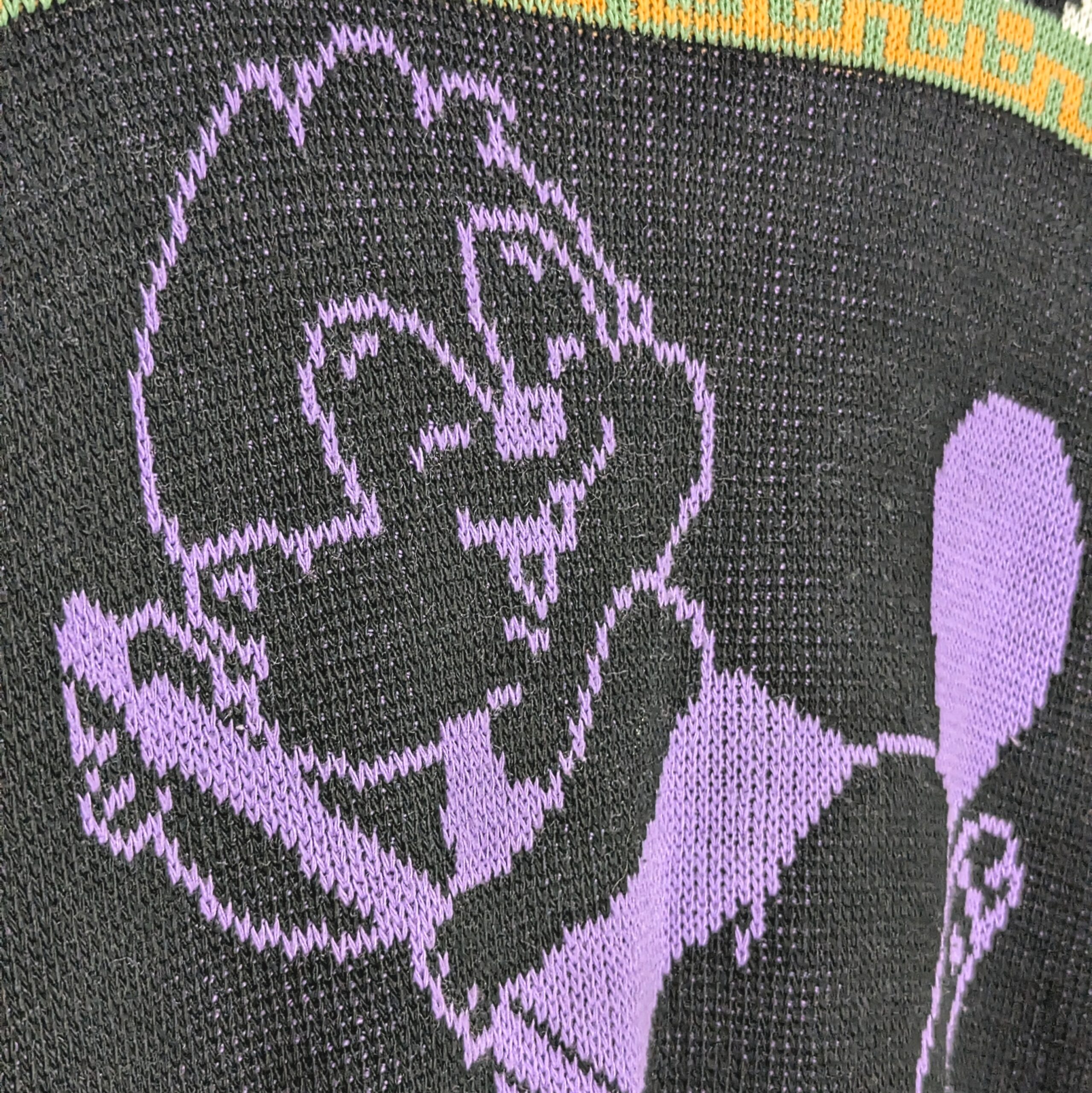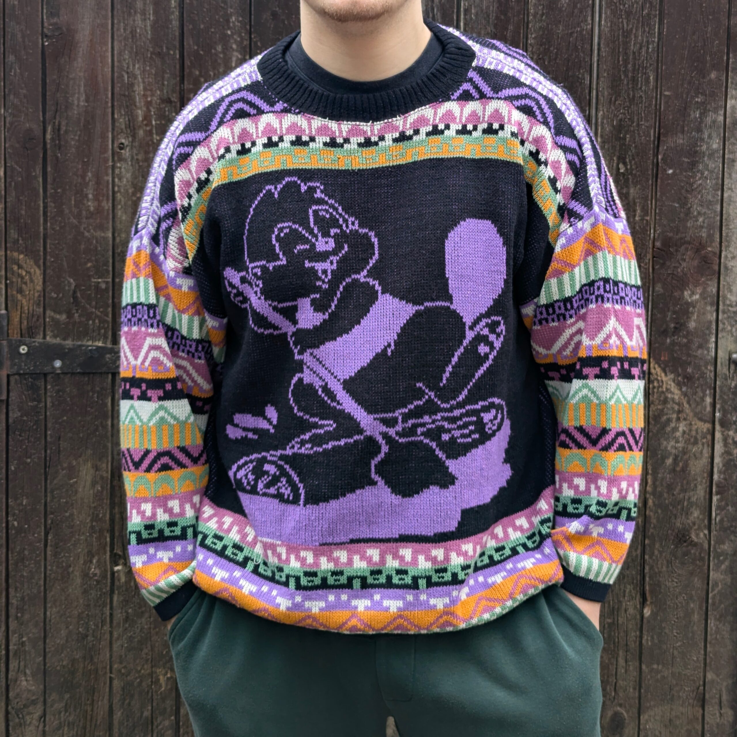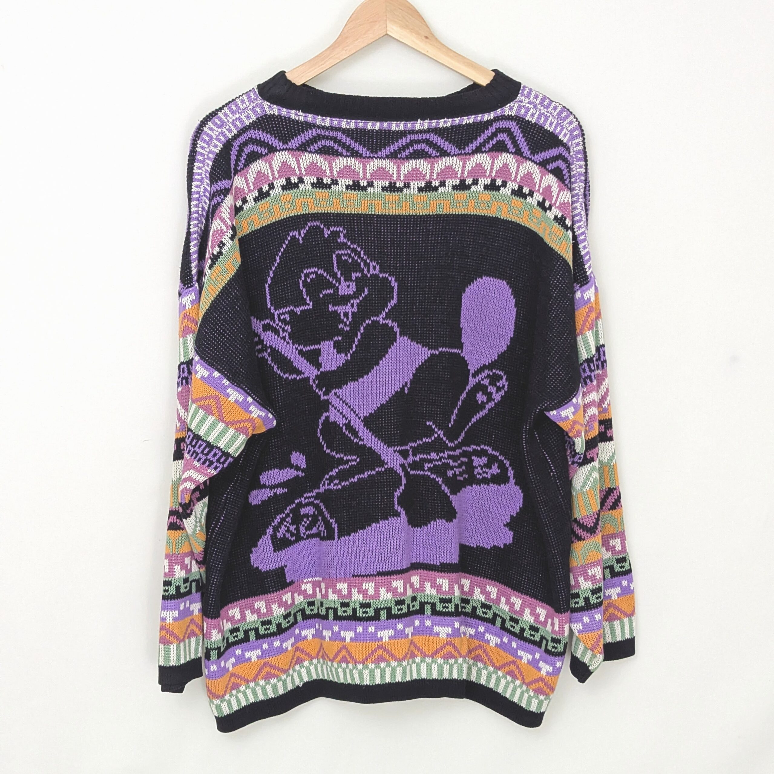 Vintage cartoon knit jumper from the 1990s. Features a bold graphic character design on a black base with purple detailing and multicolour patterned sleeves.