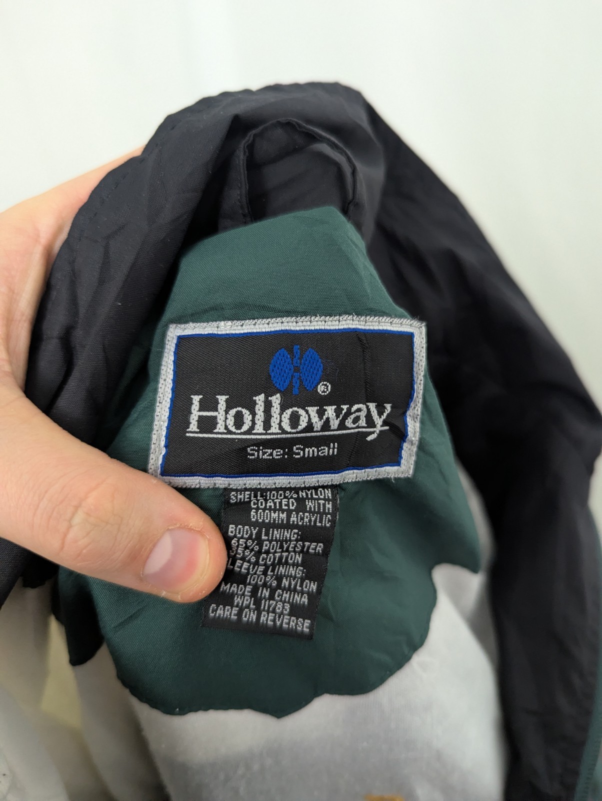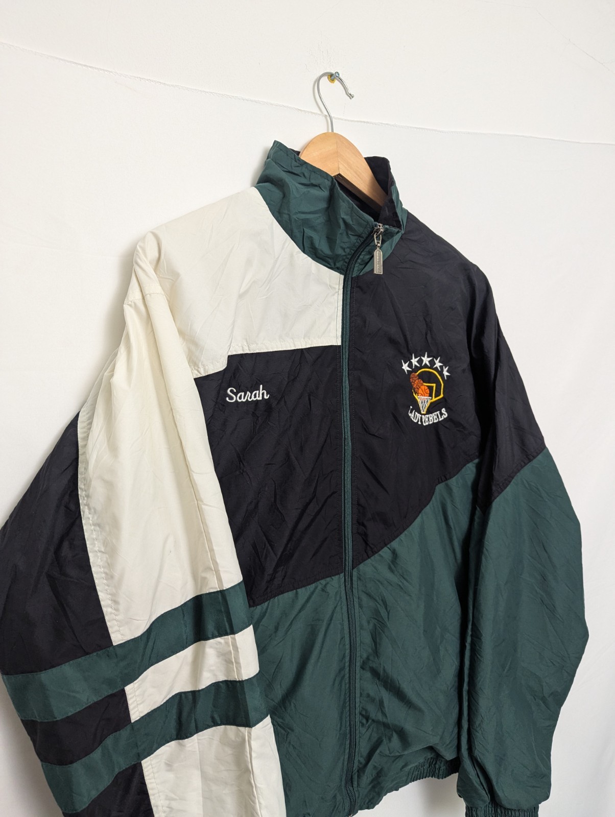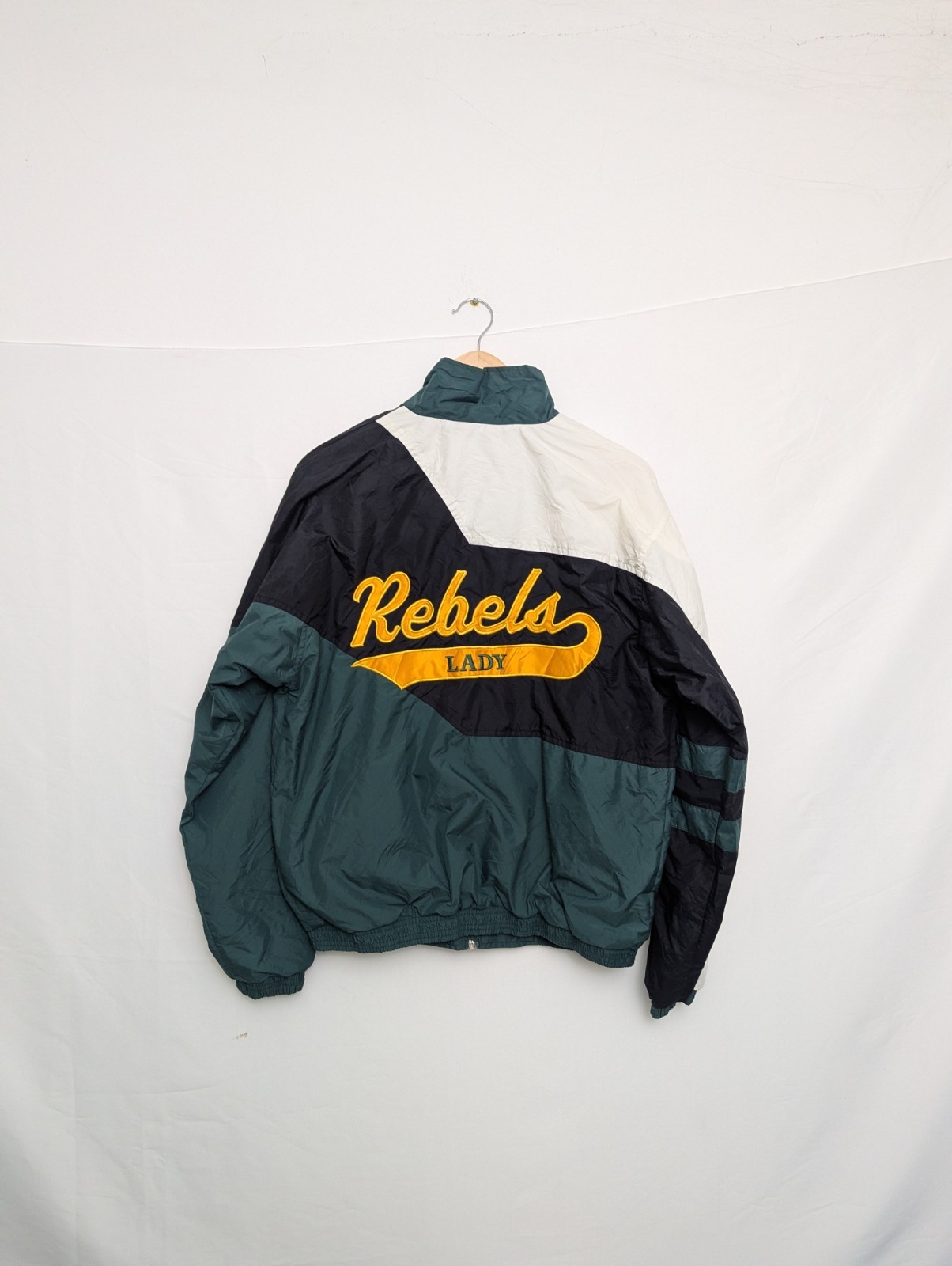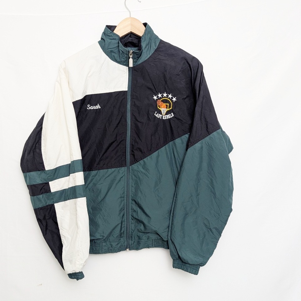 Authentic 1990s Holloway varsity/team warm-up jacket. Features teal, cream and black colour-block panels, embroidered front logo and name, plus large “Lady Rebels” chenille-style patch across the back.
