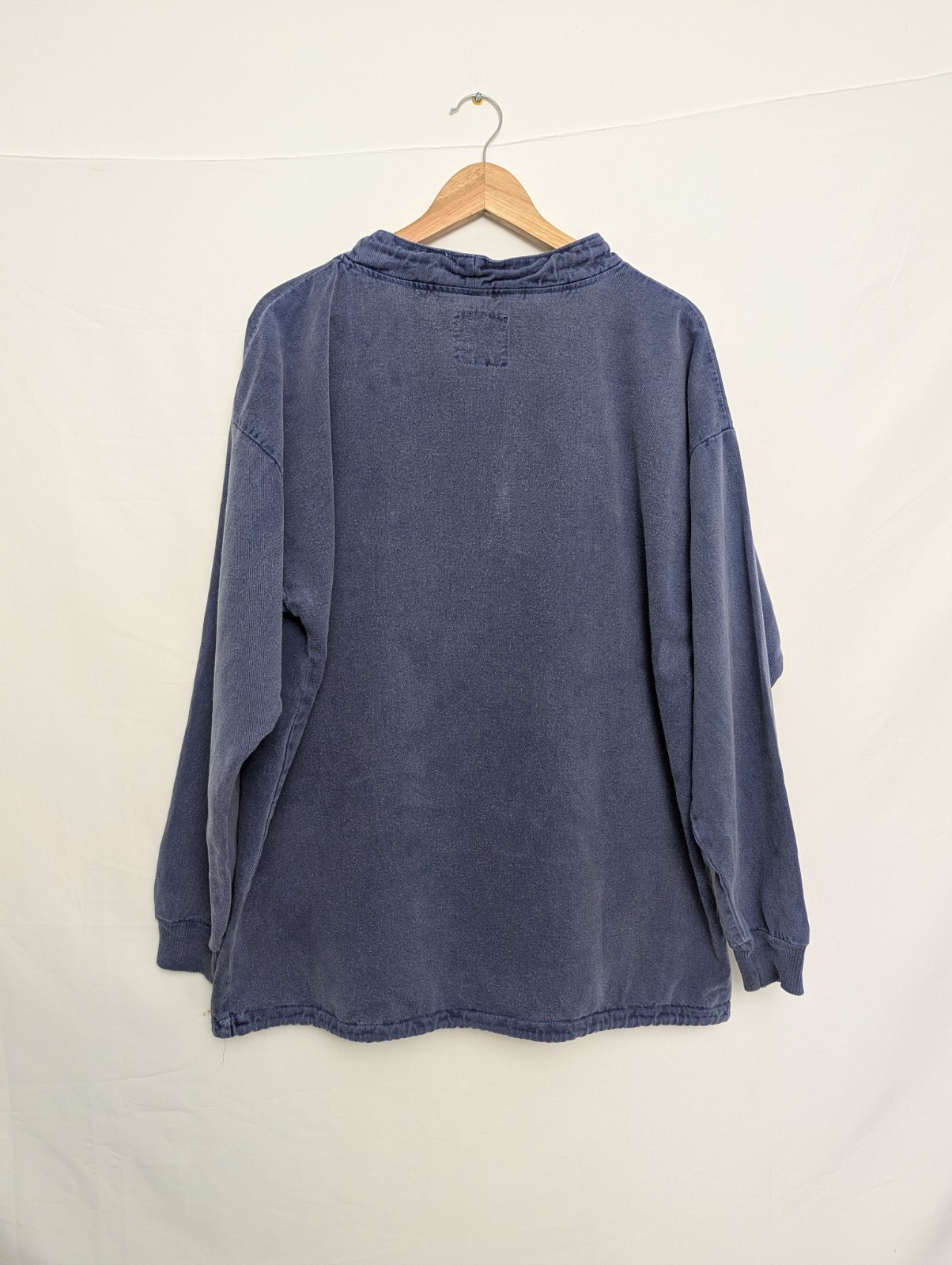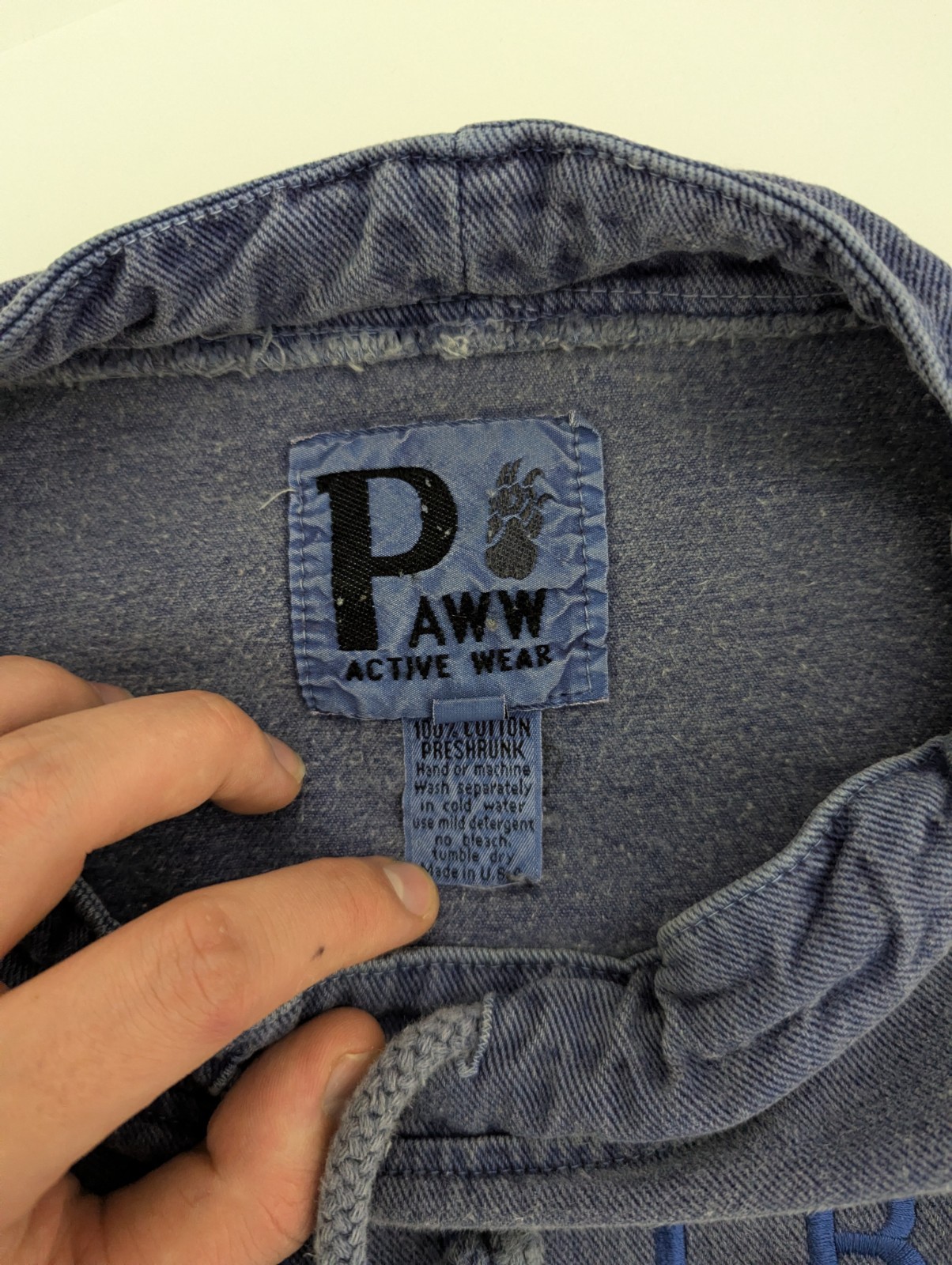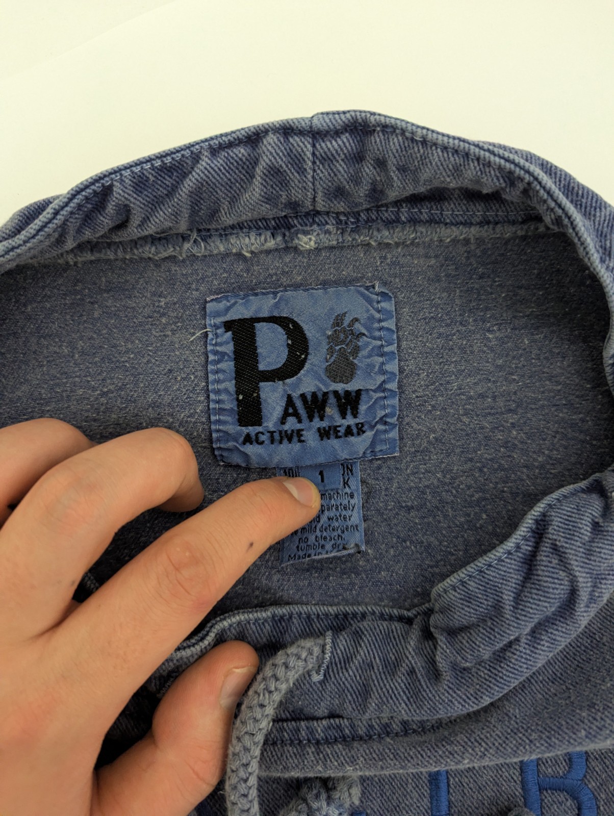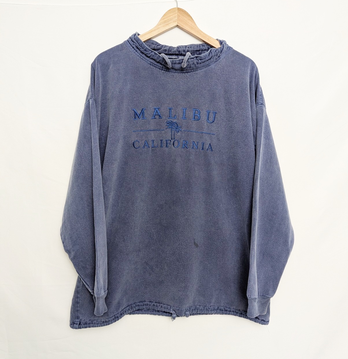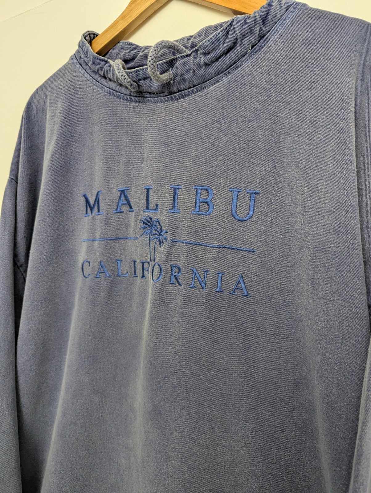 Vintage early 90s PAWW Active Wear sweatshirt with Malibu California embroidered graphic. Made in USA, 100% preshrunk cotton, washed blue colour with a soft worn-in feel. Relaxed boxy fit typical of 90s surf style. Small mark on the front and minor fraying to hem (shown).
