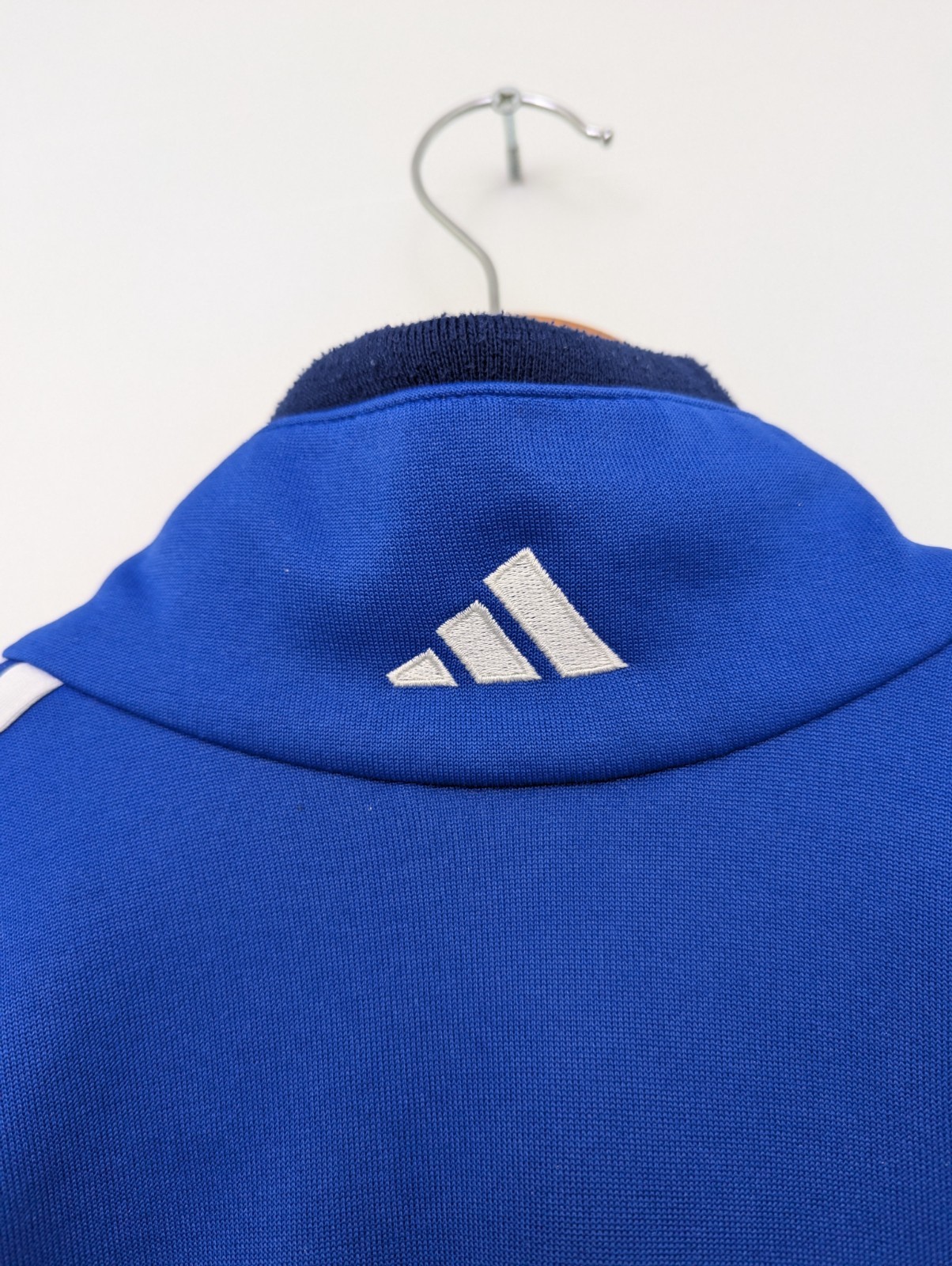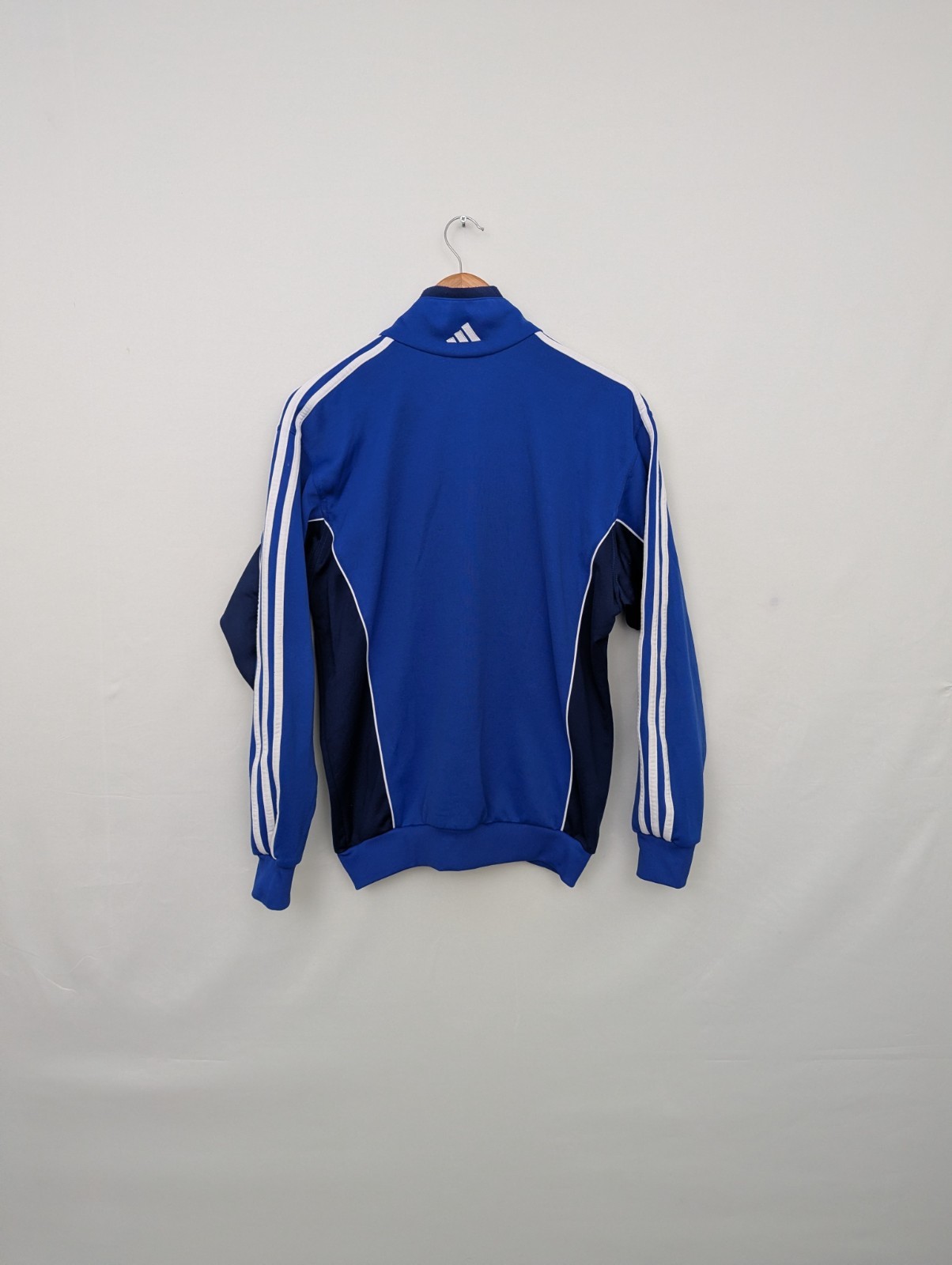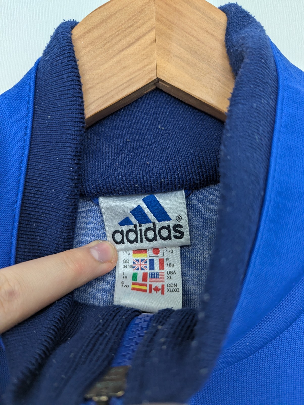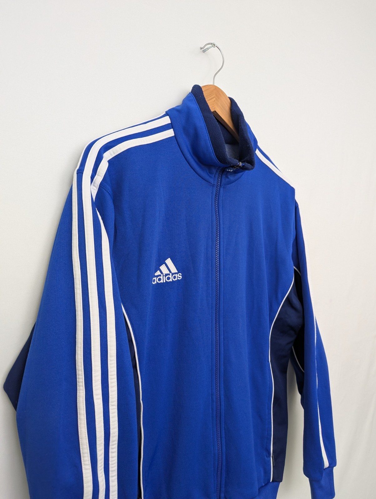 Classic vintage Adidas full-zip track jacket in royal blue with white three-stripe detailing along the sleeves and white piping down the sides. Features embroidered Adidas logos on the chest and back of the collar.