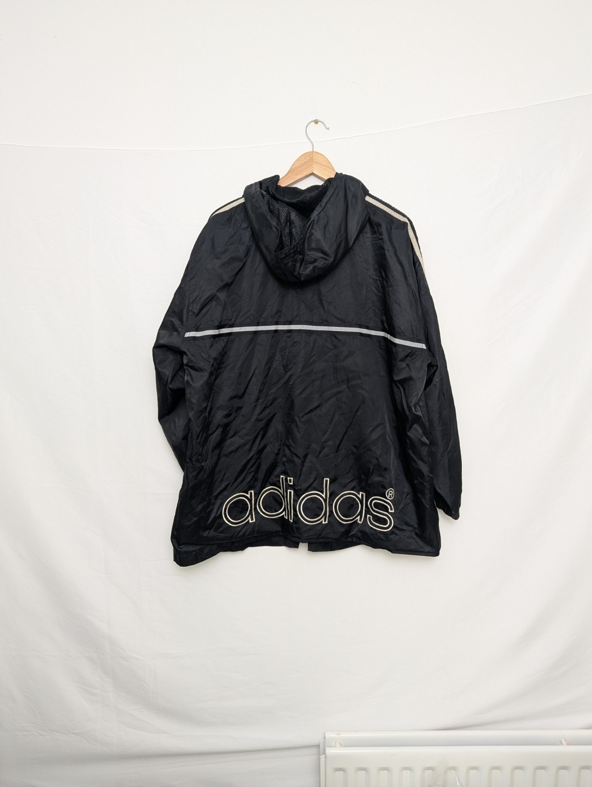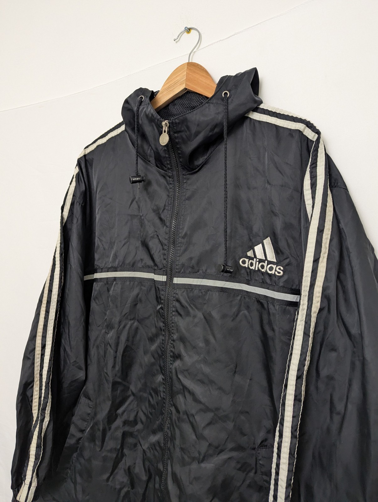 Original vintage Adidas hooded windbreaker jacket from the early 2000s. Features classic black colourway with white Adidas 3-stripe sleeves, mesh lining and large Adidas branding across the back hem.