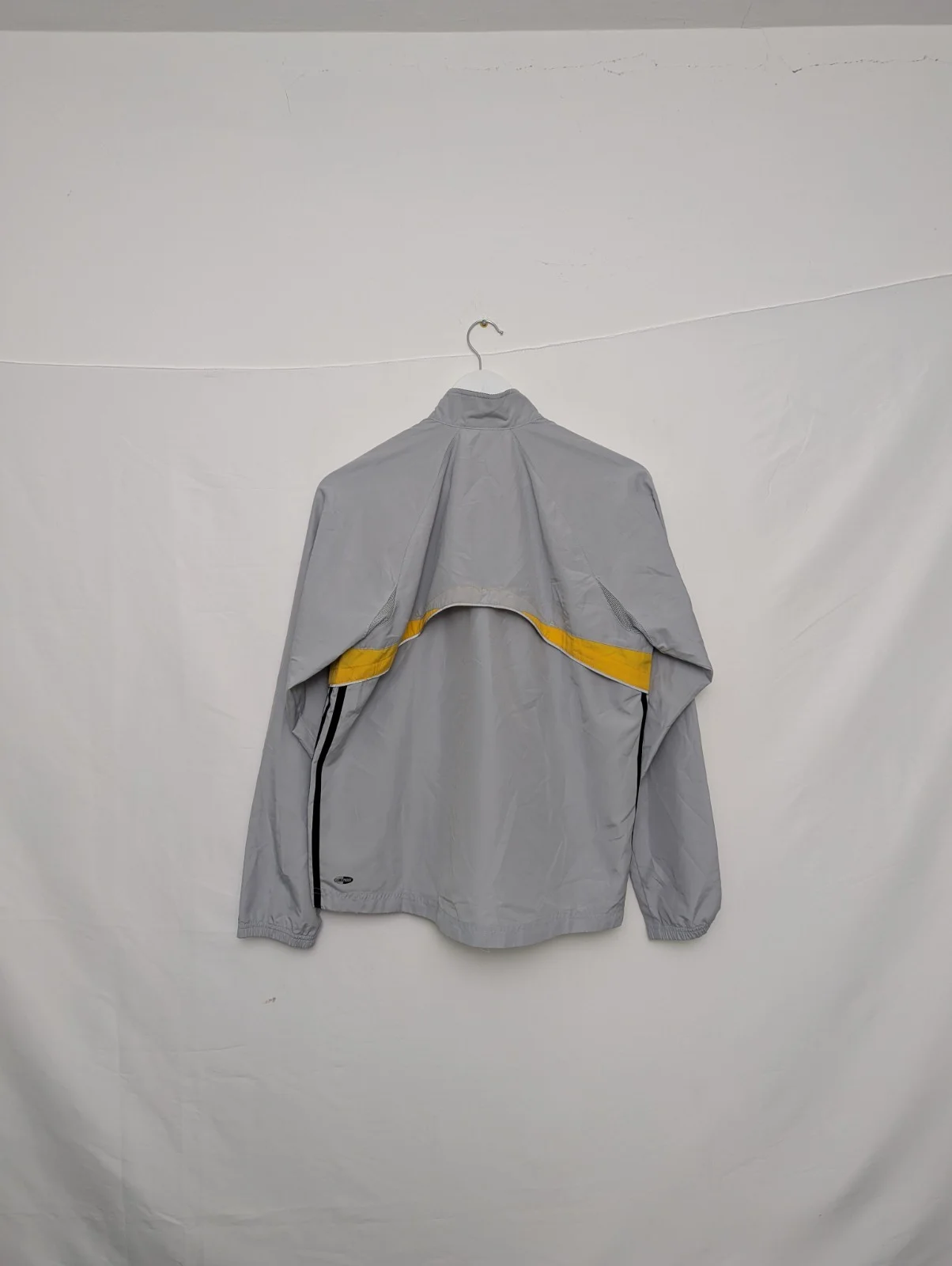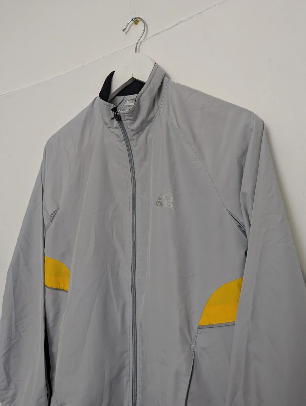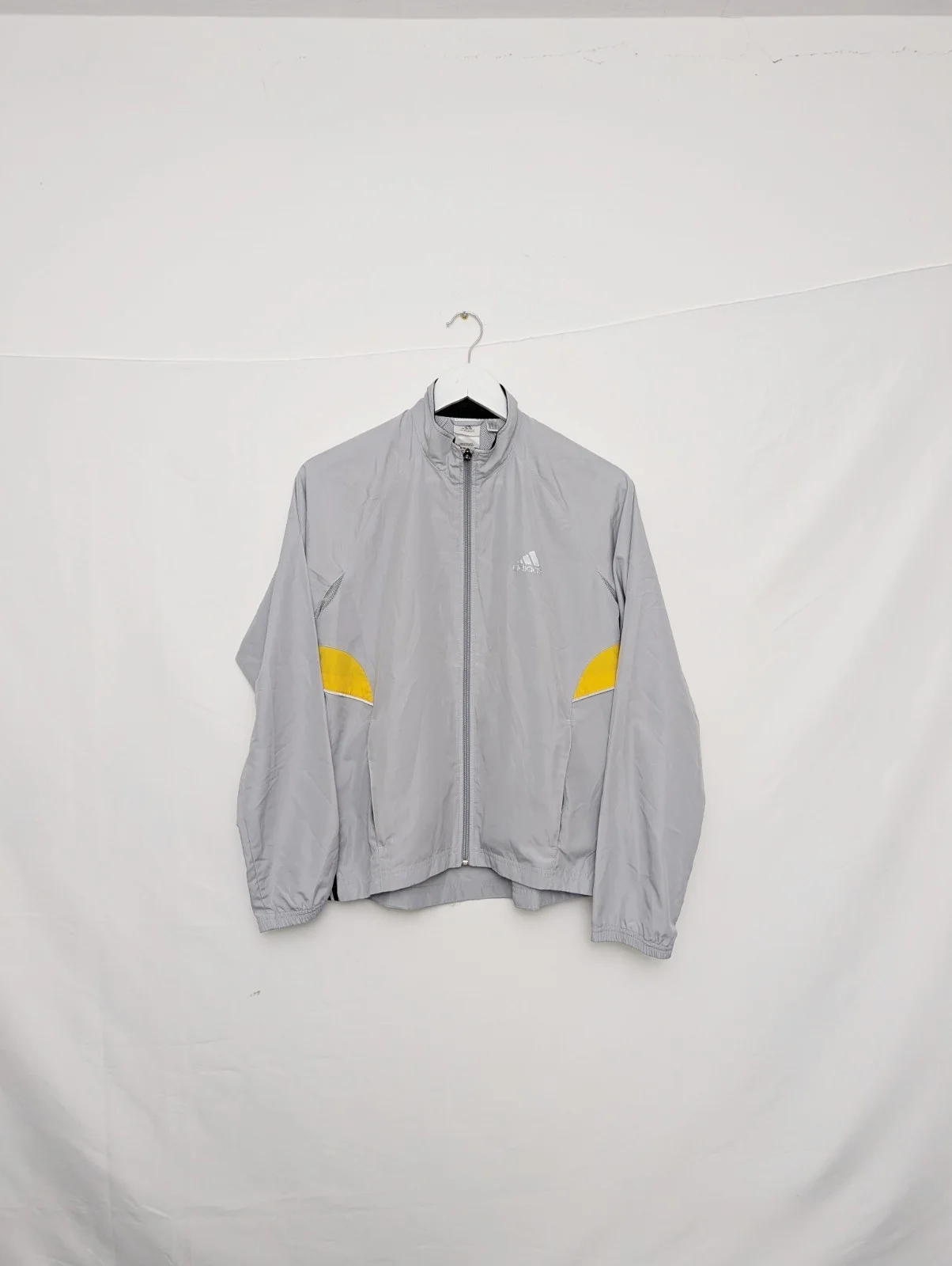 Original vintage Adidas lightweight jacket from the early 2000s. Features a grey shell with yellow accent panels, subtle Adidas chest logo and breathable mesh lining.