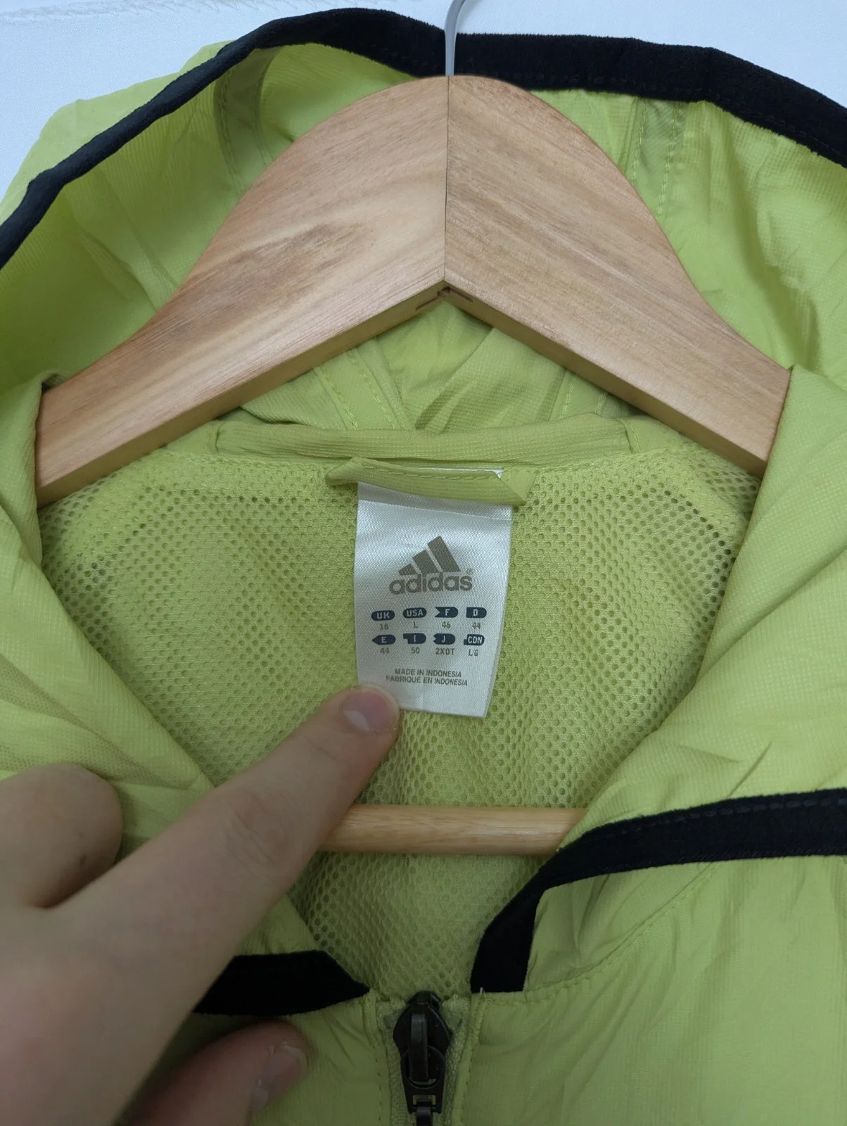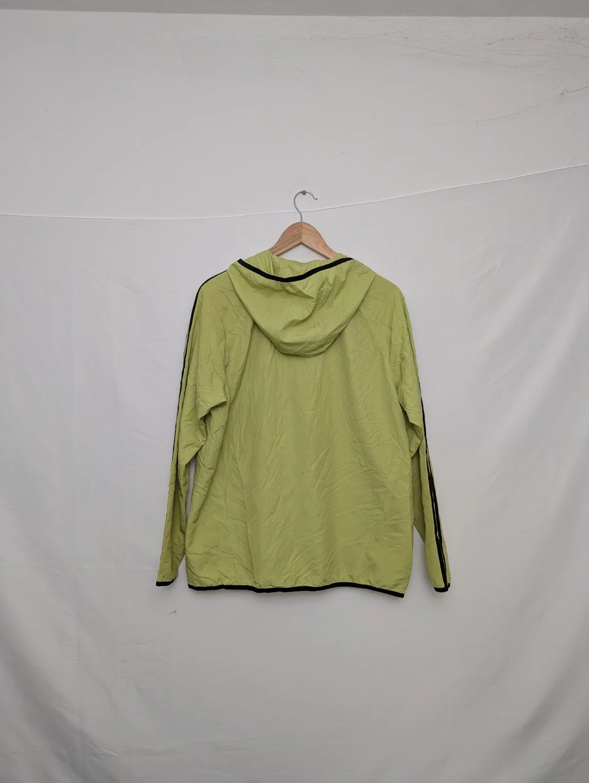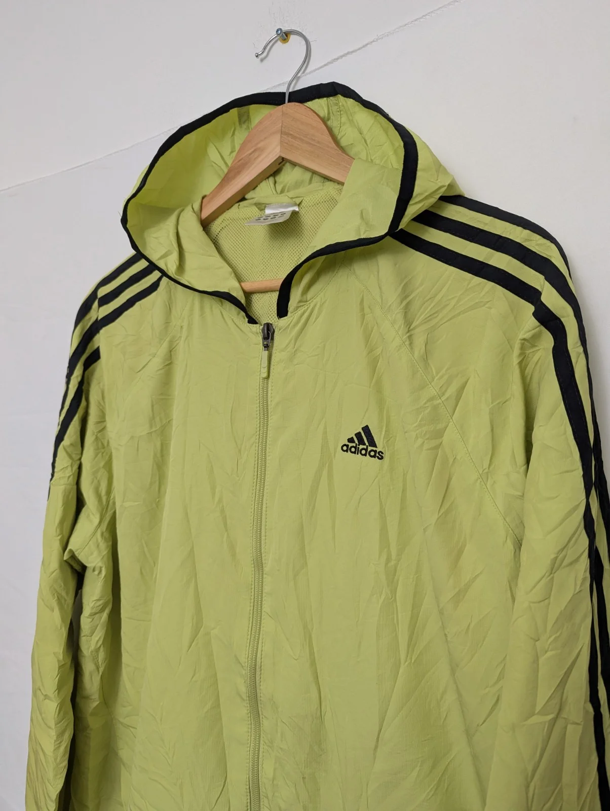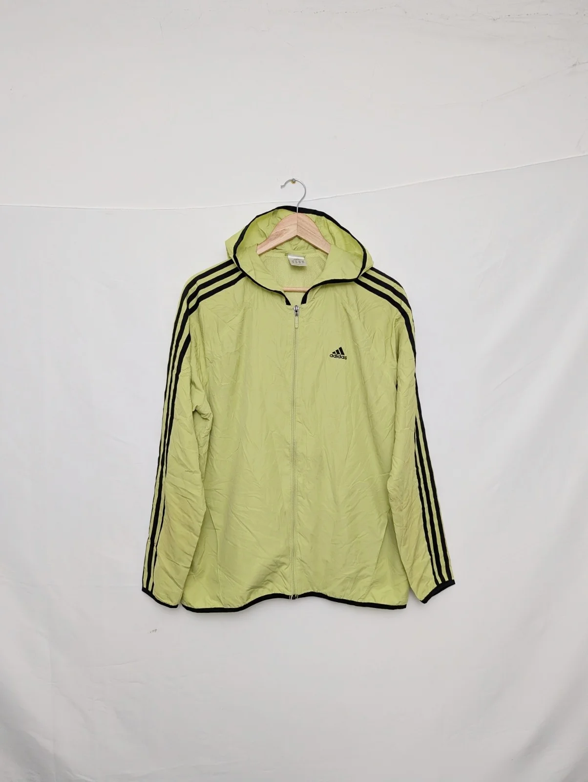 Vintage adidas hooded windbreaker jacket dating to the early–mid 2000s. Features a lime green nylon shell with black three-stripe detailing, full zip front, attached hood and breathable mesh lining.