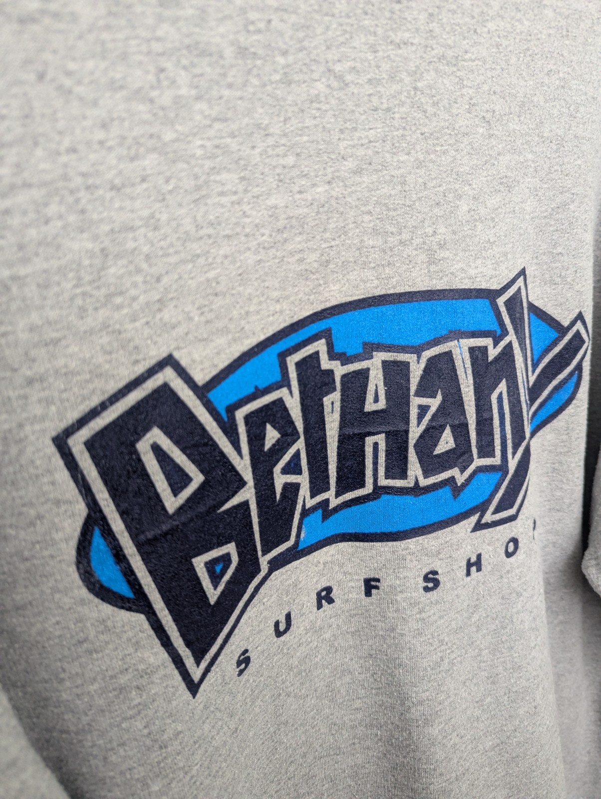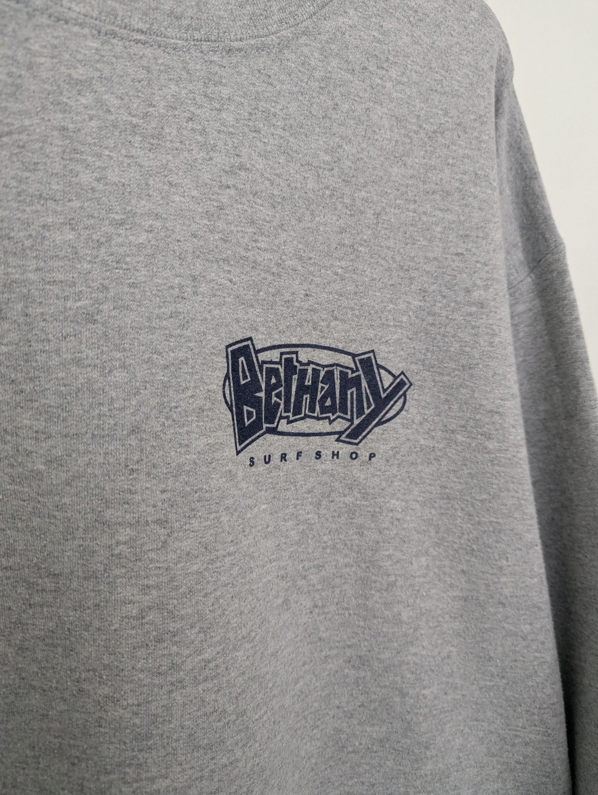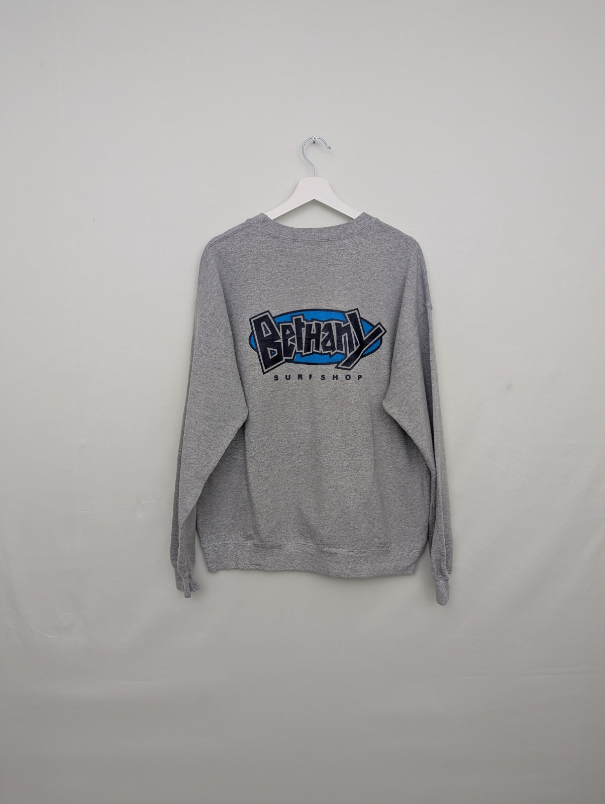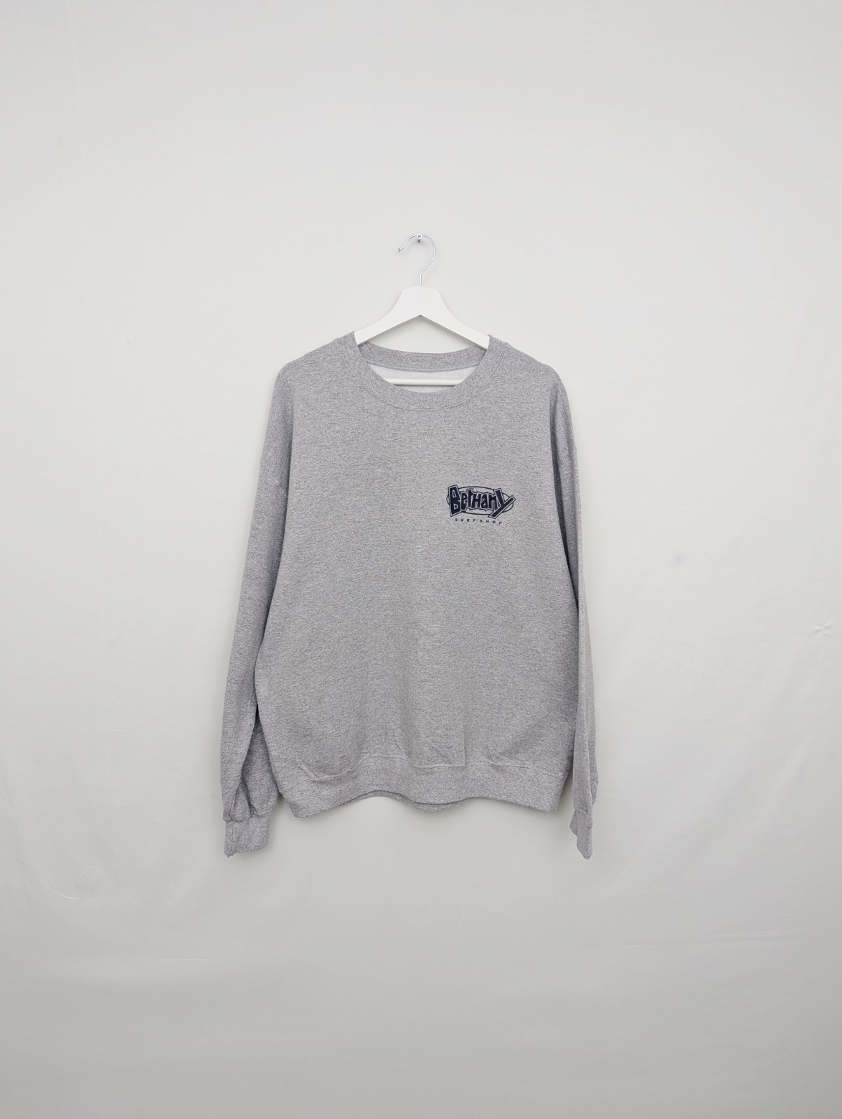 Vintage Bethany Surf Shop crewneck sweatshirt in a grey heather colourway. Features a small front chest logo and a large bold graphic on the back in navy and blue, typical of late-1990s to early-2000s surf shop apparel.