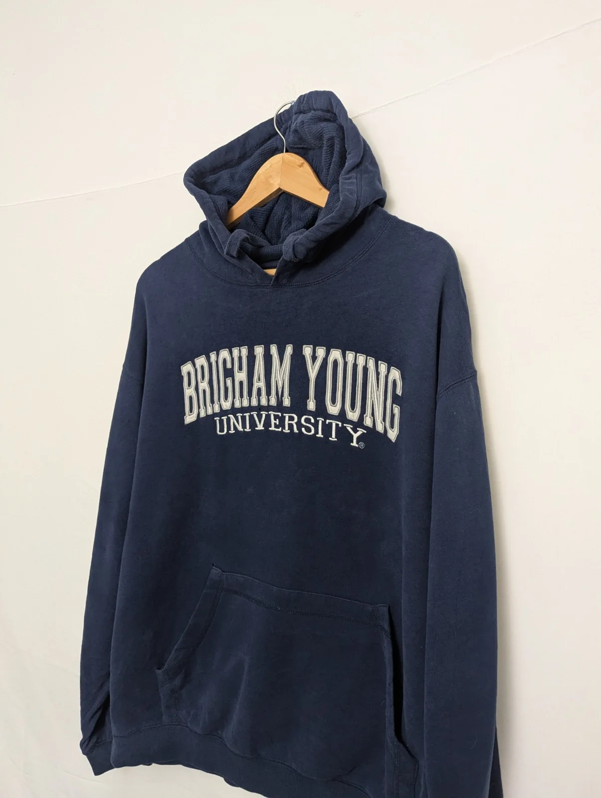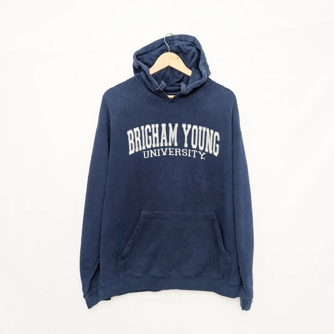Vintage Brigham Young University hoodie in navy blue with classic collegiate chest lettering. Features a relaxed, boxy fit with a slightly shorter length, typical of late 1990s / early 2000s US college sweatshirts.
