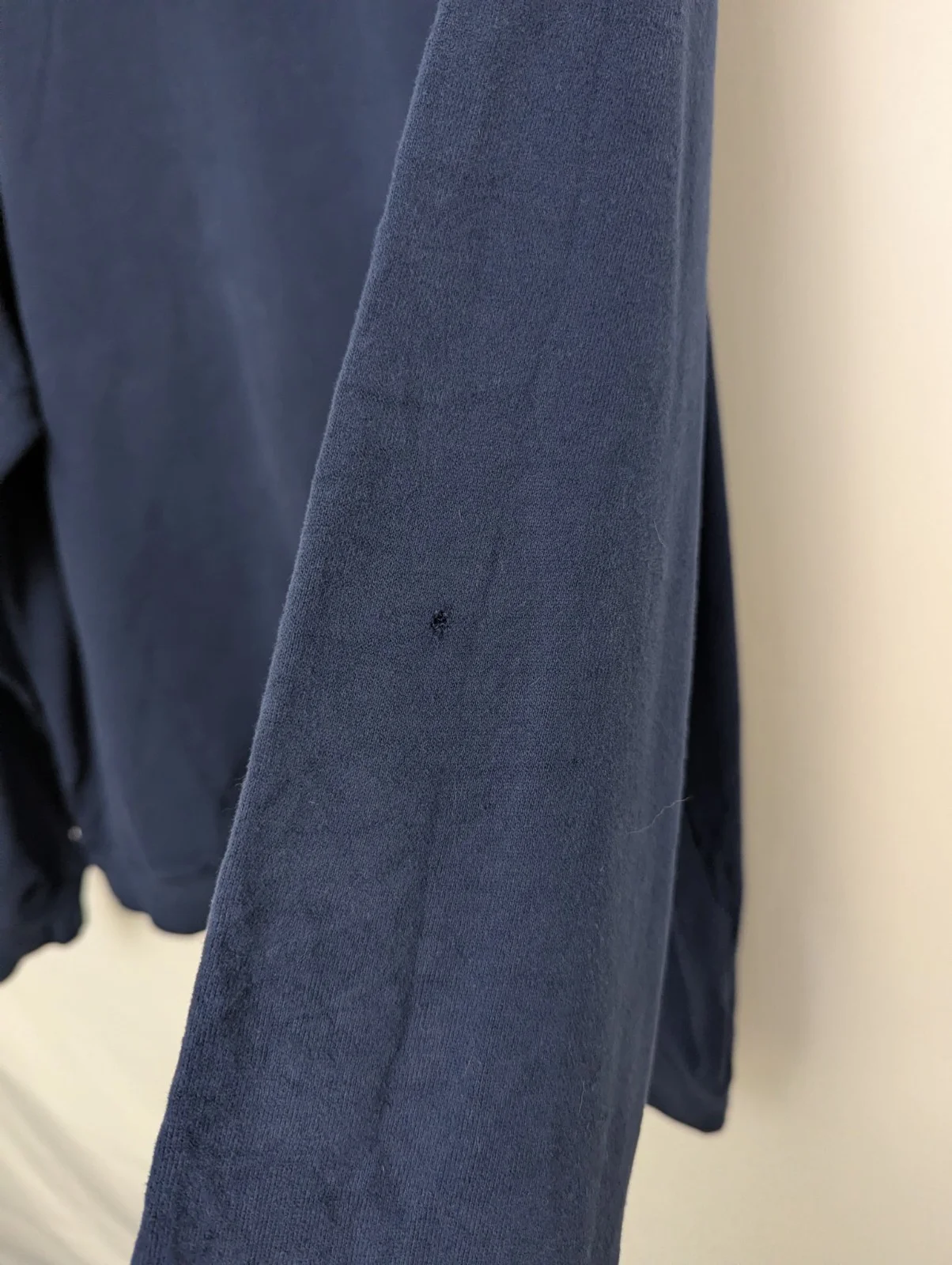Condition: Good vintage condition with two small holes as shown in photos (one on sleeve, one near shoulder). No major flaws.