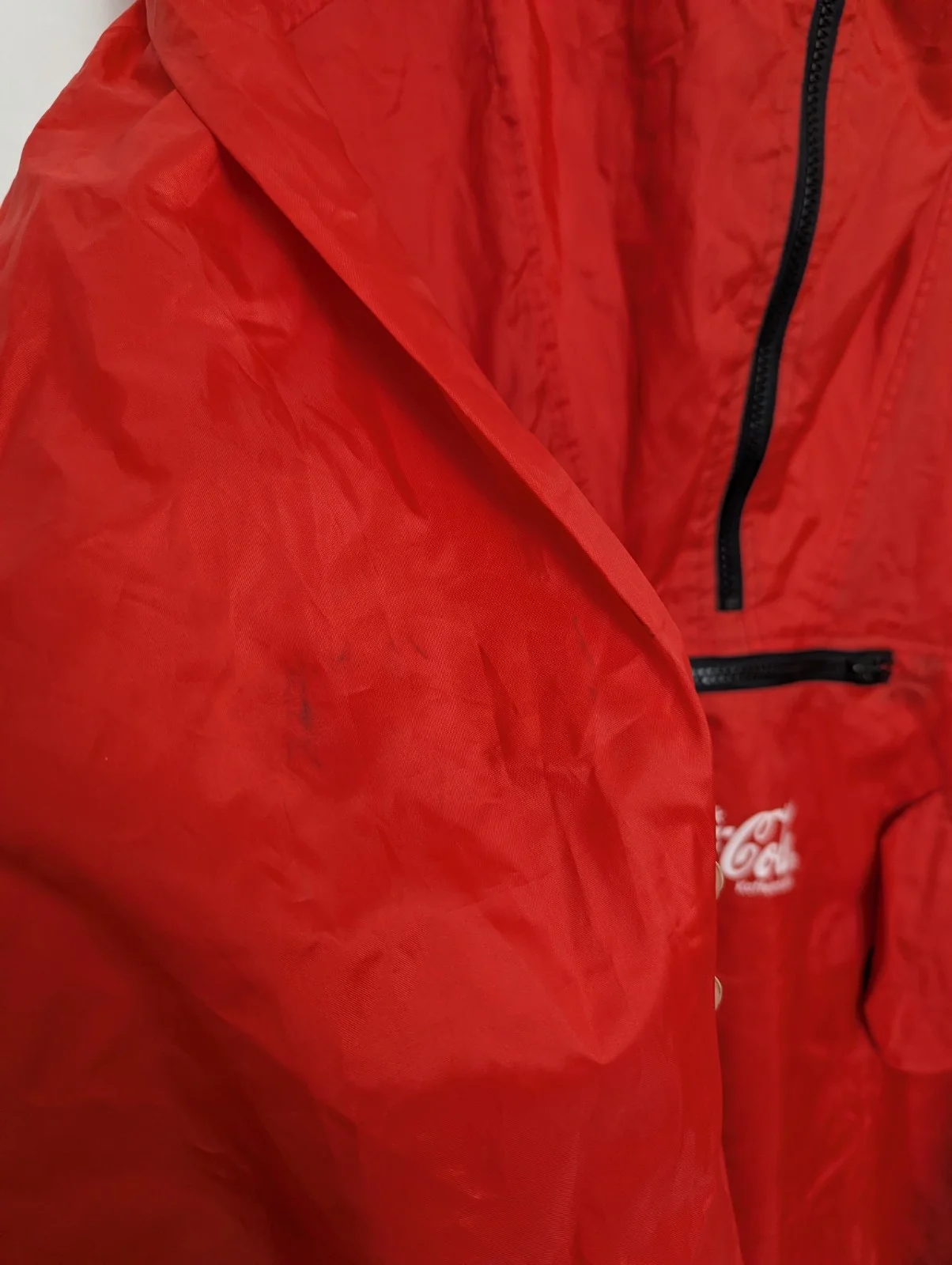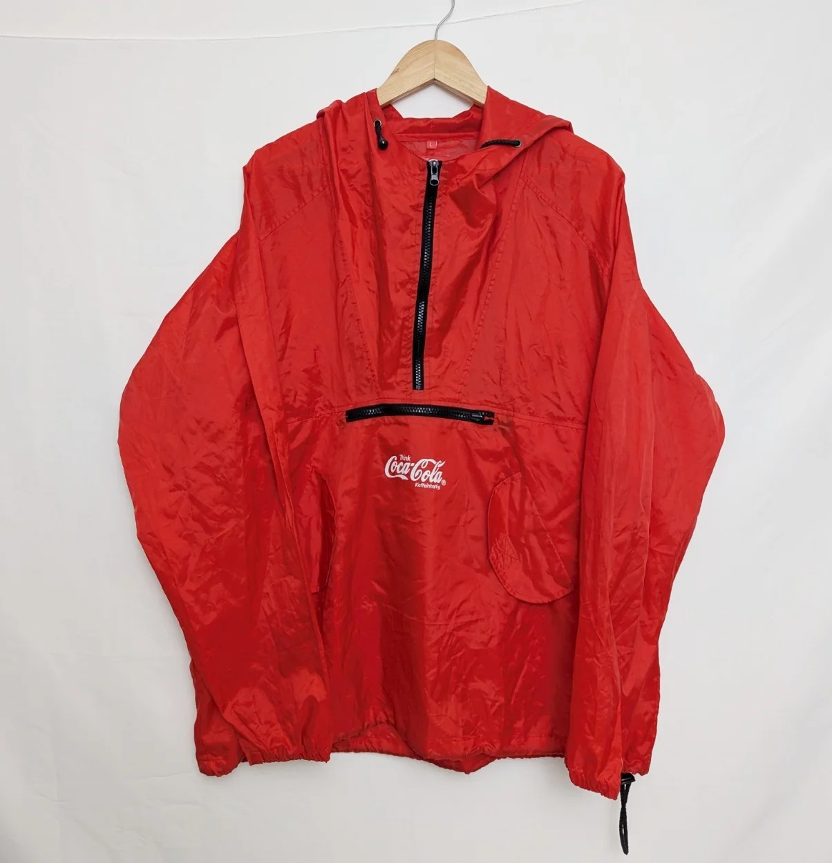 Vintage Coca-Cola promotional windbreaker with half-zip front, hood, and large printed graphics.