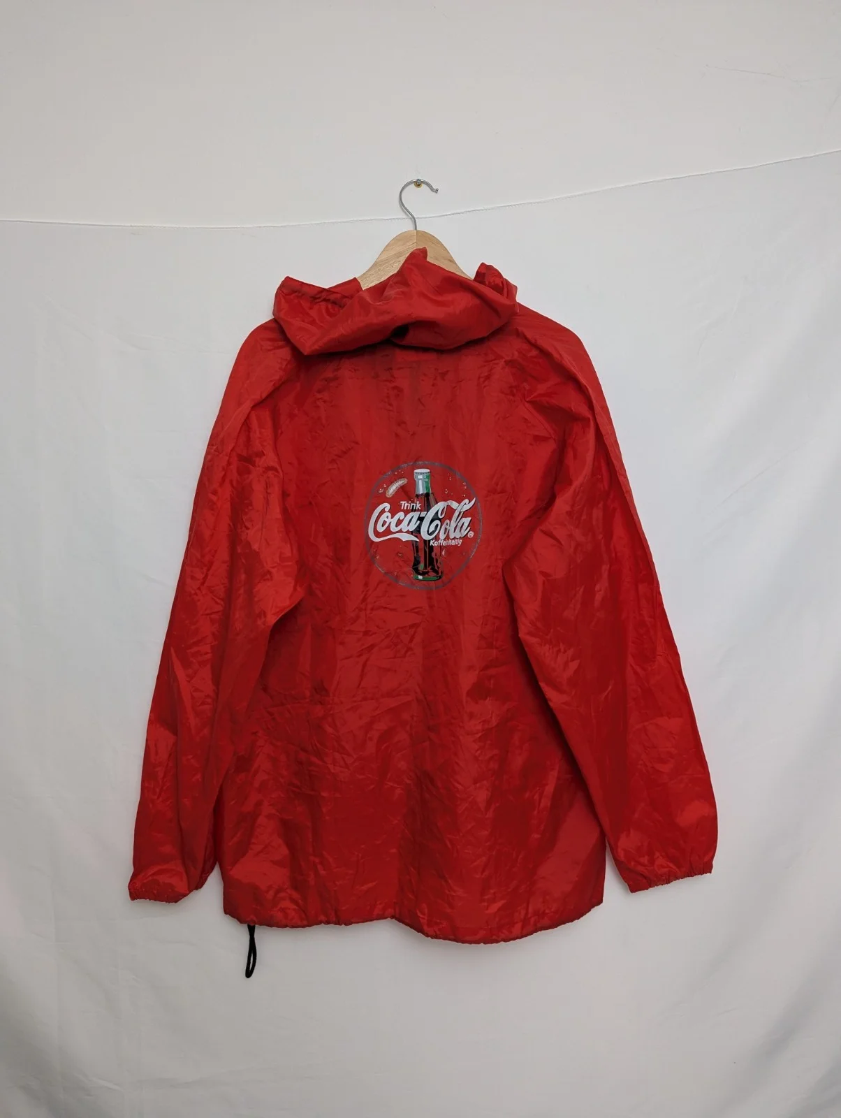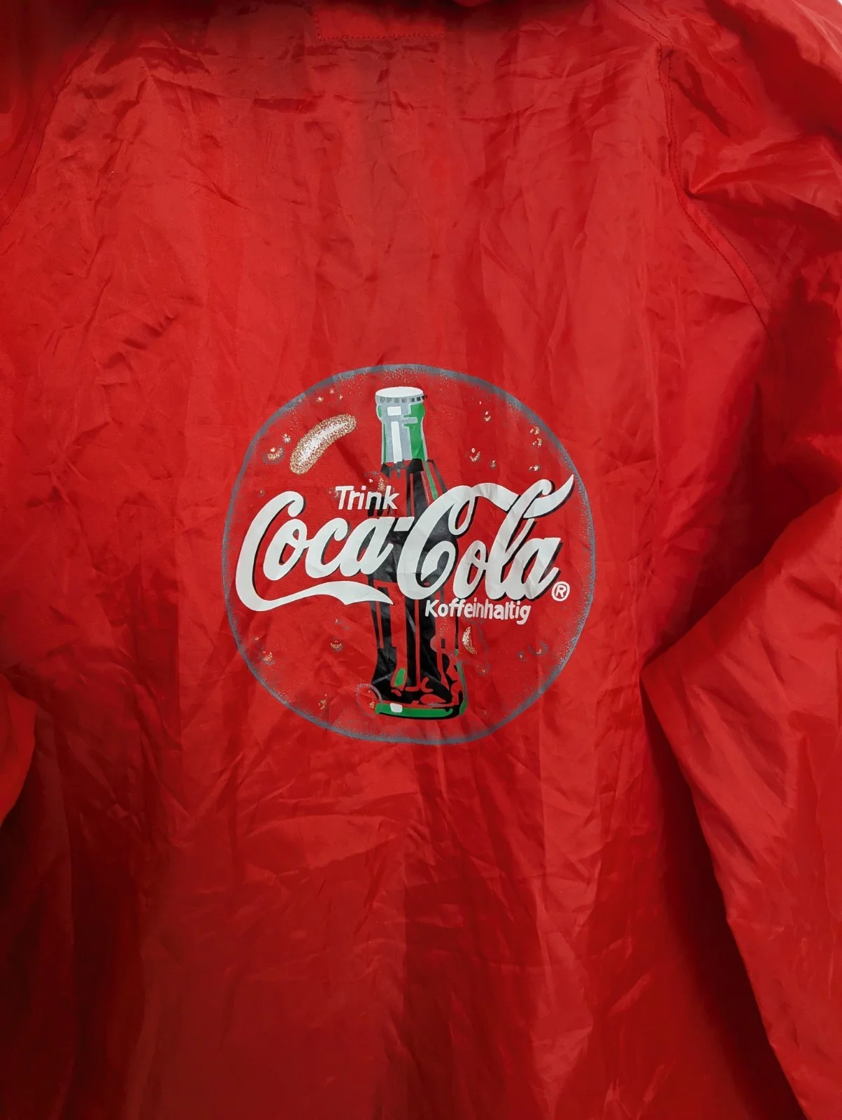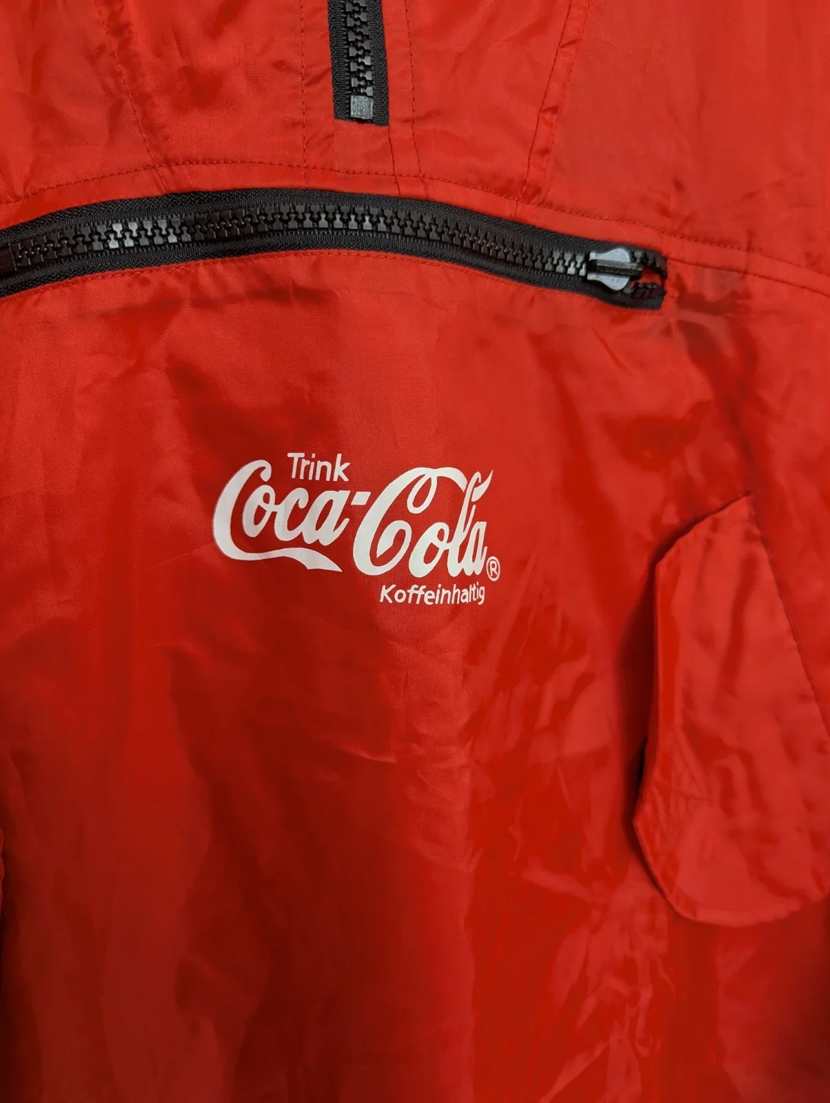 Lightweight nylon with front chest logo and a big classic Coke bottle graphic on the back. Features the German text “Trink Coca-Cola – Koffeinhaltig”, making it a unique European variant.