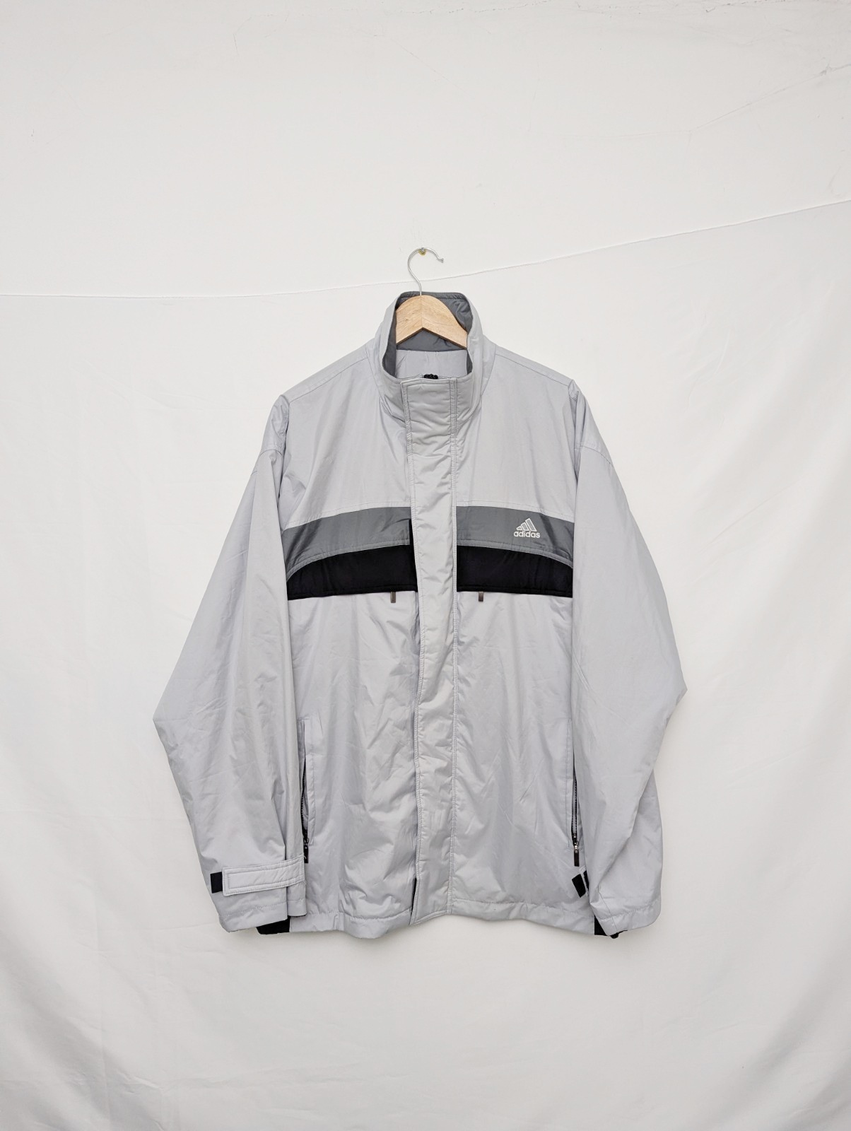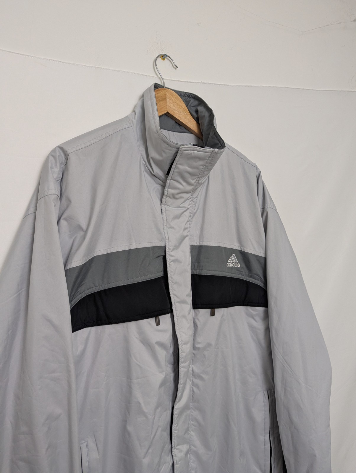 Authentic early 2000s Adidas men’s windbreaker jacket in a grey, dark grey and black colour-block design. Features an embroidered Adidas chest logo, full zip fastening and a fleece-lined interior, giving it a more substantial feel than a standard lightweight windbreaker. Classic early-2000s Adidas sportswear styling.