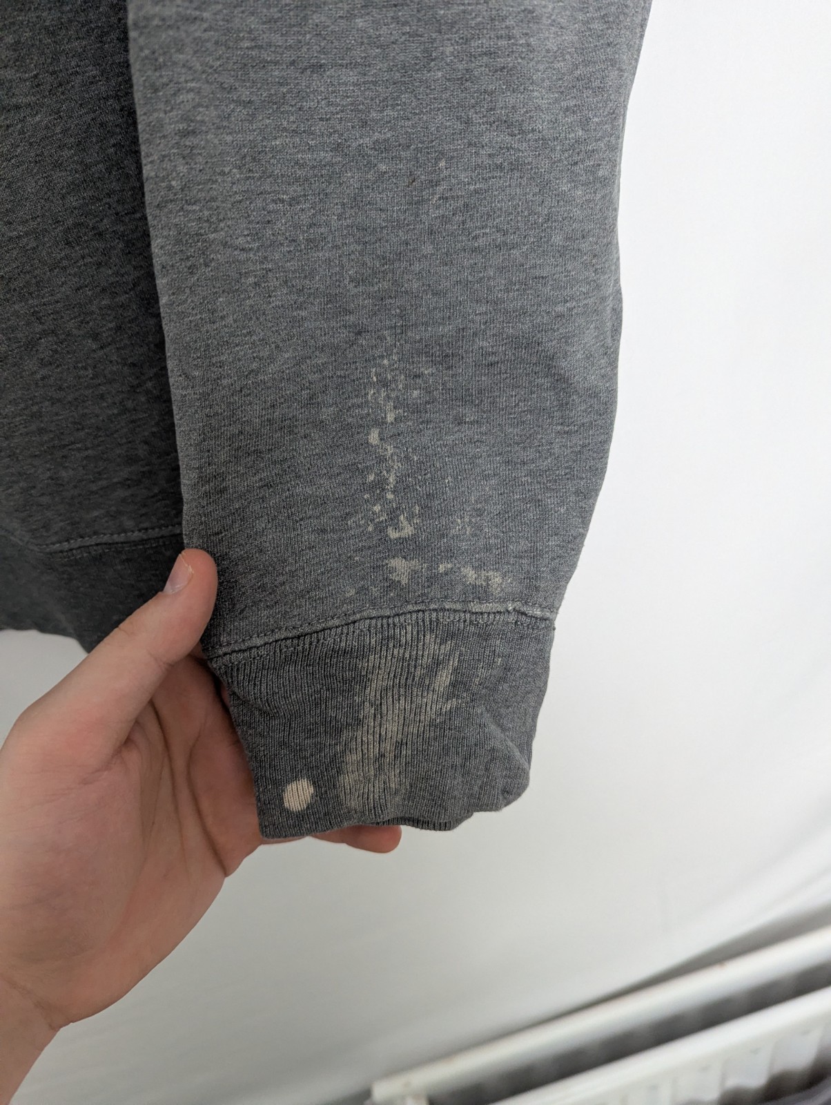 Condition: Satisfactory – visible bleach marks on the sleeve and some small marks on the front. All shown in photos. Priced accordingly.