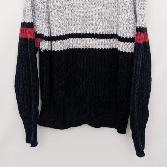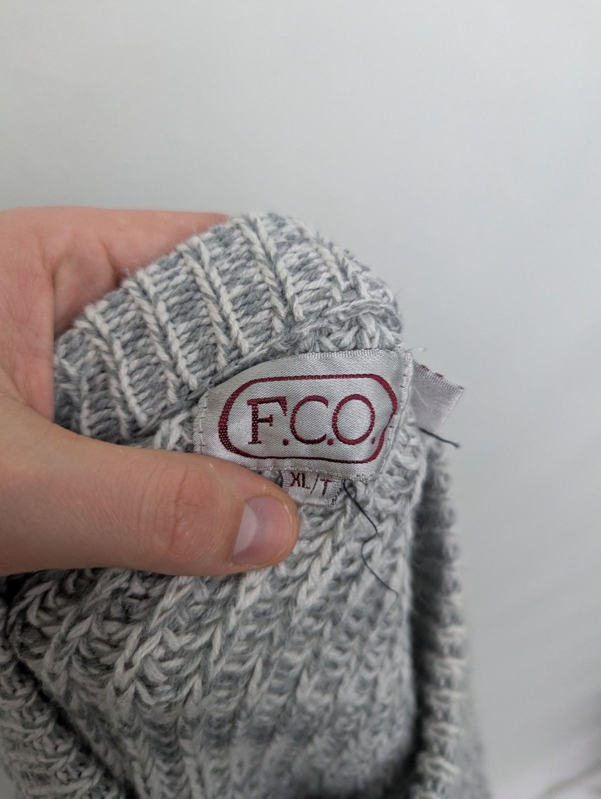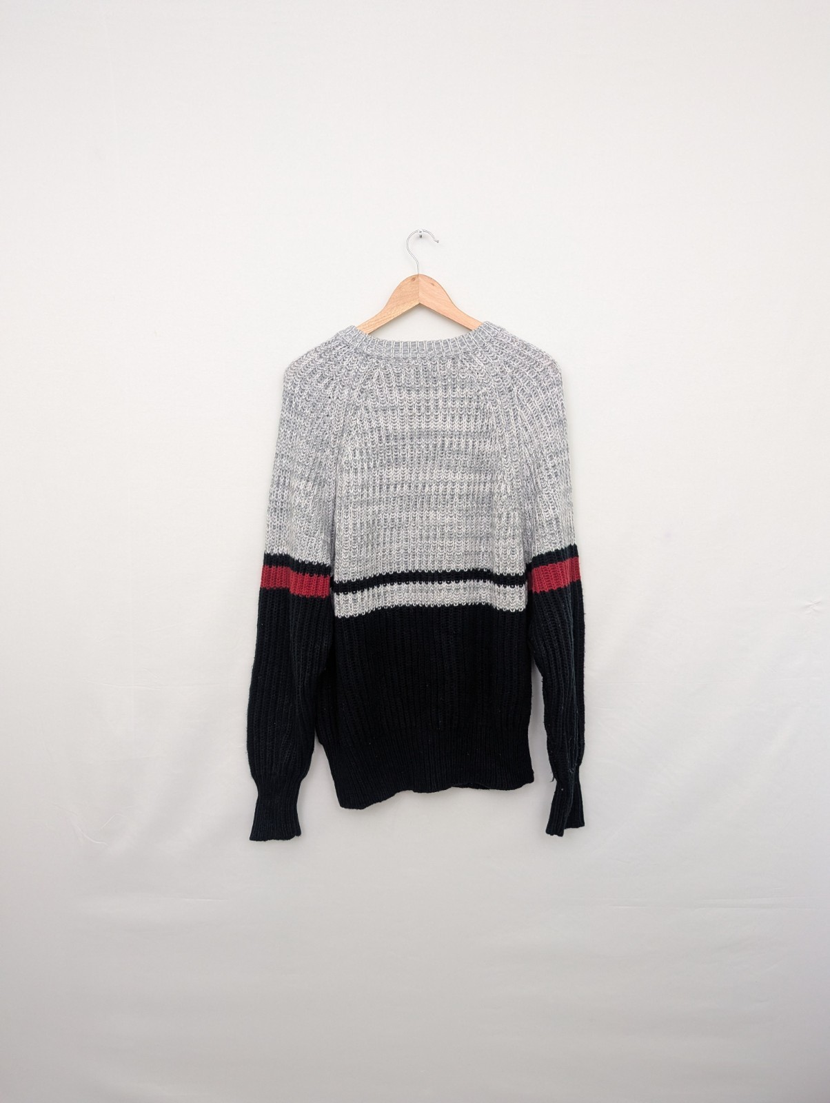 Vintage F.C.O knitted jumper featuring a grey marl upper with black and red stripe detailing and a contrasting black lower section. Chunky ribbed knit with a relaxed fit and classic crew neckline.