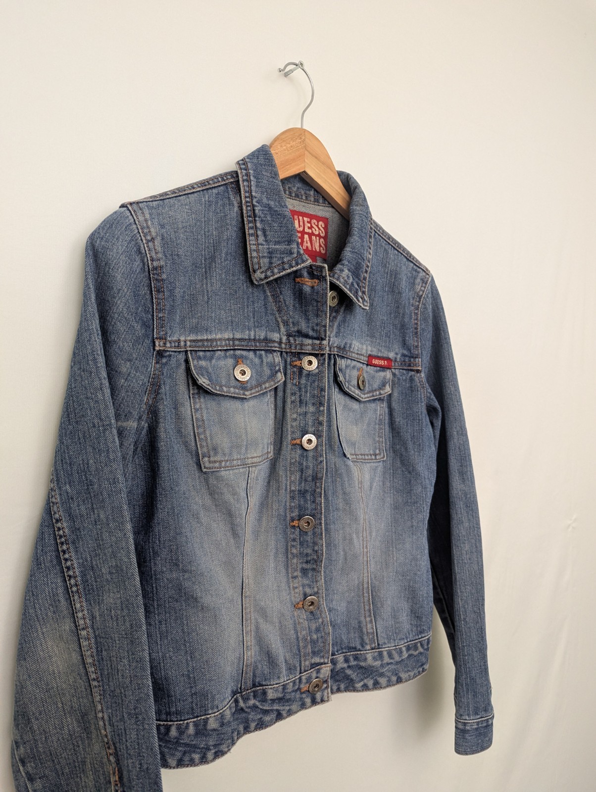 Authentic vintage Guess Jeans women’s denim jacket in a classic blue wash. Designed with a fitted, cropped silhouette, button-front fastening and signature GUESS red tab branding.