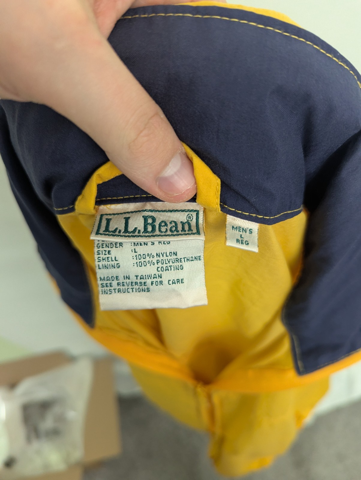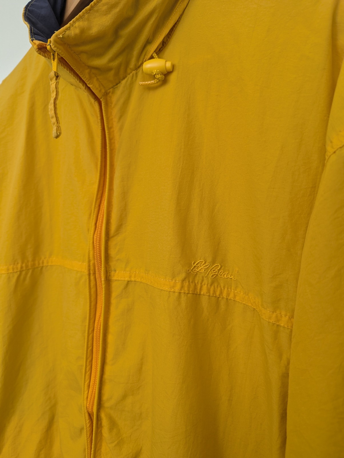 Authentic vintage L.L.Bean lightweight windbreaker featuring bright yellow outer with navy lining and concealed hood stored inside the collar.
