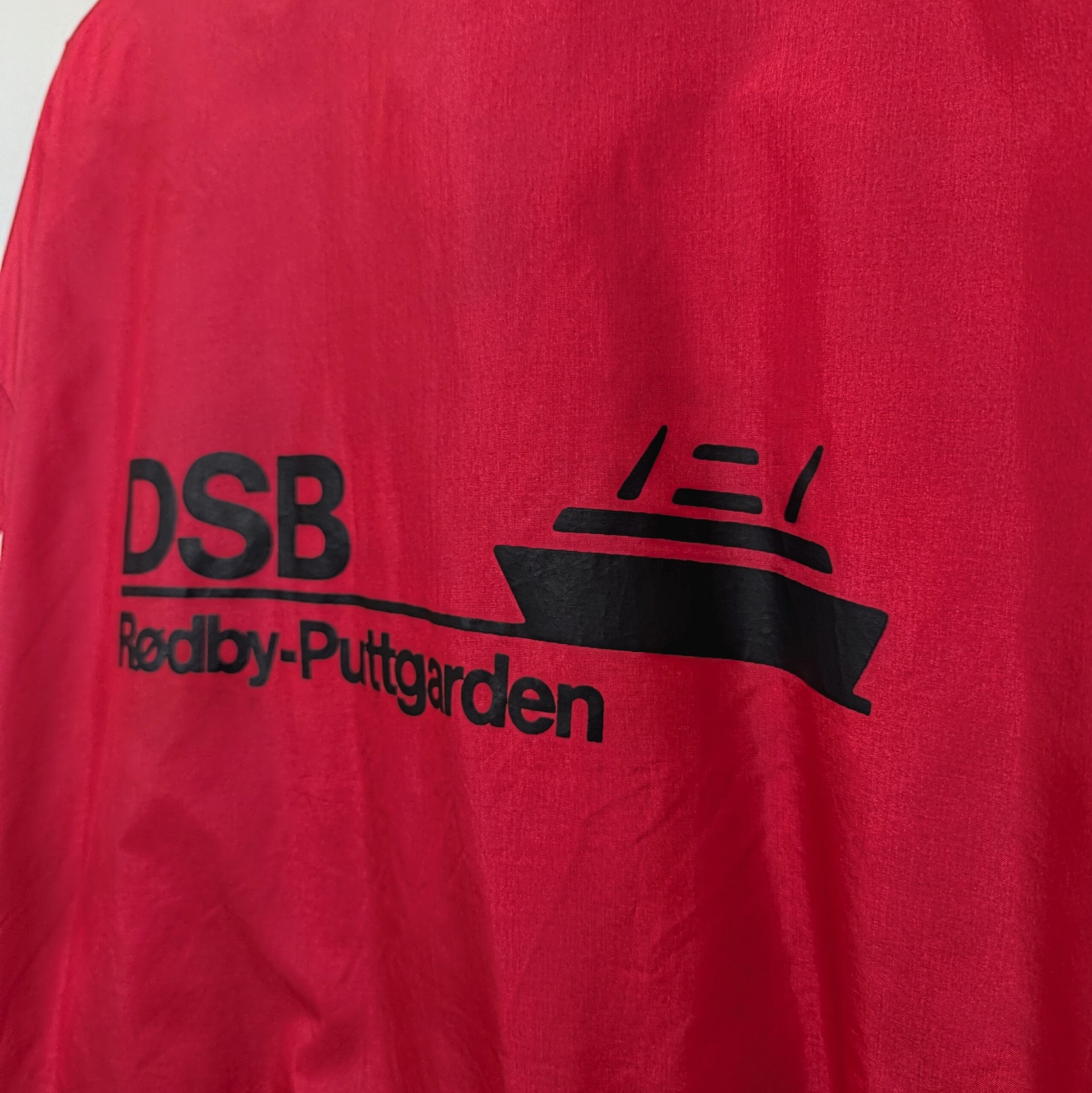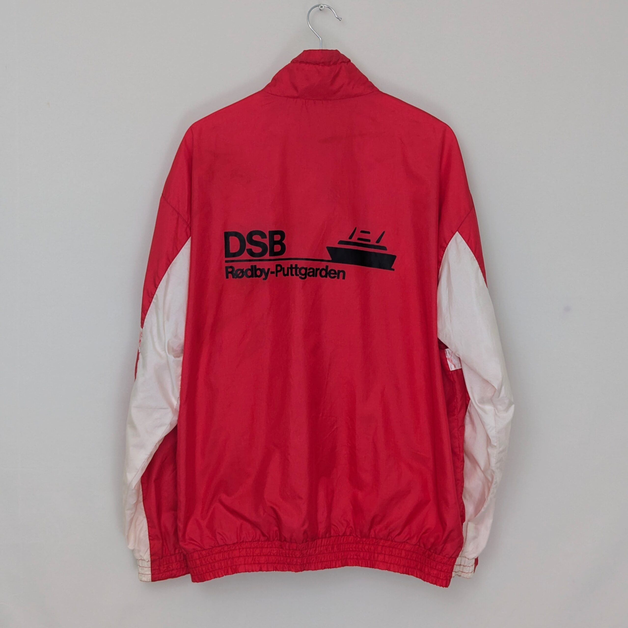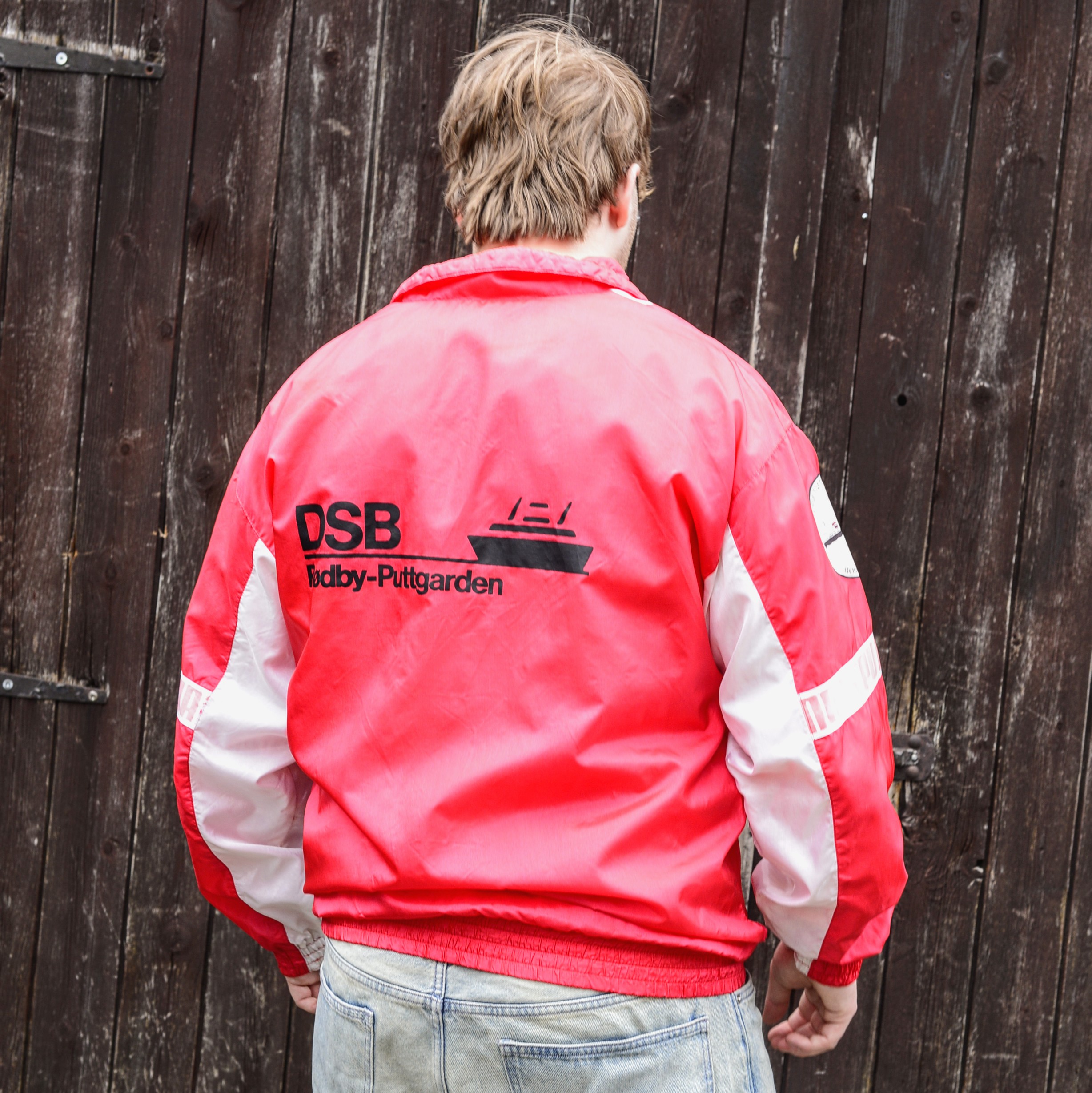 Vintage Puma jacket in a bold red and white colourway, featuring standout branding and a rare DSB Rødby–Puttgarden ferry graphic on the back.