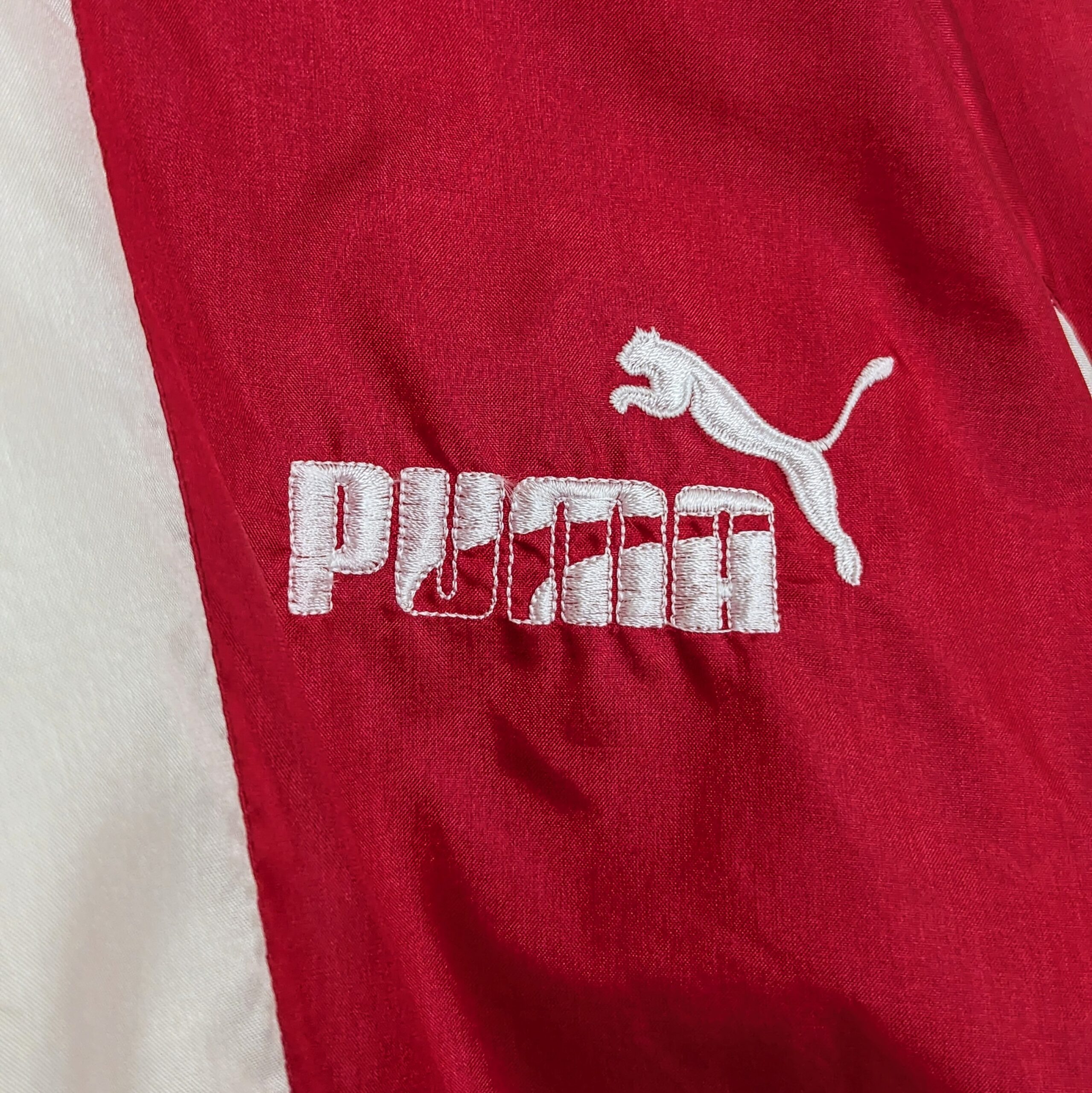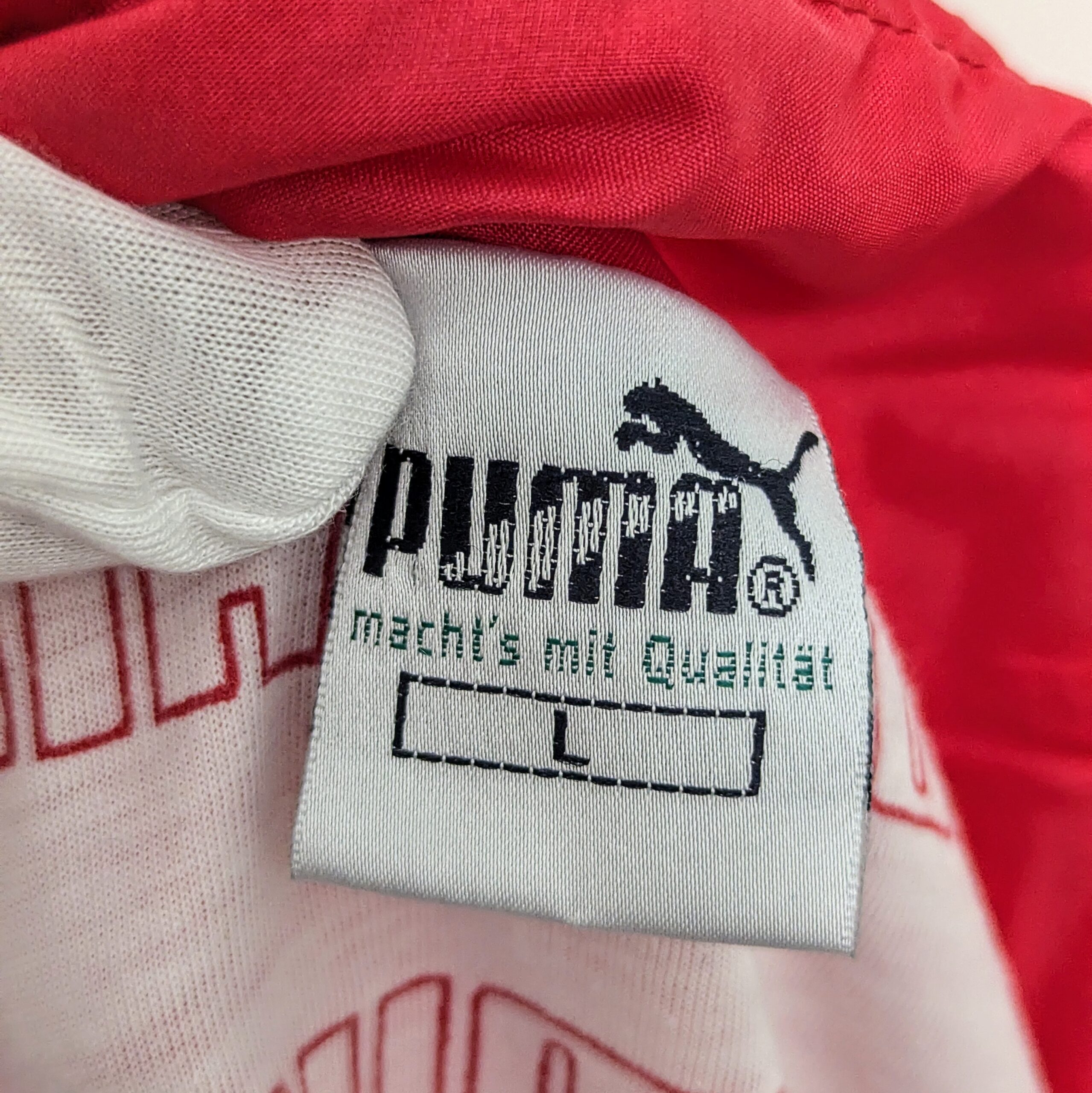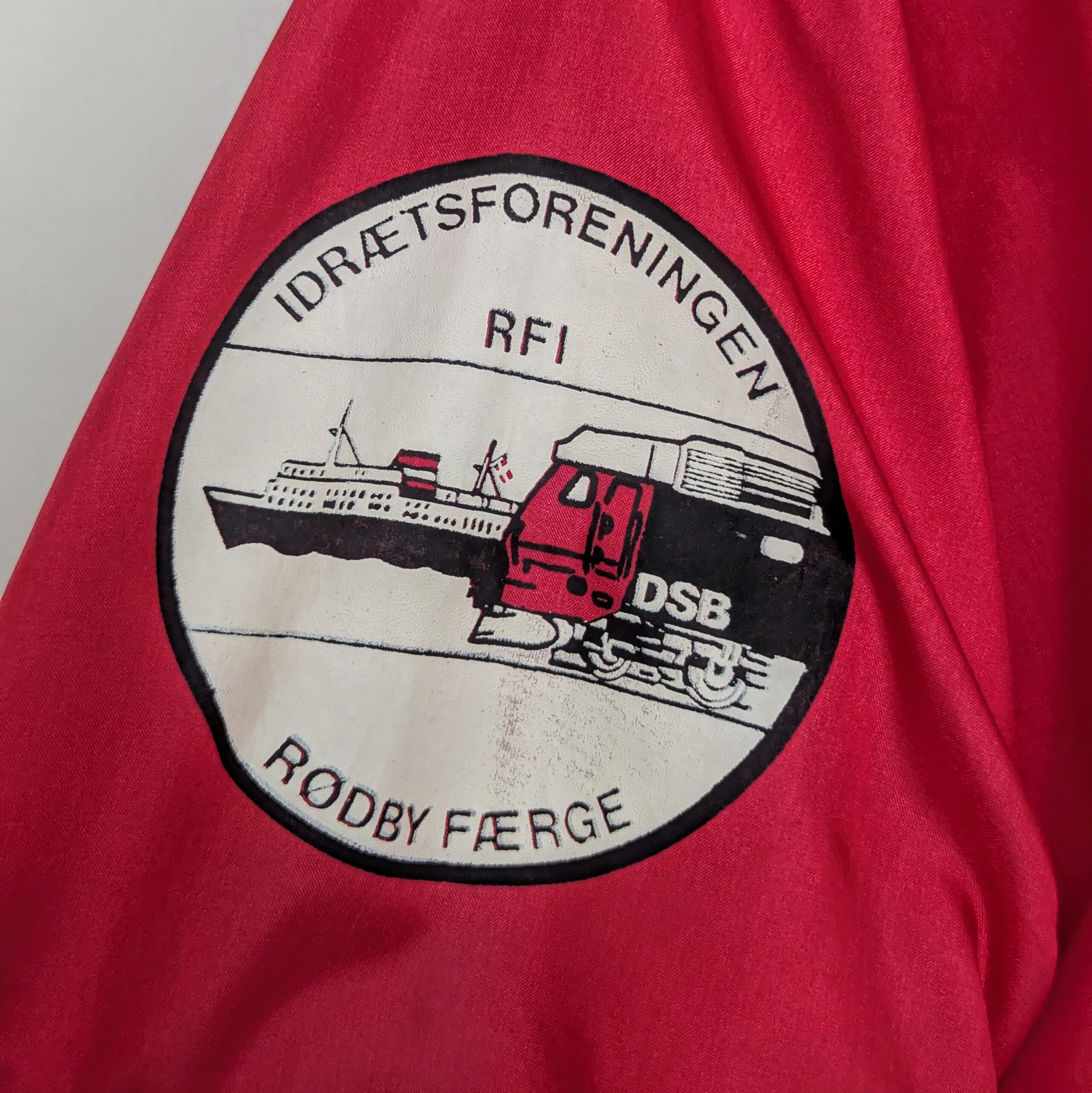 Vintage Puma jacket in a bold red and white colourway, featuring standout branding and a rare DSB Rødby–Puttgarden ferry graphic on the back.