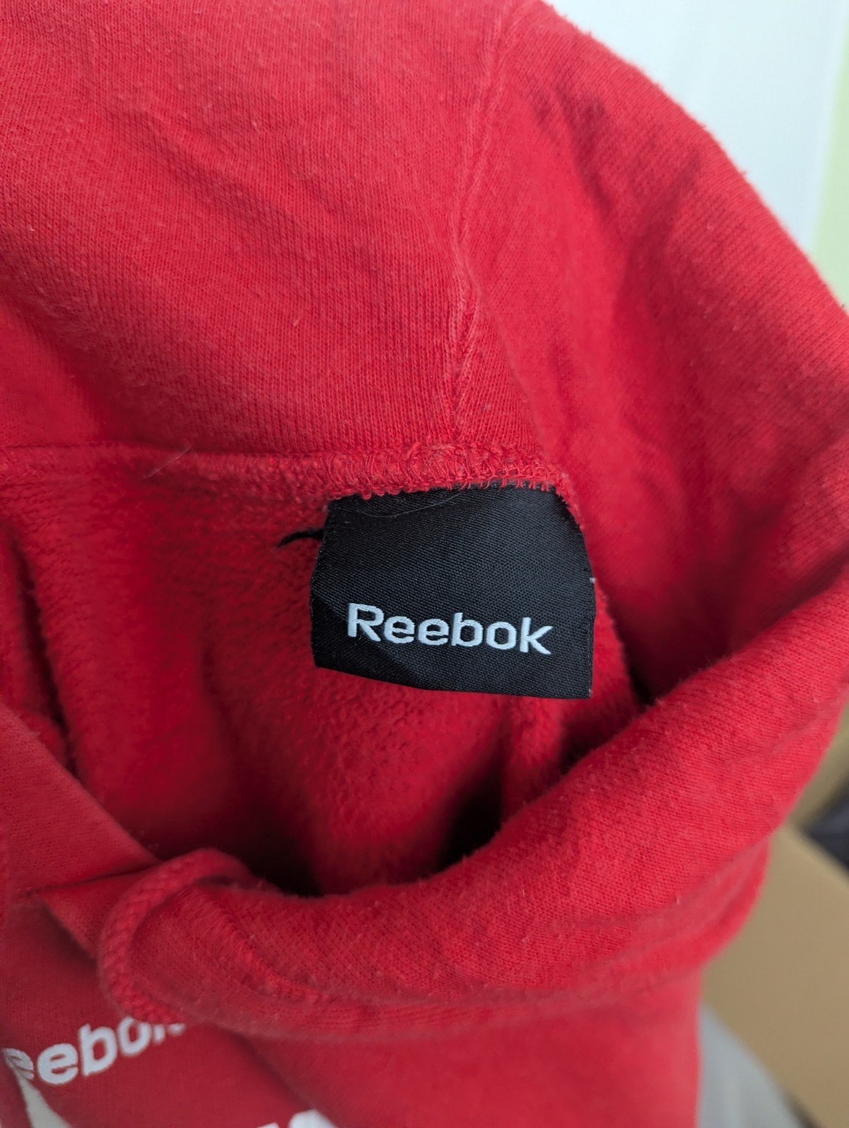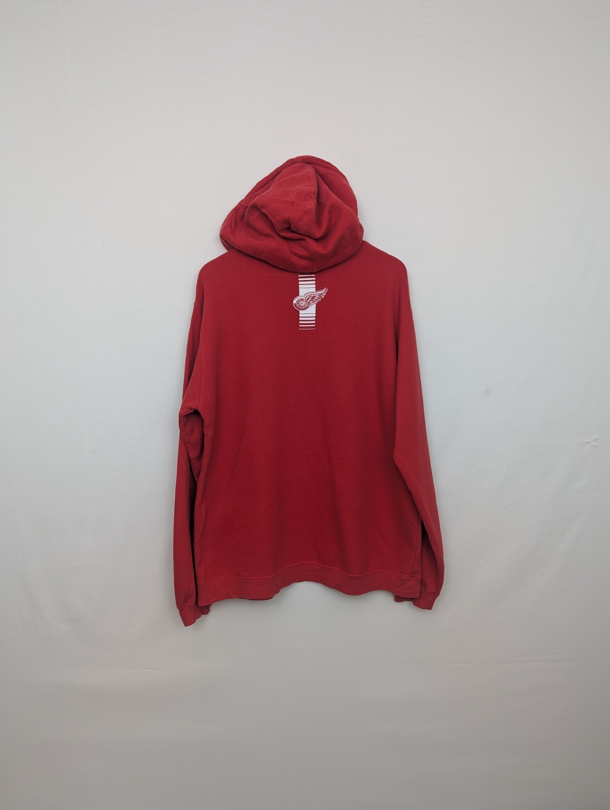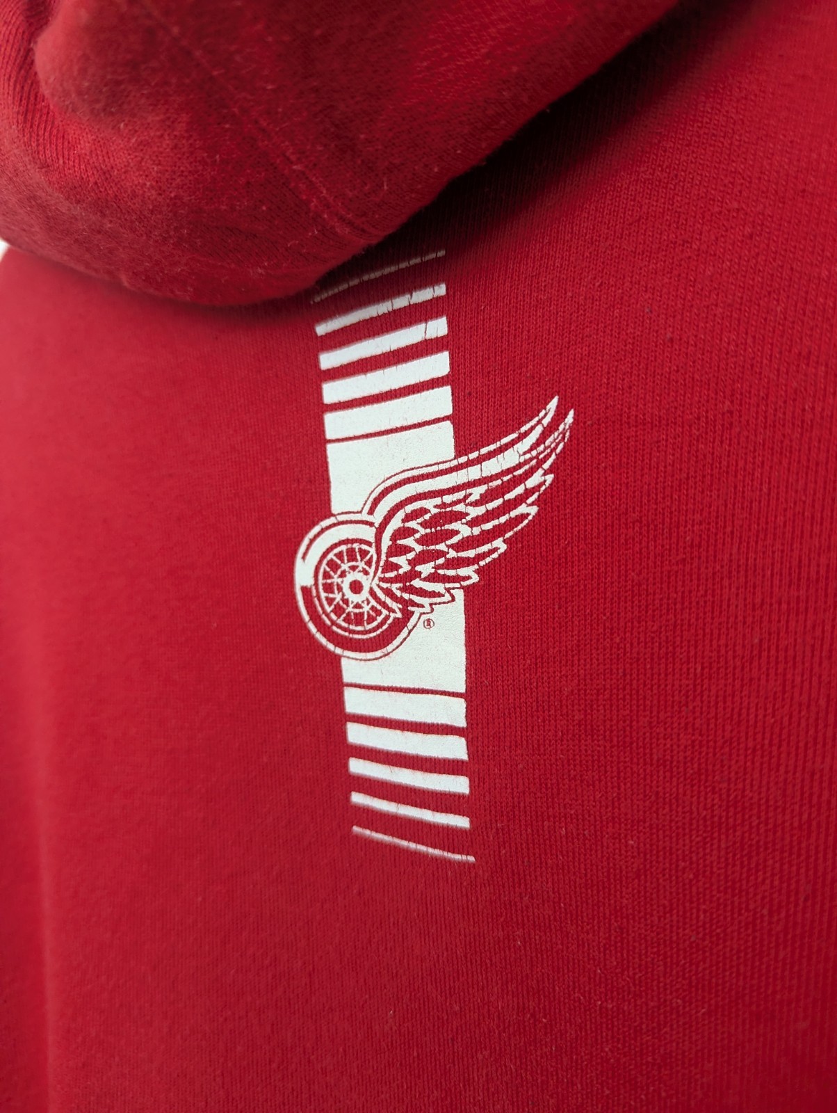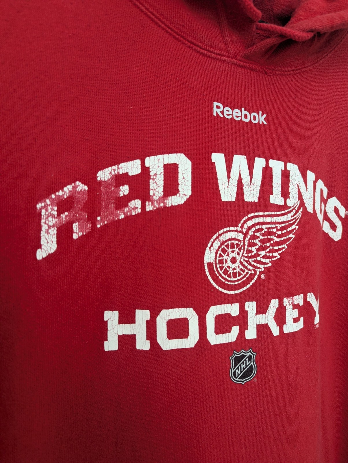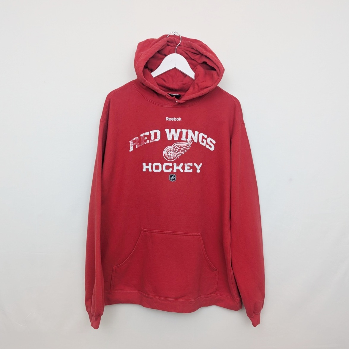 Men’s Detroit Red Wings NHL hoodie by Reebok in a red colourway. Features large front “Red Wings Hockey” graphic with cracked vintage-style print, embroidered Reebok logo at the chest, and NHL shield logo beneath. Rear features a vertical stripe graphic with the Red Wings winged wheel logo.