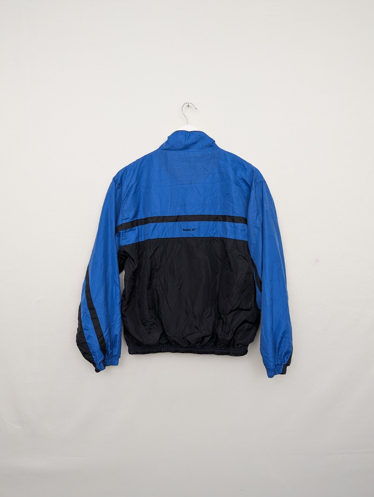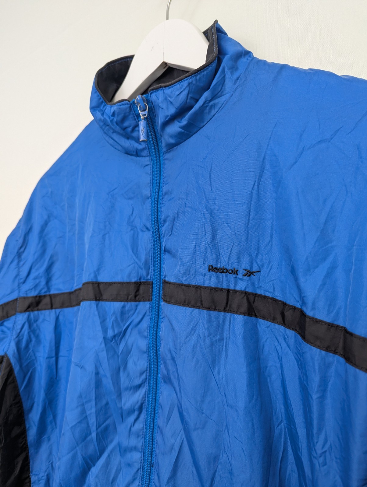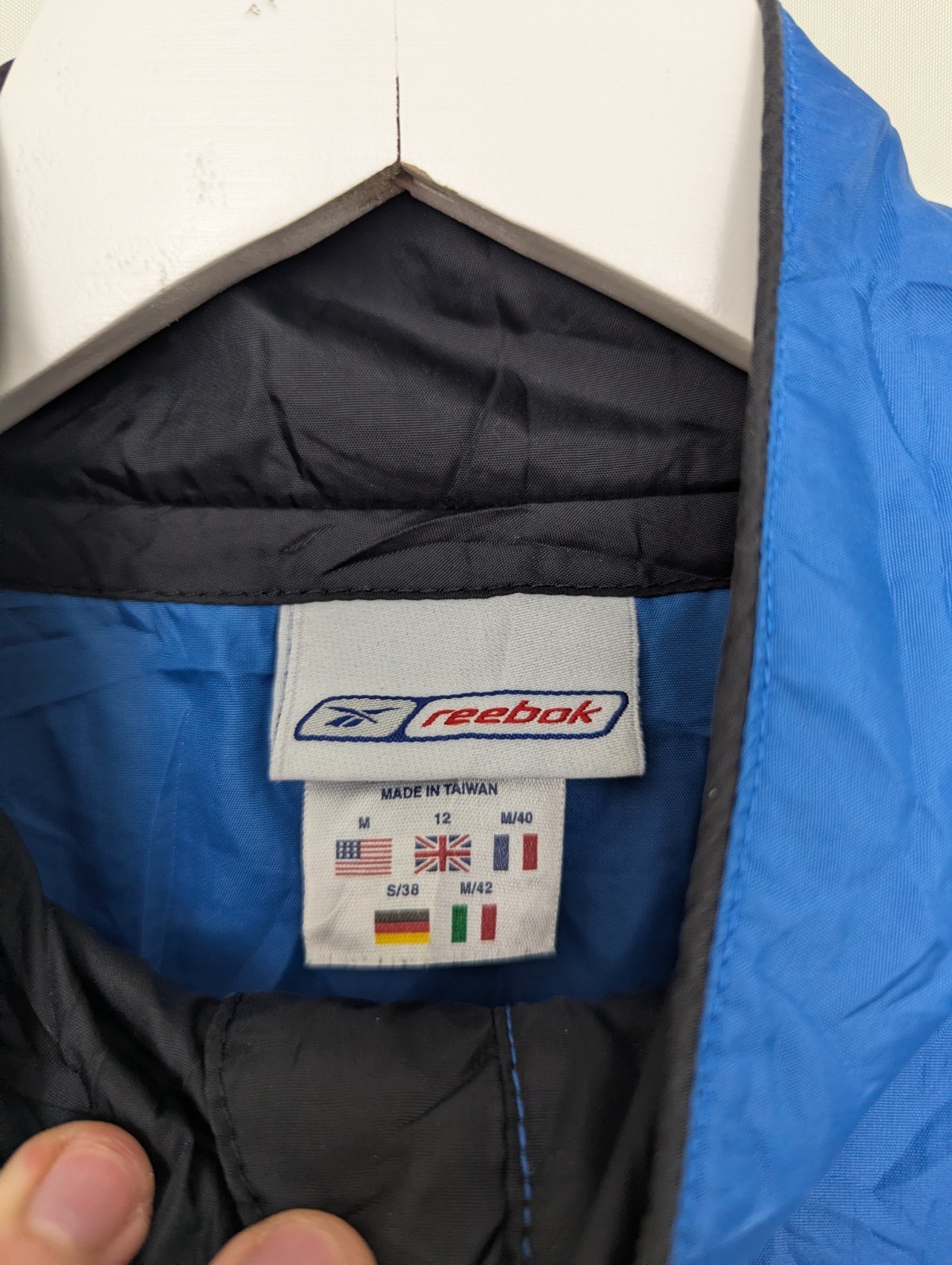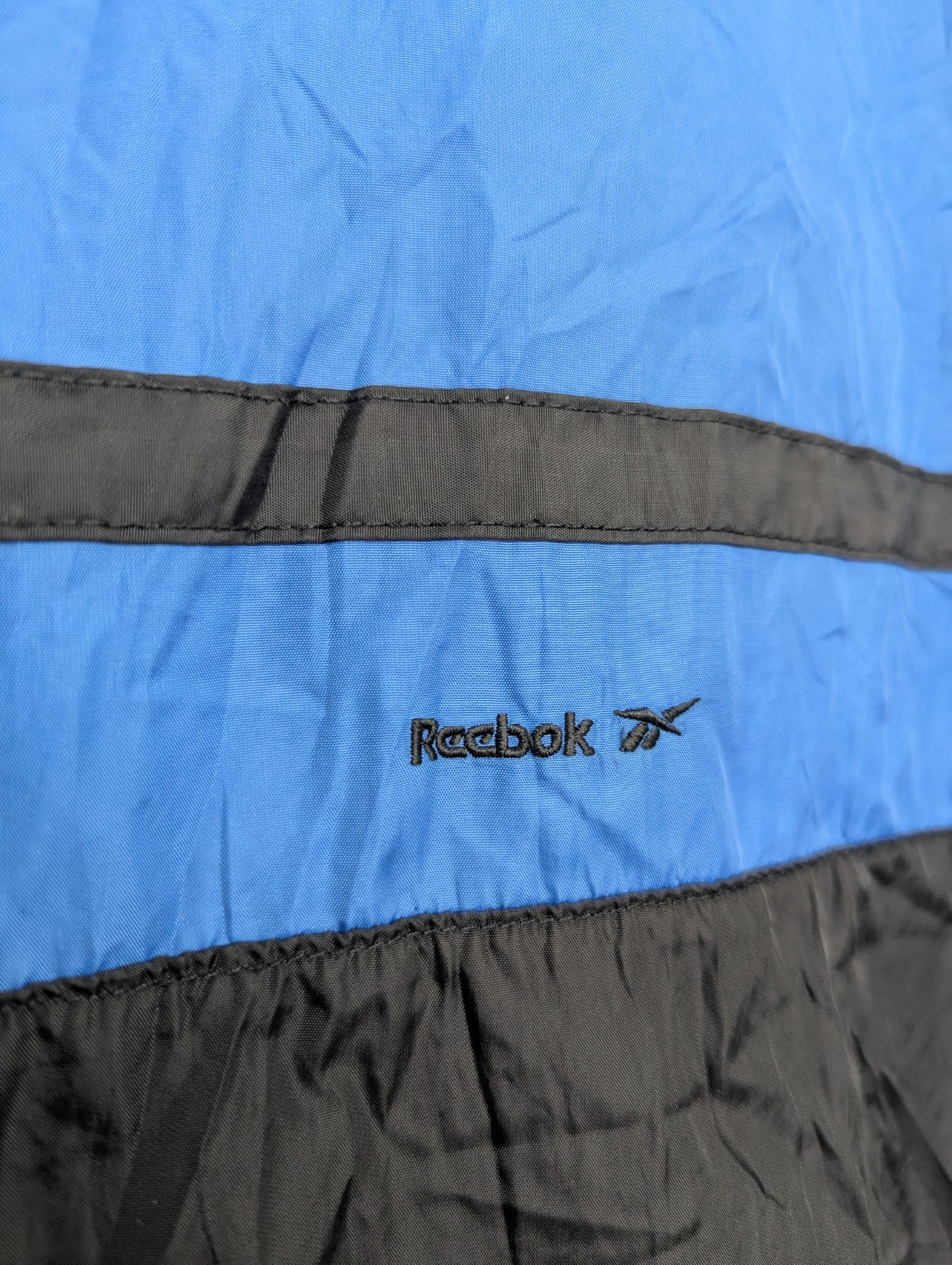 Authentic vintage Reebok windbreaker jacket featuring embroidered chest logo and classic blue and black colour block design.