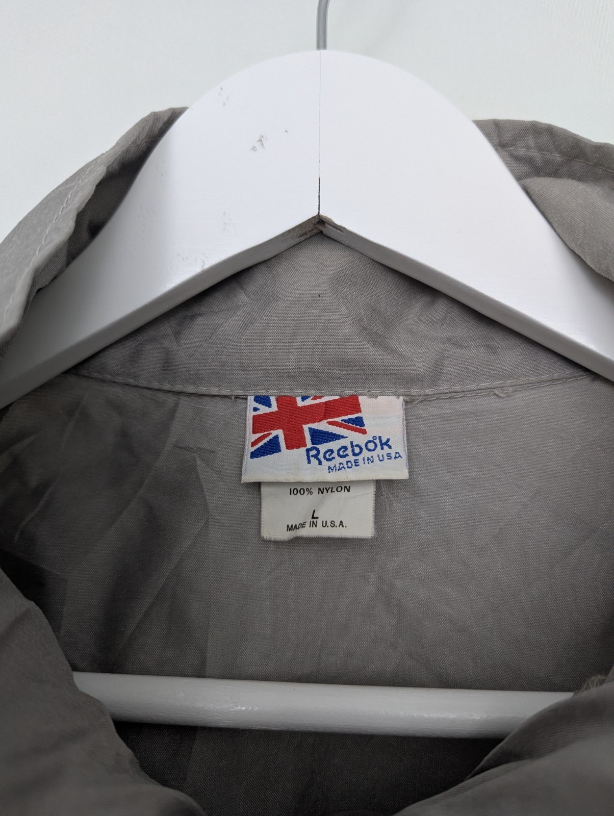 Vintage Reebok windbreaker jacket made in the USA featuring embroidered Reebok chest logo.